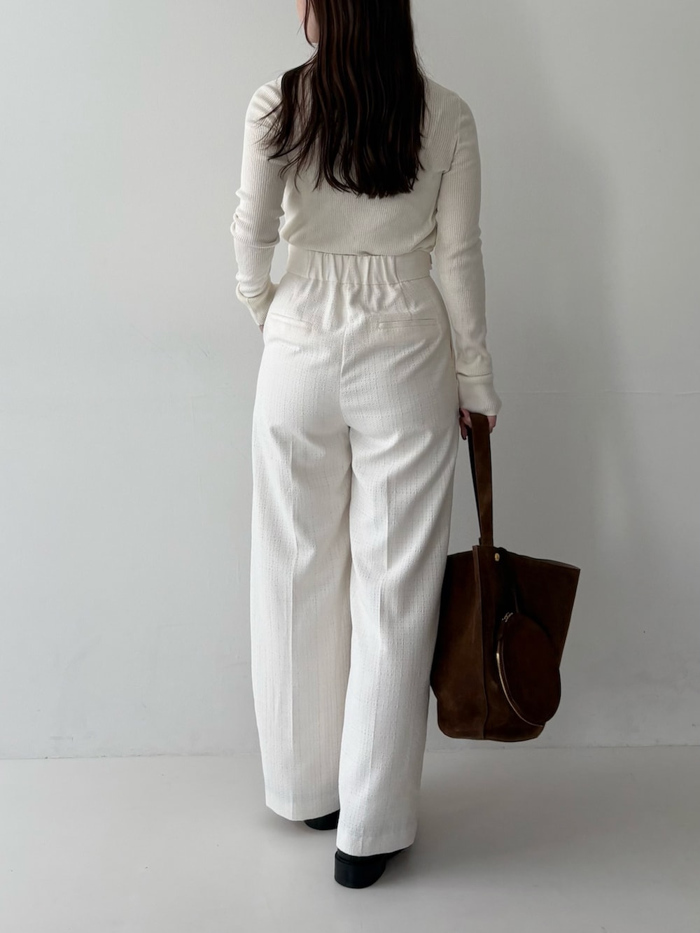 防シワ機能付きなのが嬉しいツイードパンツはスッキリ見えの美シルエット。