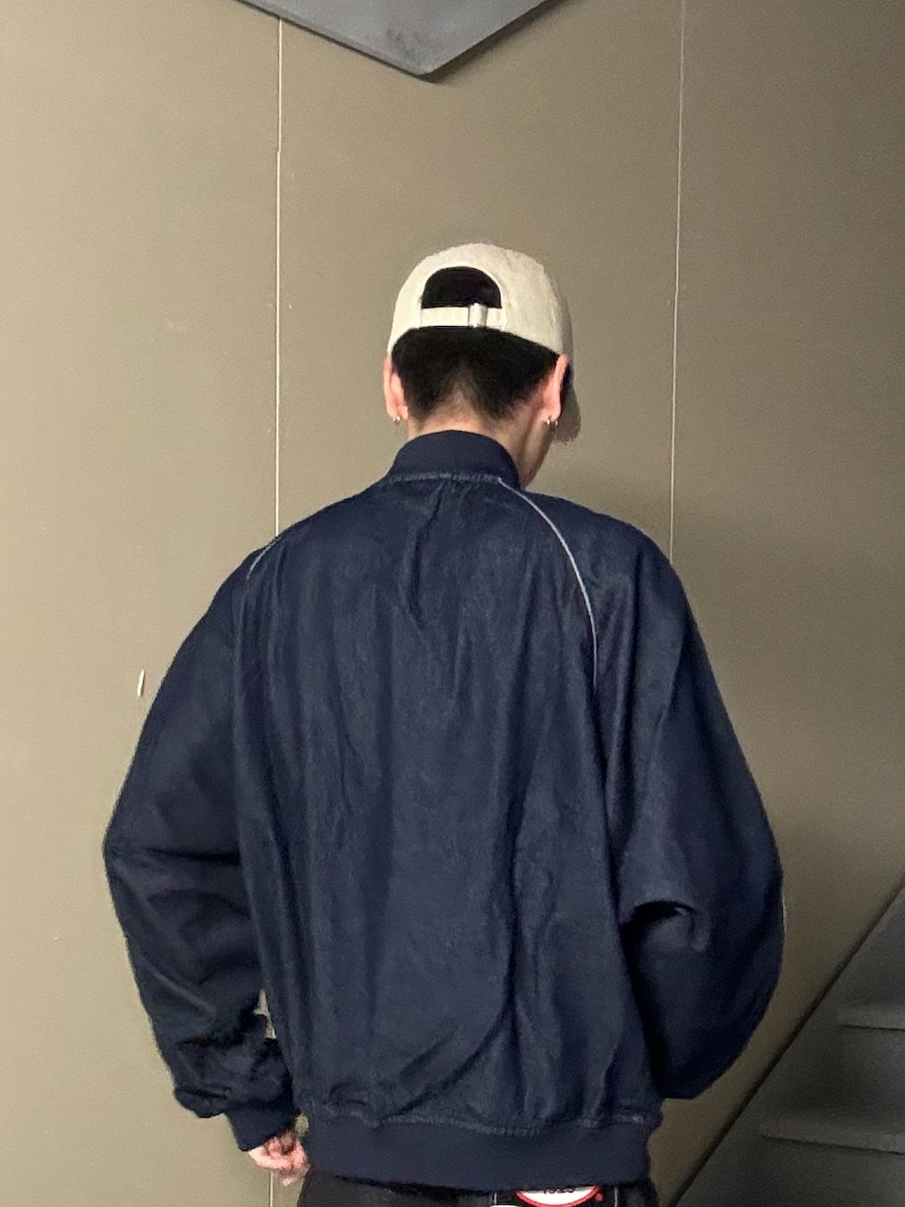 このコーデは、深みのあるネイビーのトラックジャケットを軸にした、スポーティでシックなスタイル。