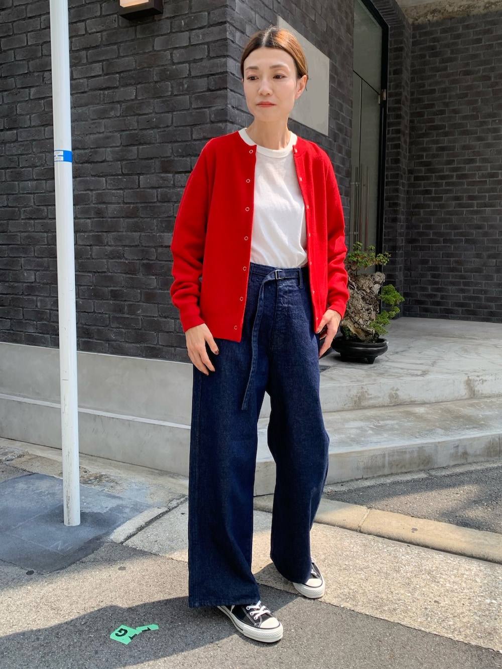 デニムは、ハイウェストに同素材のベルト付きですっきりとした印象でも着られます。