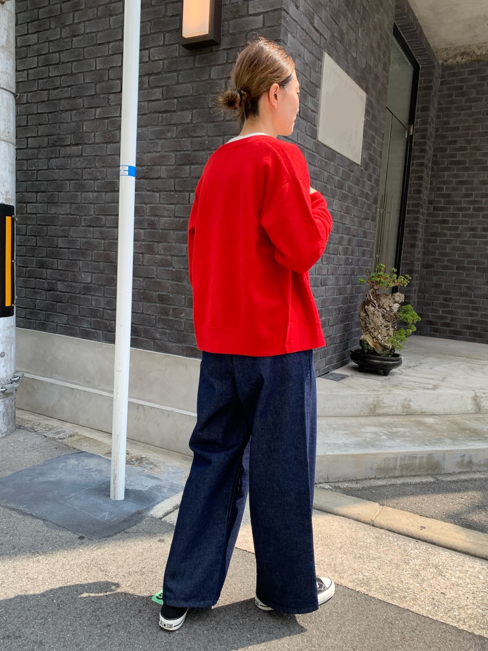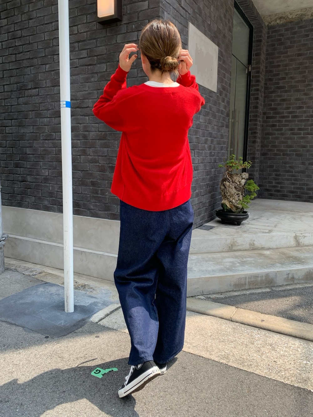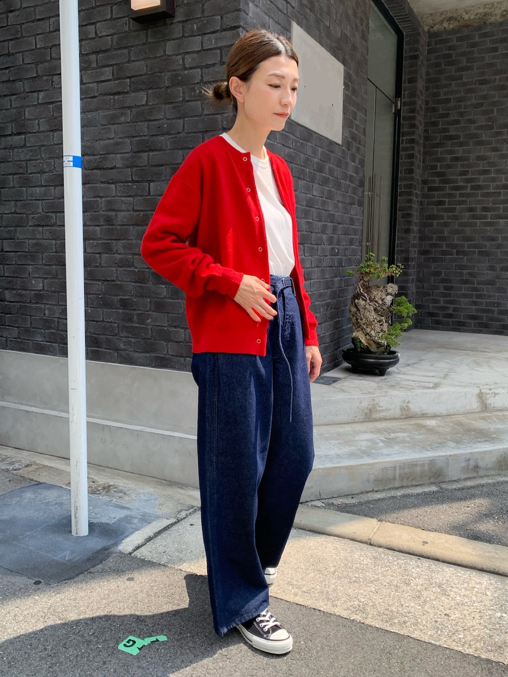 鮮やかな赤が目を引く、ミラノリブクルーネックカーディガン。程よく厚さがあるので寒くなるこれからの時期におすすめ◎