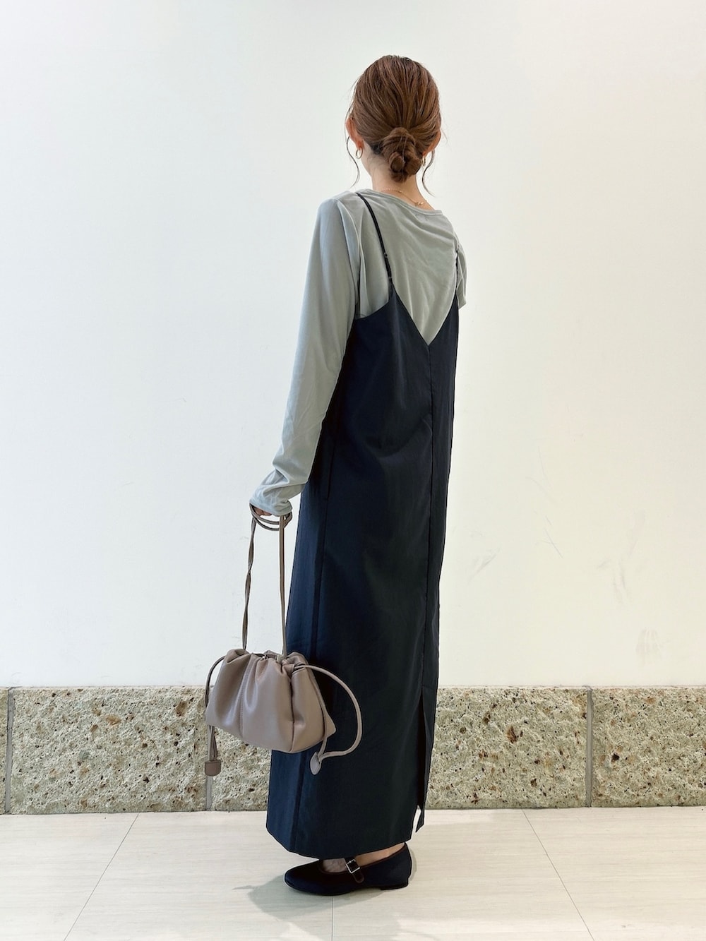 キャミワンピは肩紐で長さを変えられるので、