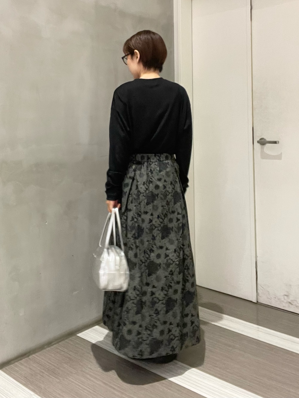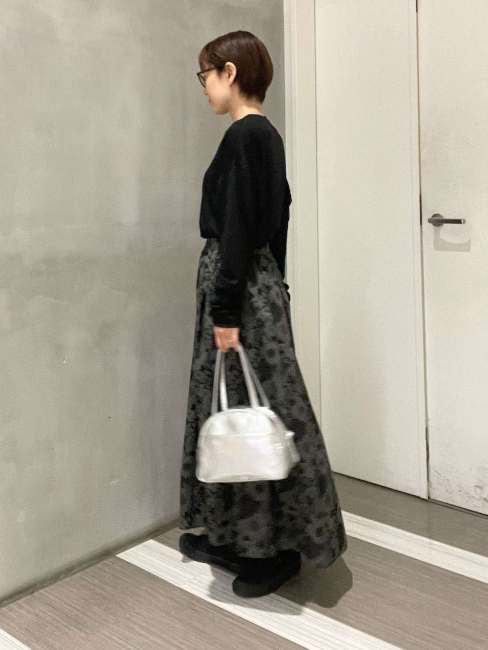 シルバーのレザーボストンバッグを合わせ大人コーデに。