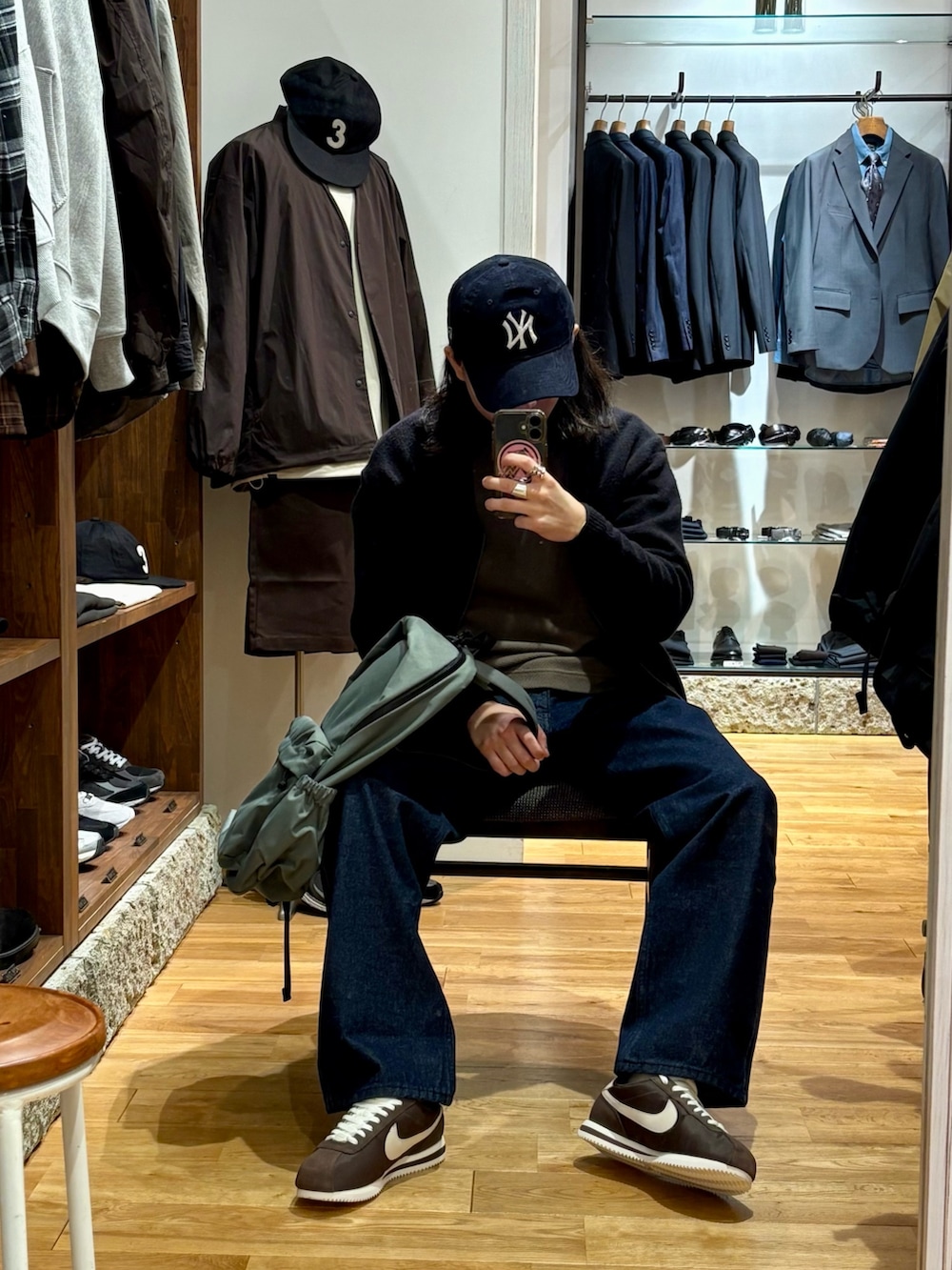 暗めのトーンをニット生地やブラウンで爽やかに、バックやキャップで差し色を入れこなれ感を出しましょう。