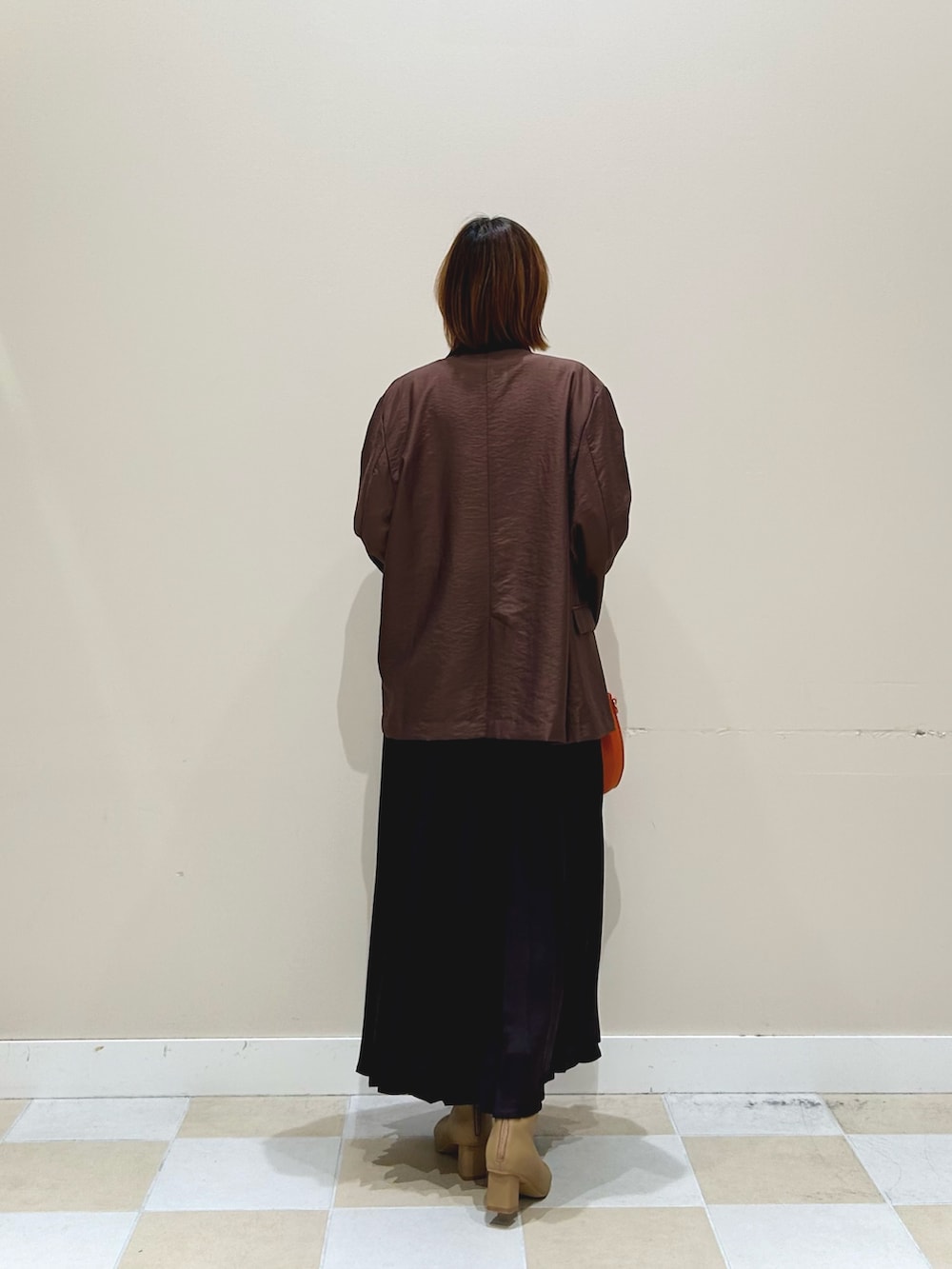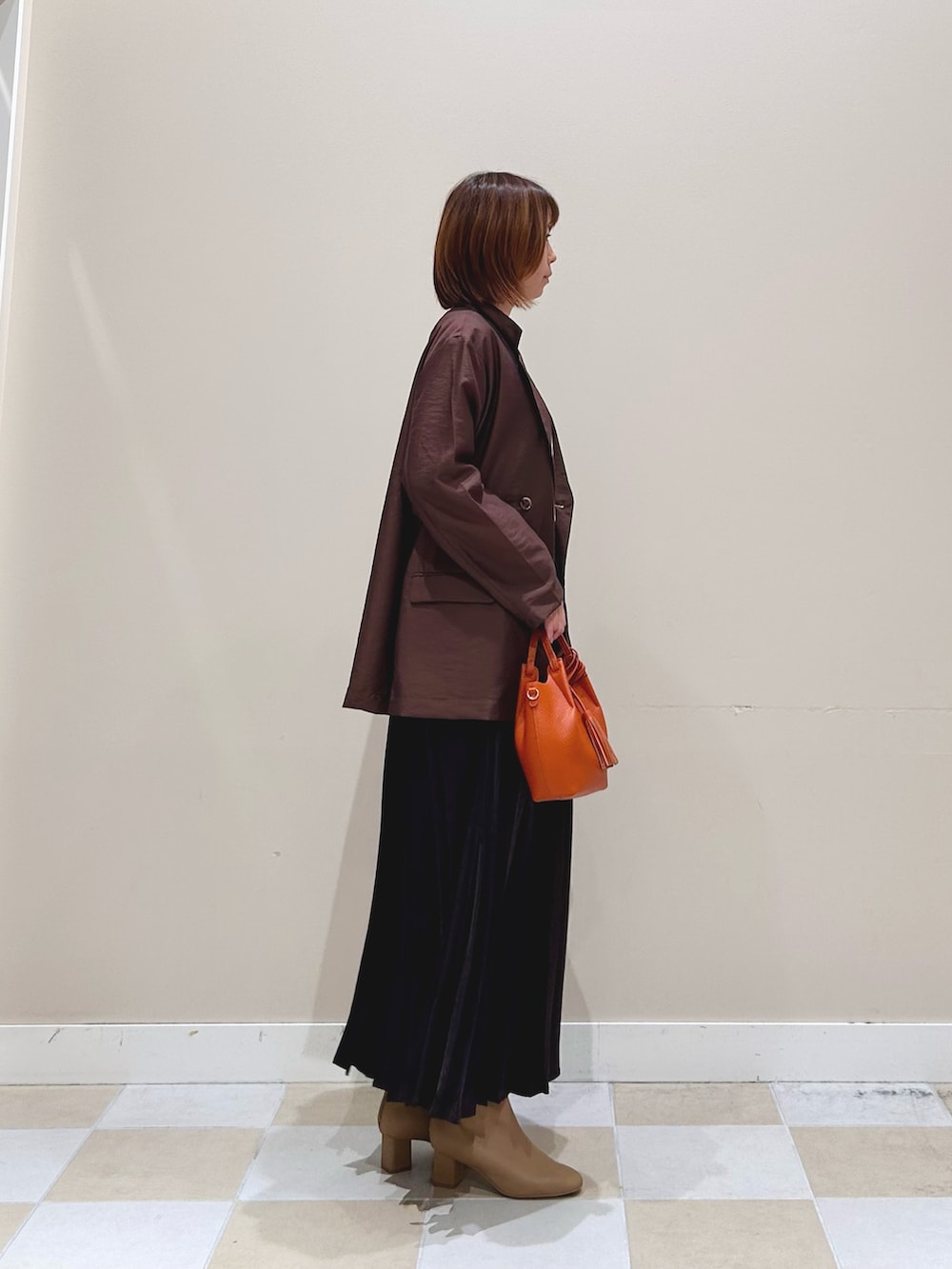 ブラウンのシアージャケットを薄手カットソーとプリーツスカート、ブーツでお出掛けにおすすめのコーディネートです!