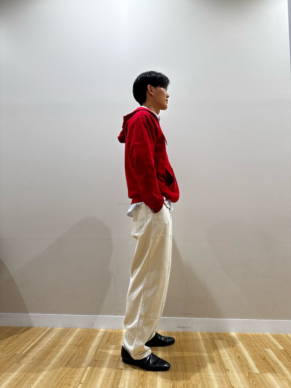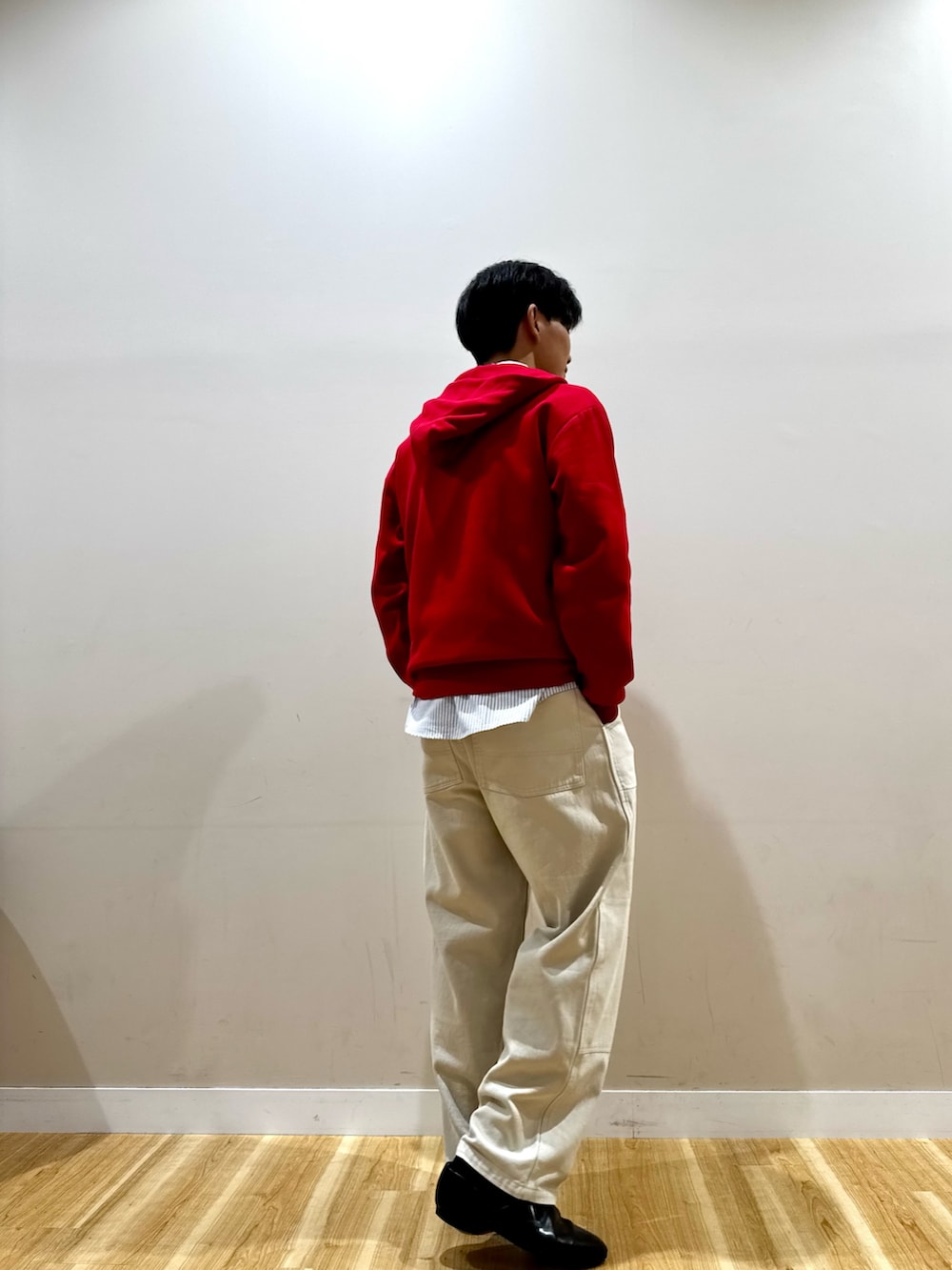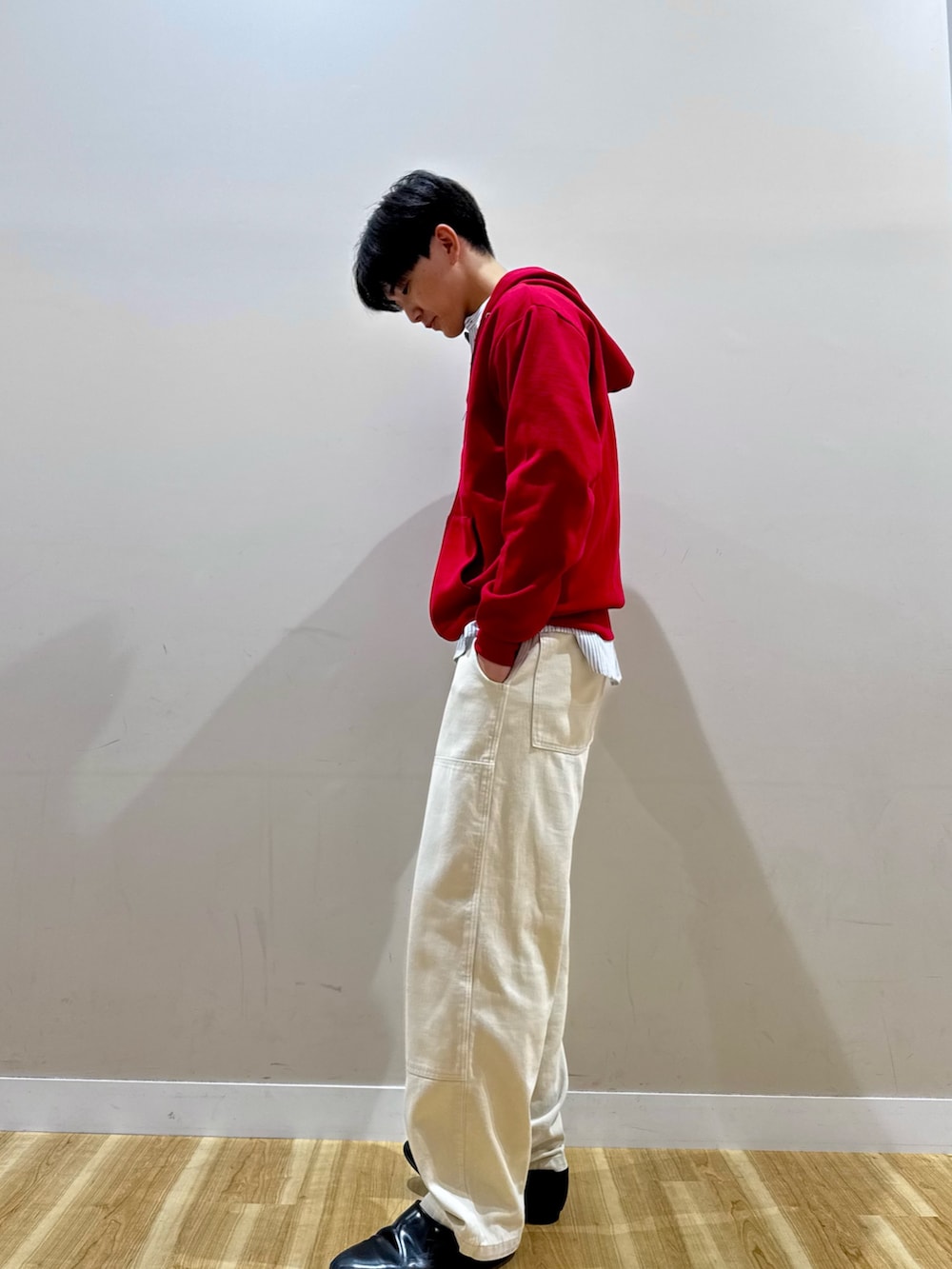 ジップパーカーの中にシャツをレイヤードすることによってストリートに綺麗さを組み込むことができます。パンツはゆとりのあるアイボリーのワイドパンツを履いて、配色的にもコントラスト映えするクリーンなコーデです。