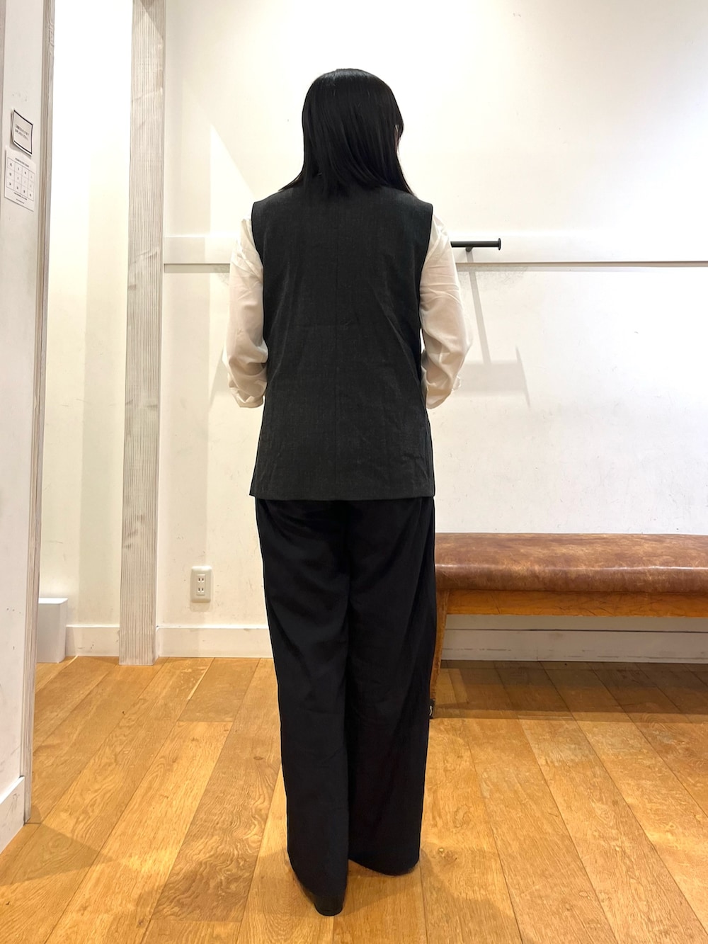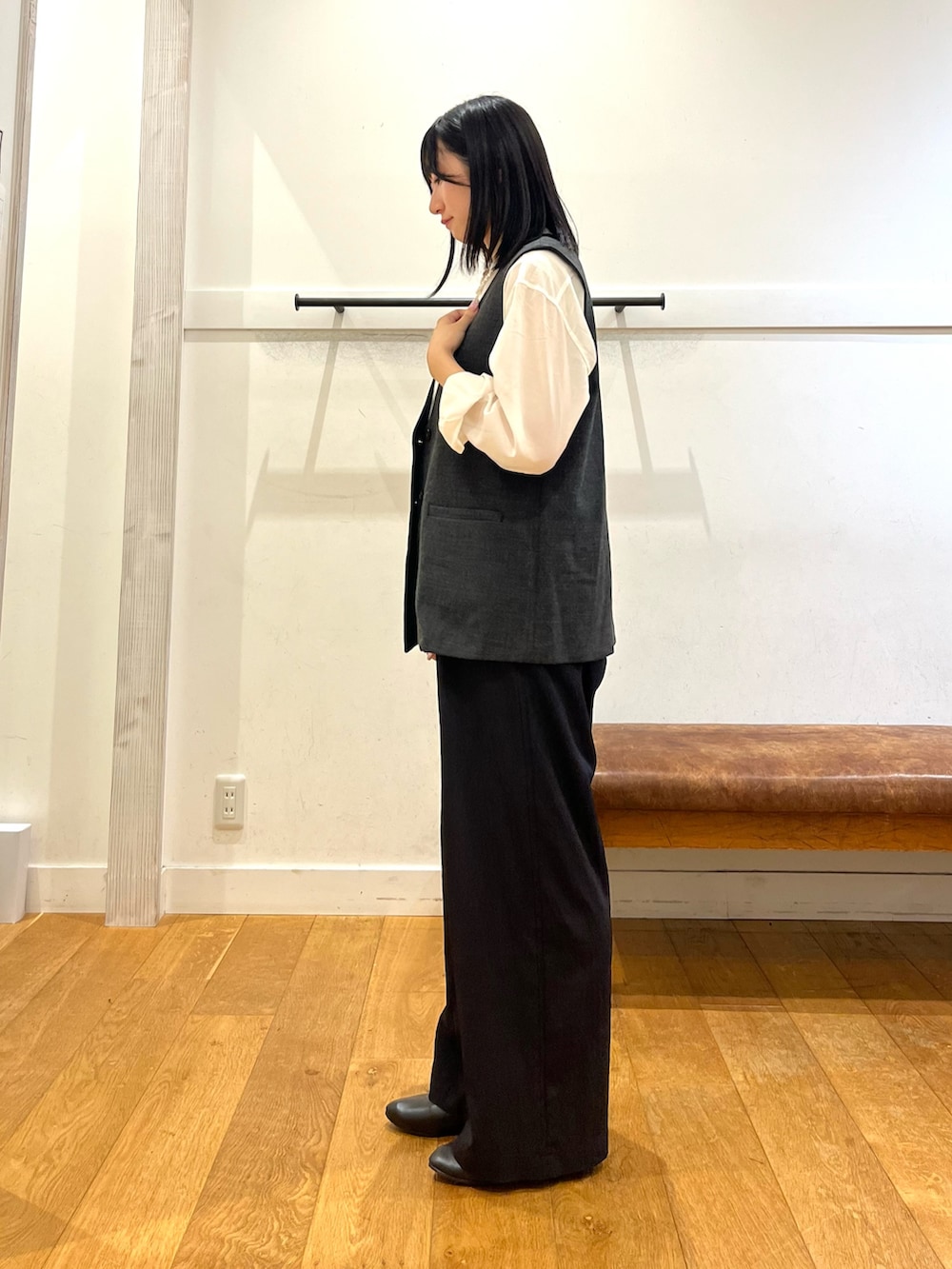 ジレの生地感はカジュアルな雰囲気を出しますが、形がスッキリと綺麗な印象です。