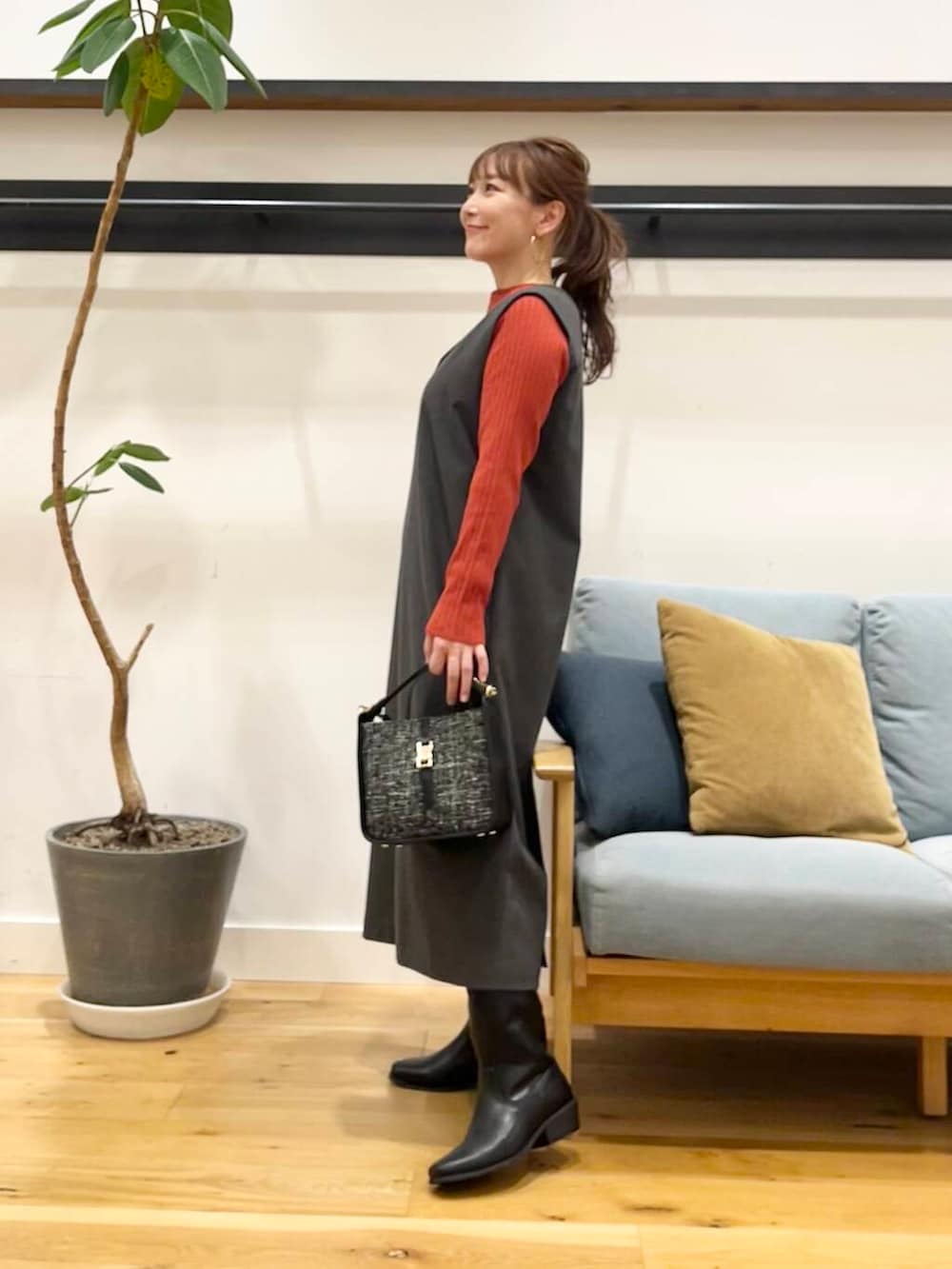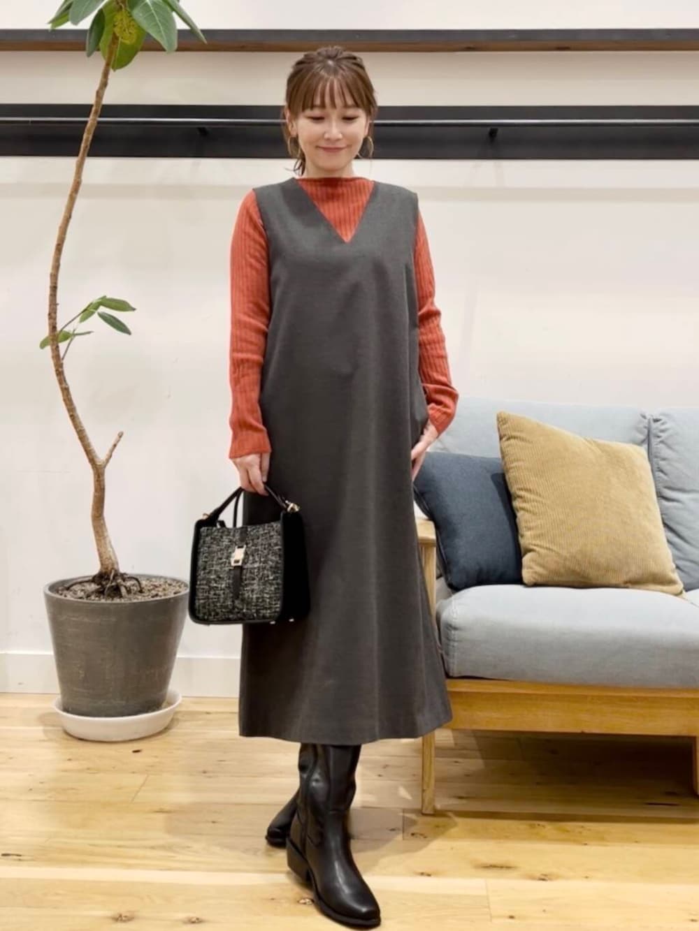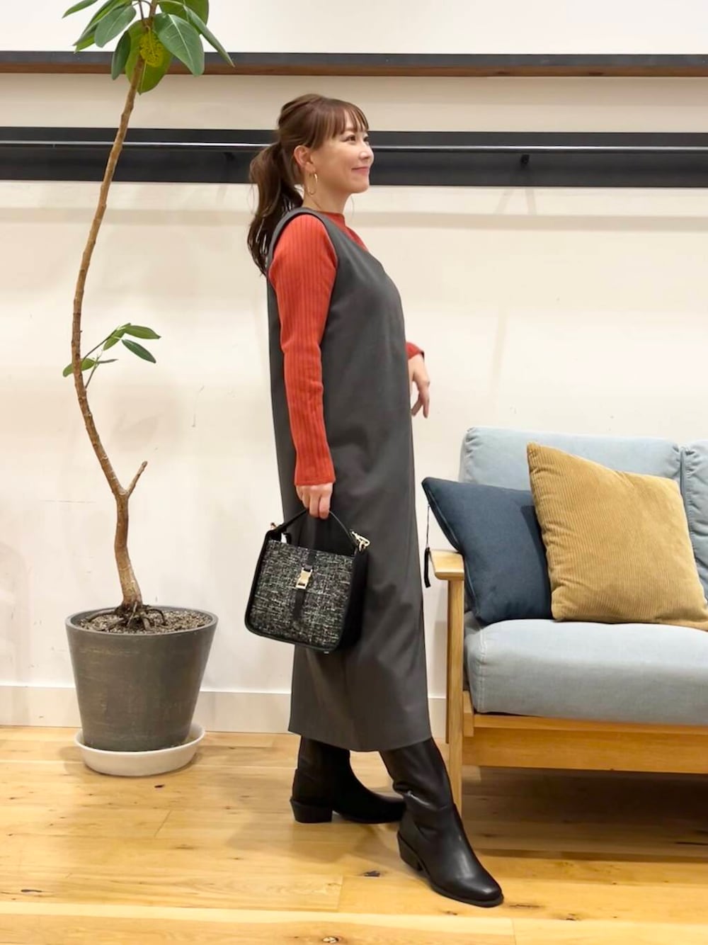 ボートネックワイドリブニットはちょっとポイントになってくれるテラコッタ。