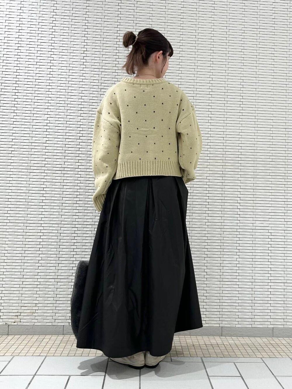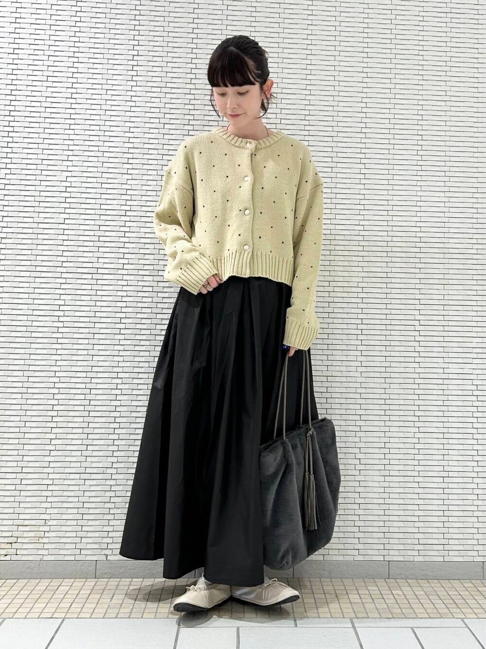 着丈がコンパクトなのでフレアスカートやワイドパンツなどボトムスのボリュームを気にせず着回ししていただけます。