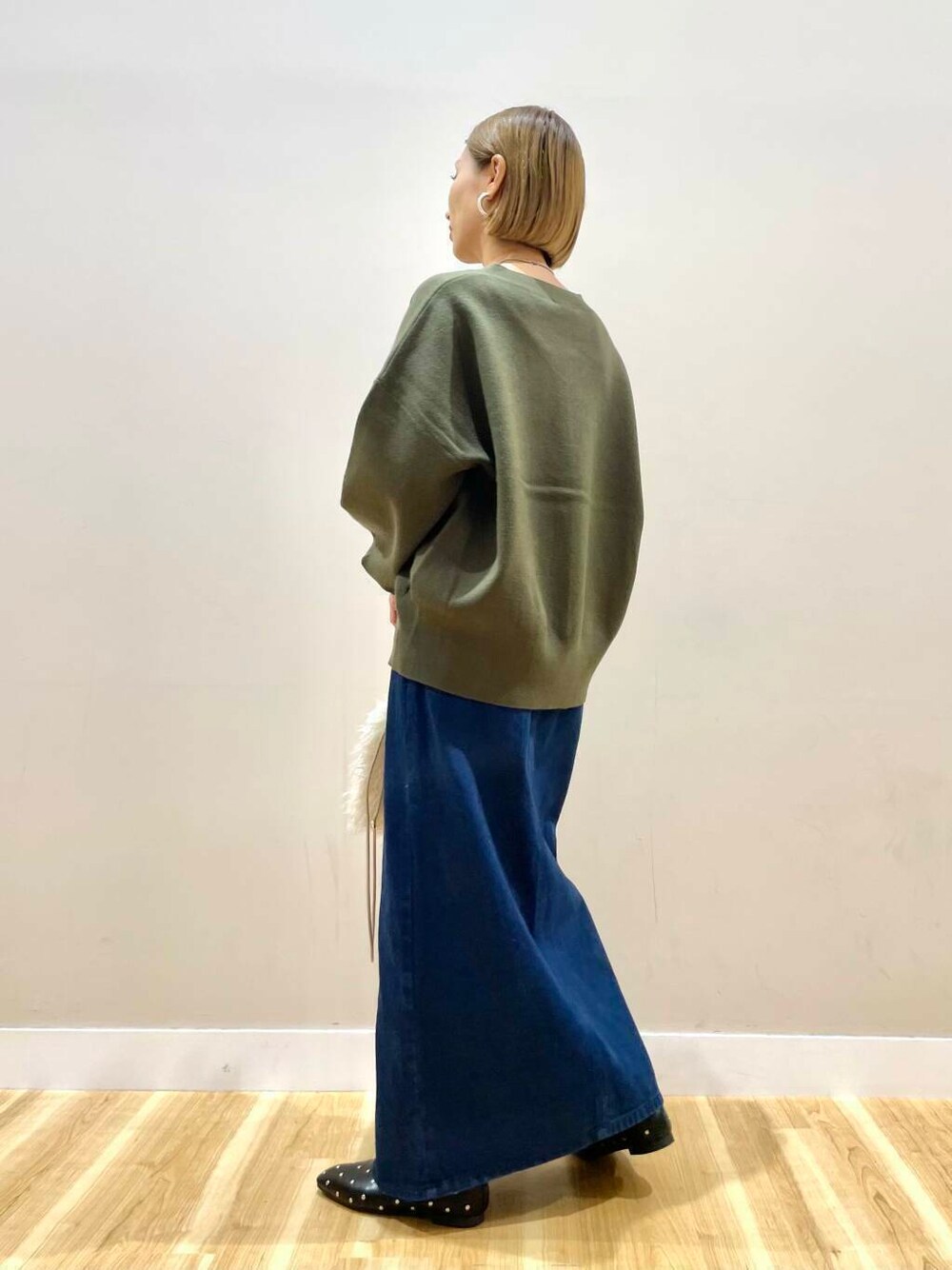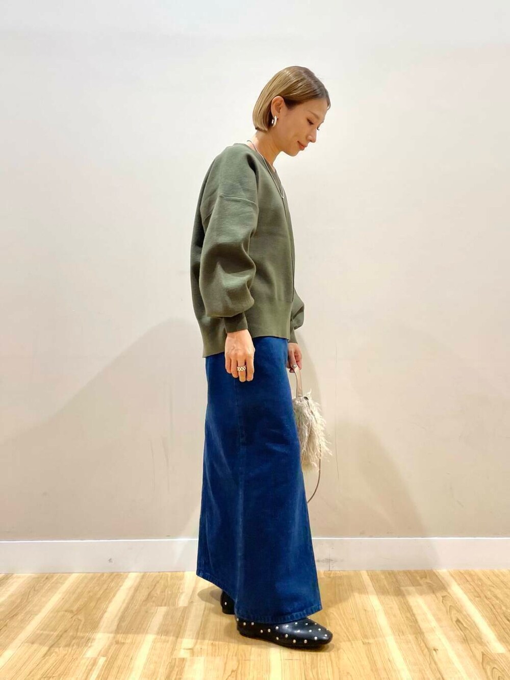 デニムタイトスカートはしっかり長さあり、