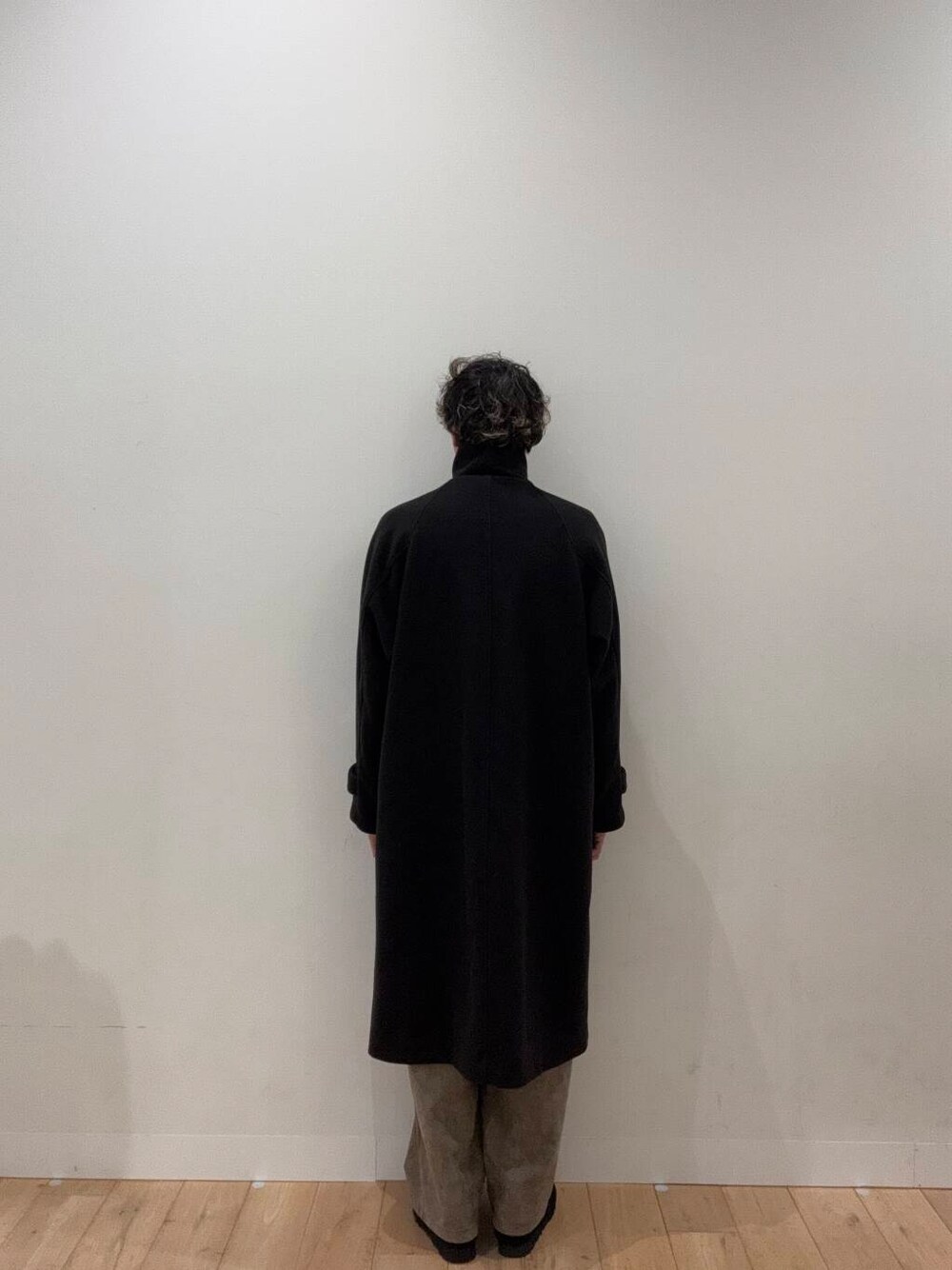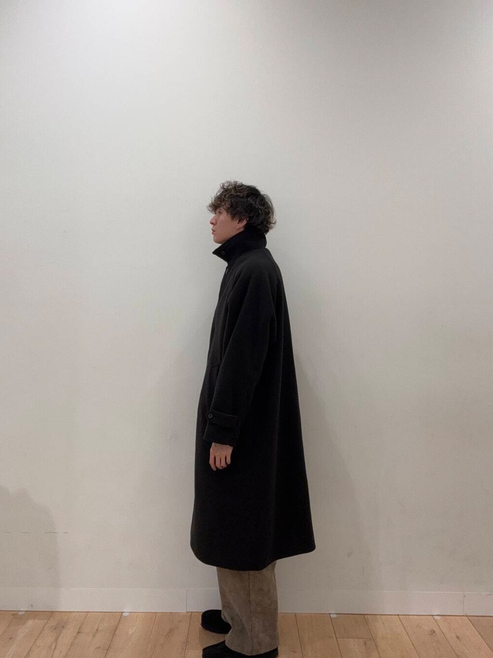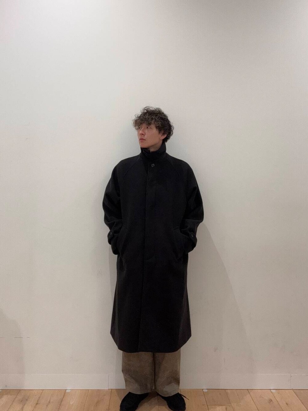 アウターはこのコーデの主役であるバルマカーンルーズコートを着用。大柄な自分もしっかりとロングで着られるサイズ感で中にもニットやスウェットを着込めるので真冬も安心です。
