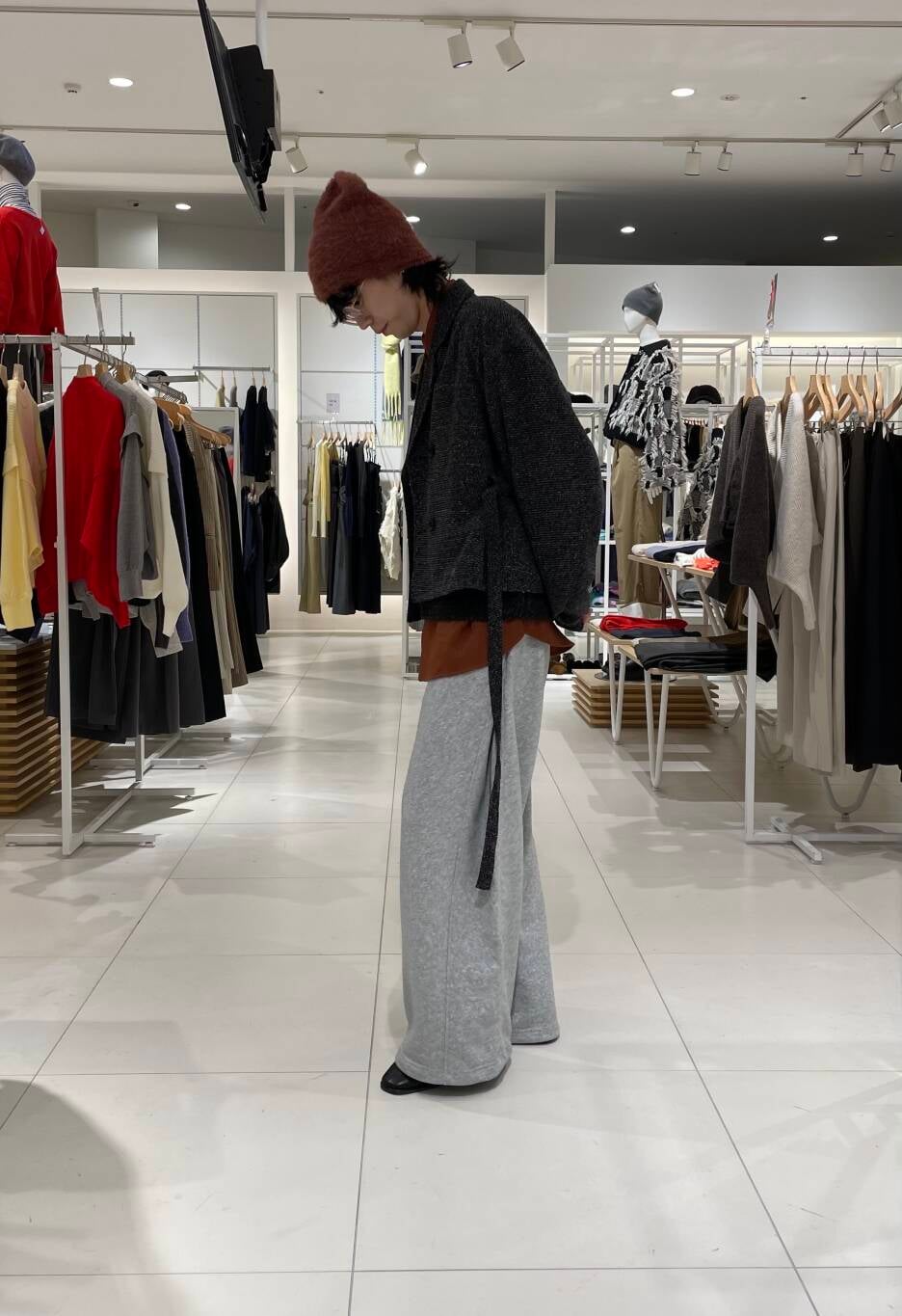 オレンジの差し色が目立つコーデ