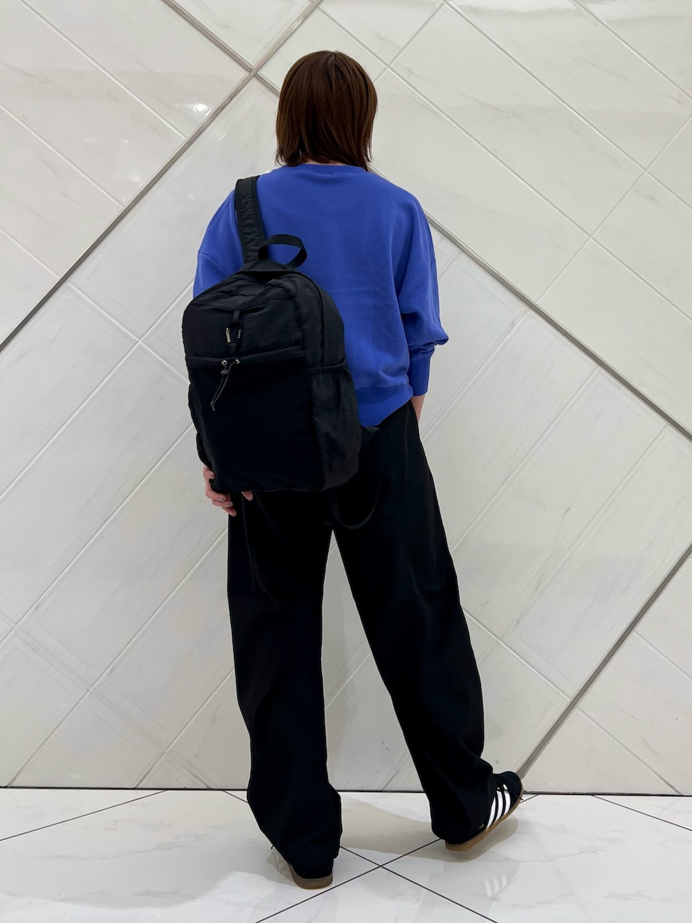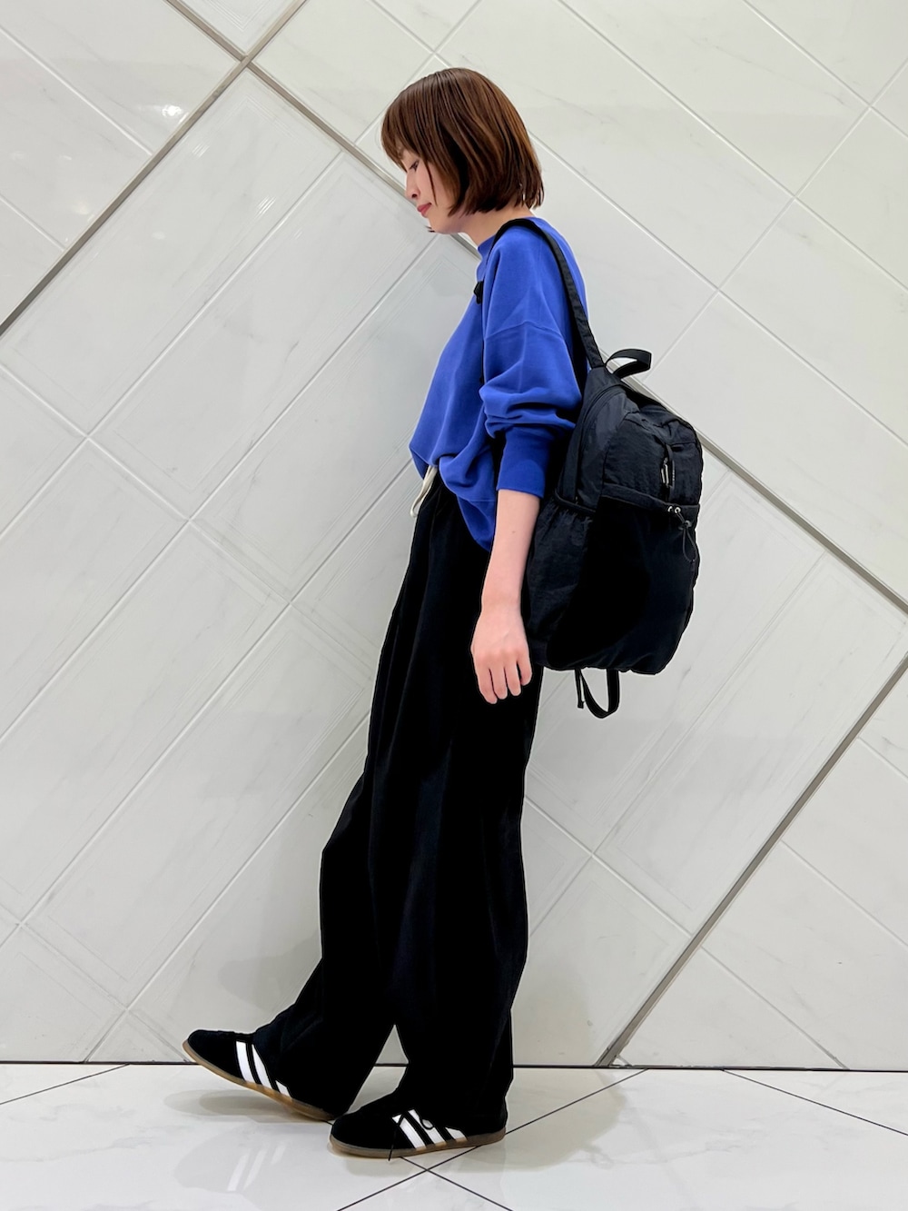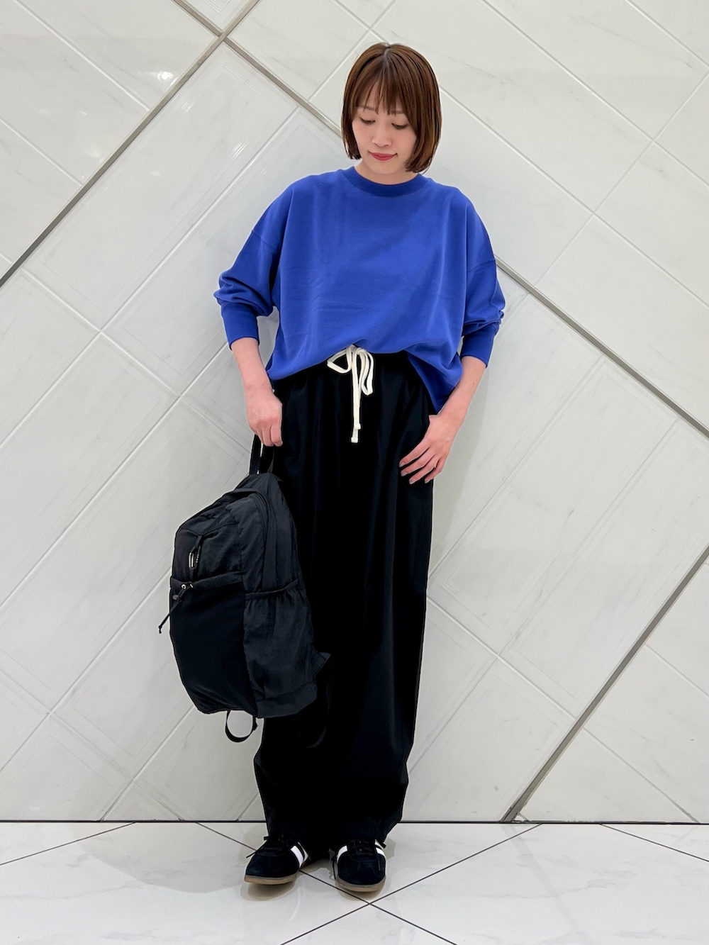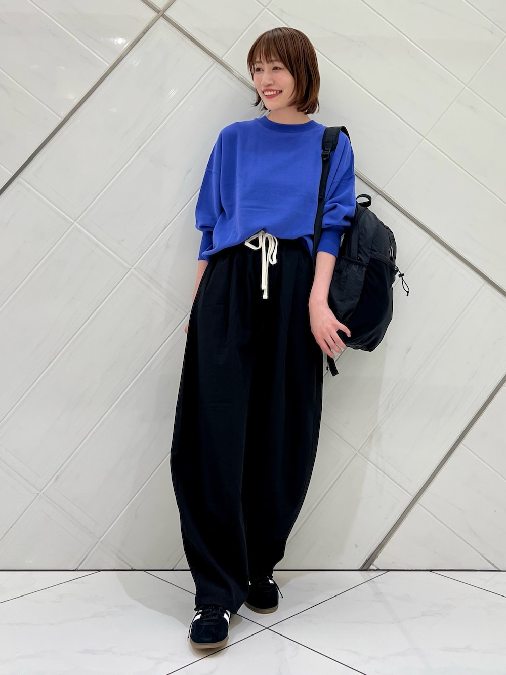 パンツは程よいコクーンシルエットで大人カジュアル