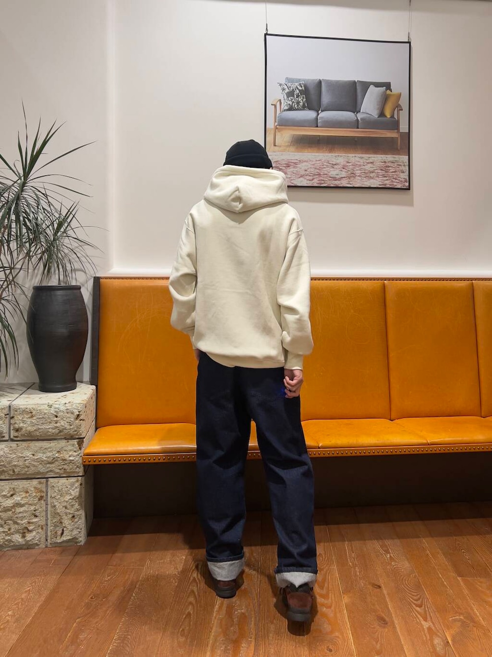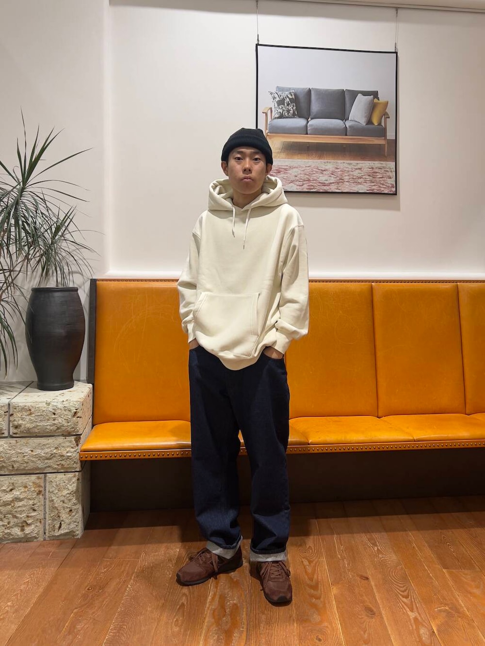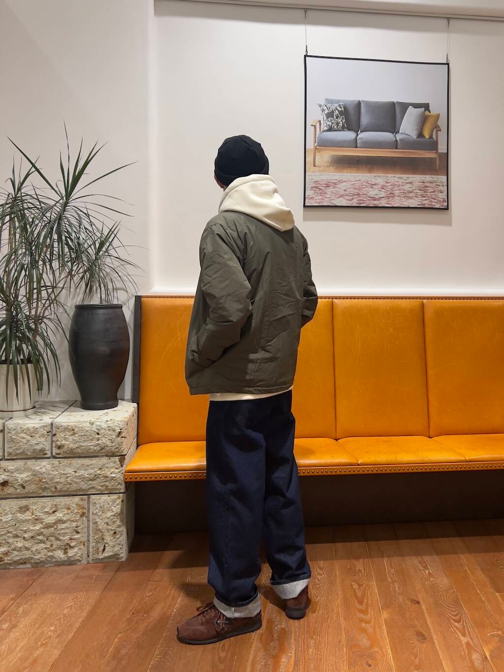 パンツはFORK&SPOONのJFデニムで岡山で作られて日本製のデニムになっており濃いインディゴデニムでジャケットのカーキと相性は抜群です。履き込むほど色落ちも楽しめるパンツになっております。