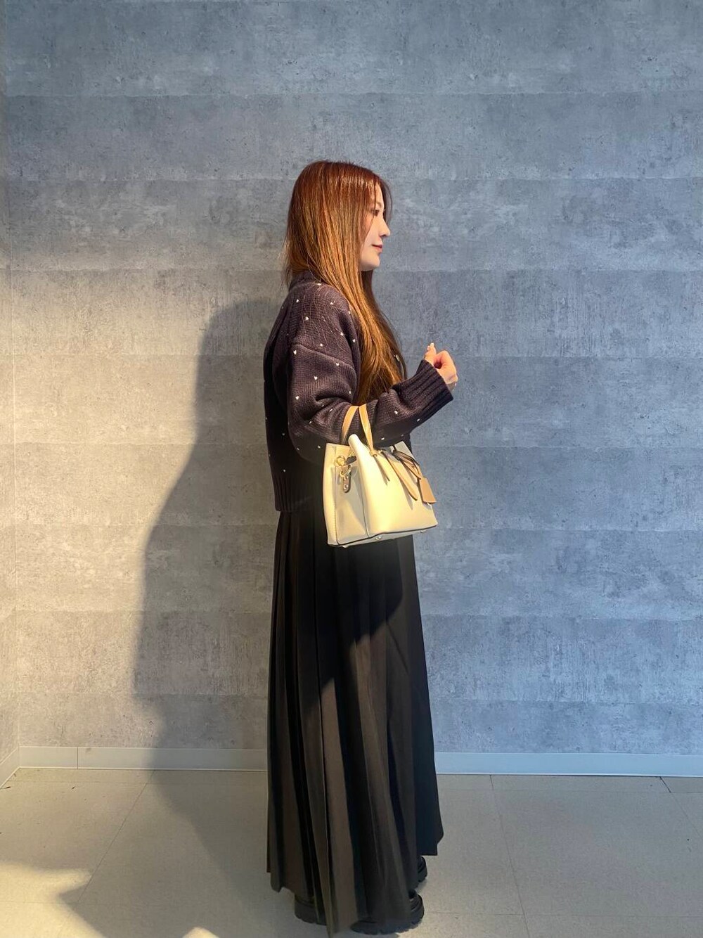 プリーツスカートは後ろでウエストを調節でき低身長の方でも安心して着れる丈感です!