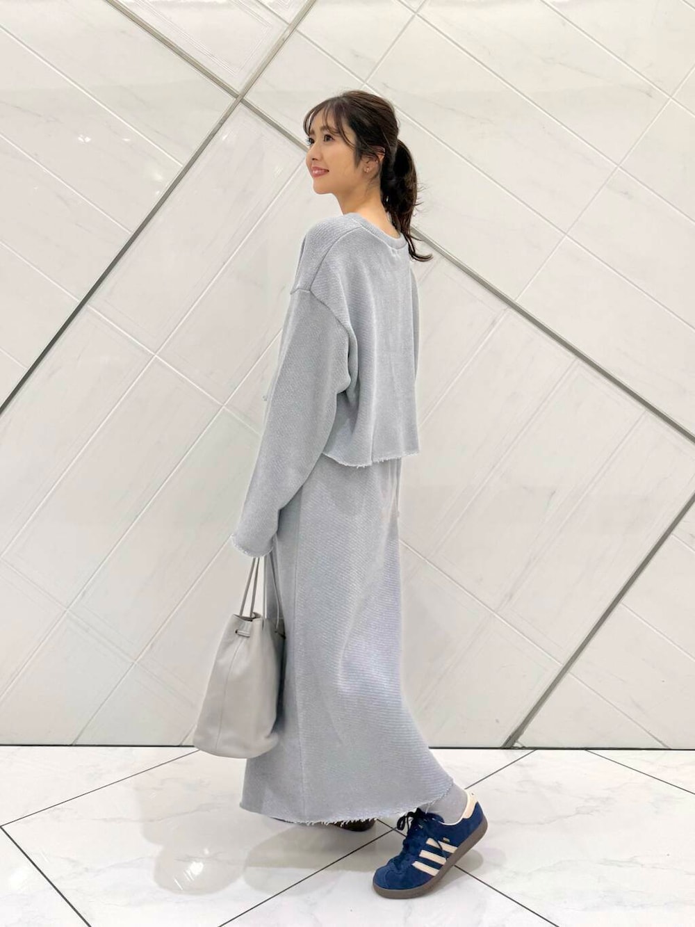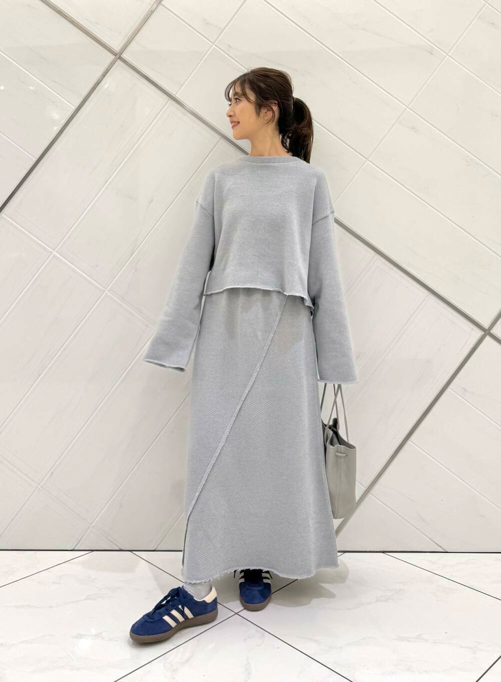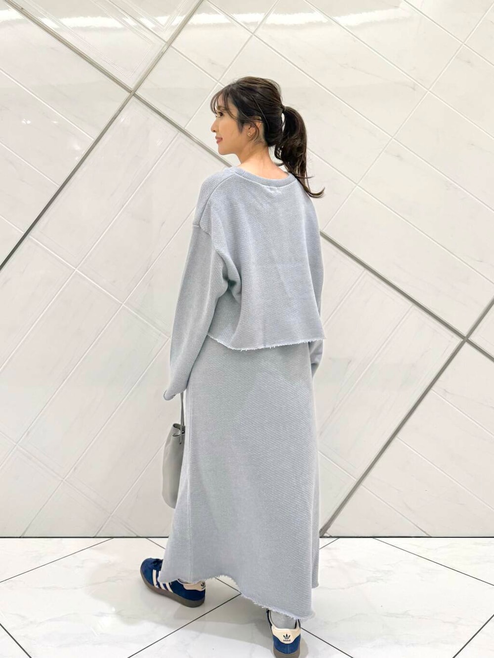 トップスはゆったりとしたシルエットですが、着丈は短いのでスタイル良く見えます。