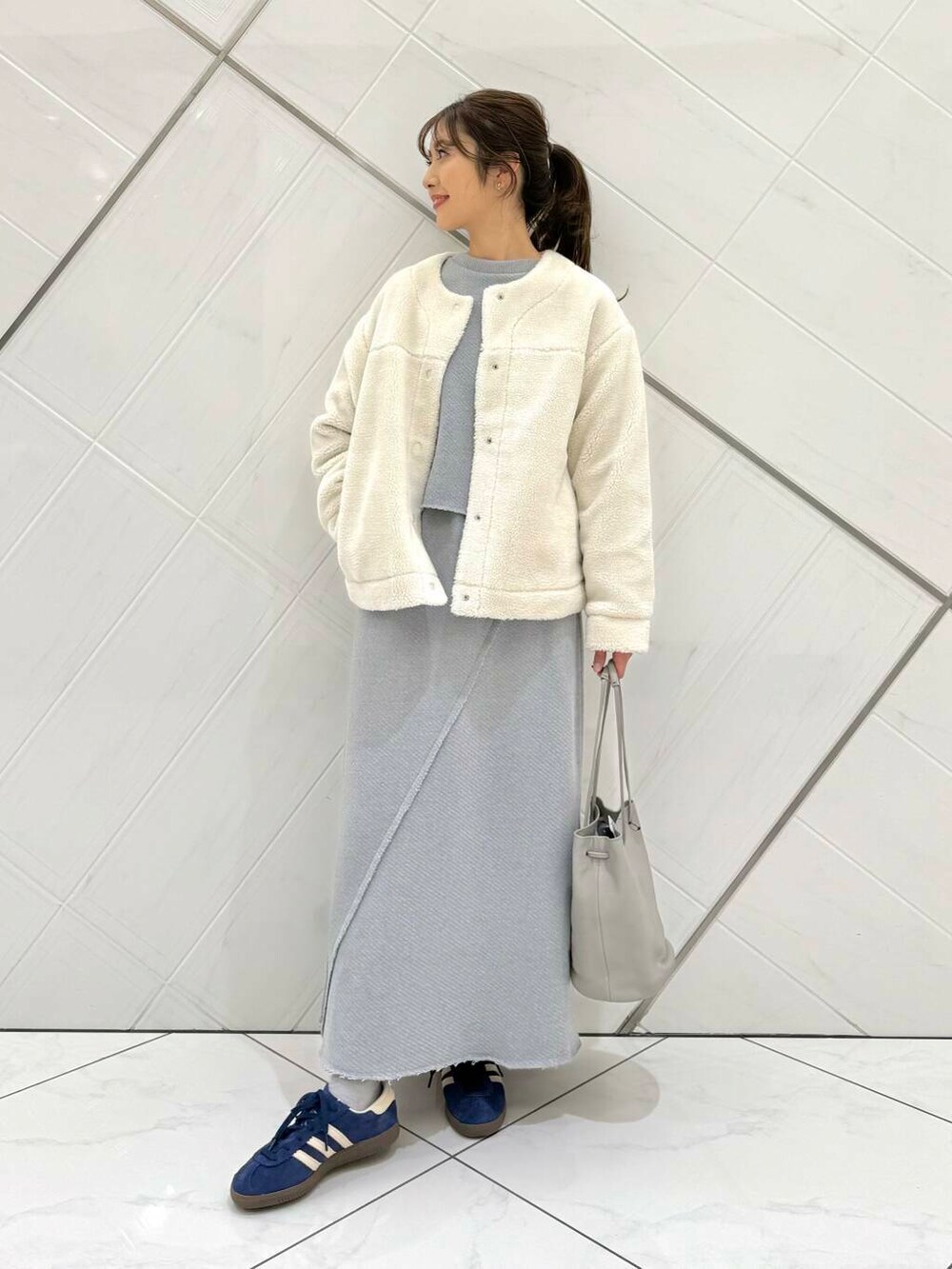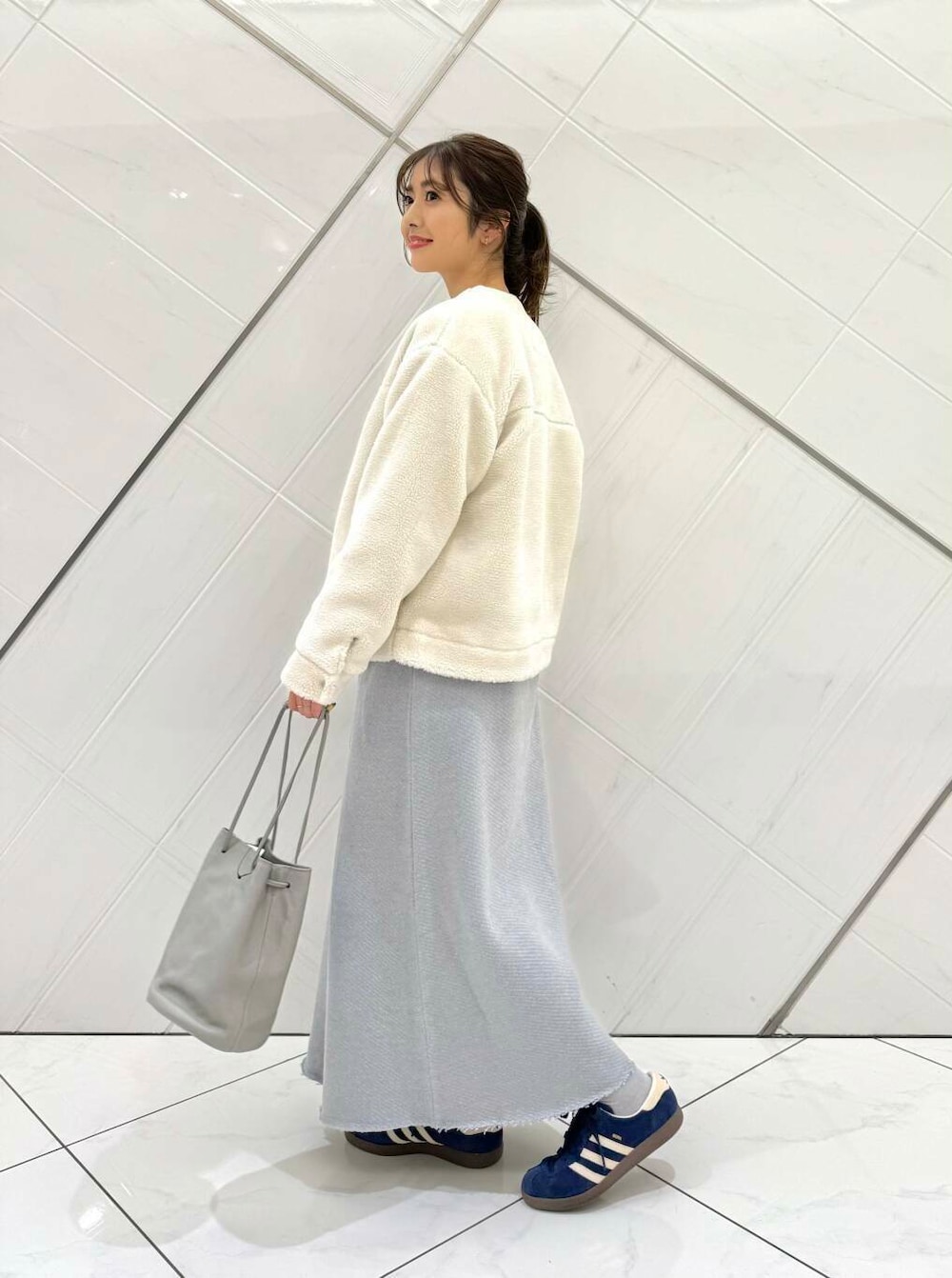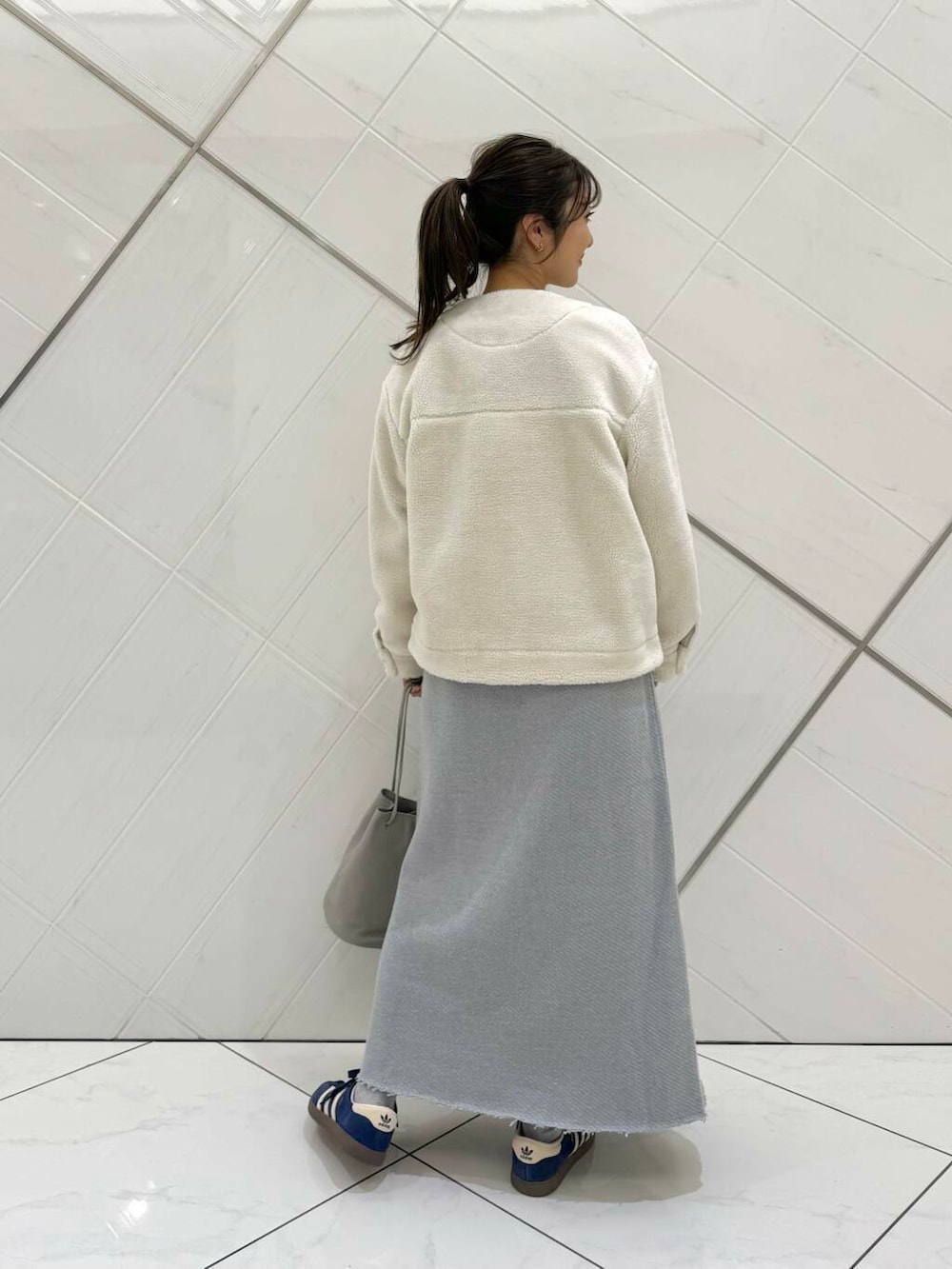 トップスはゆったりとしたシルエットですが、着丈は短いのでスタイル良く見えます。