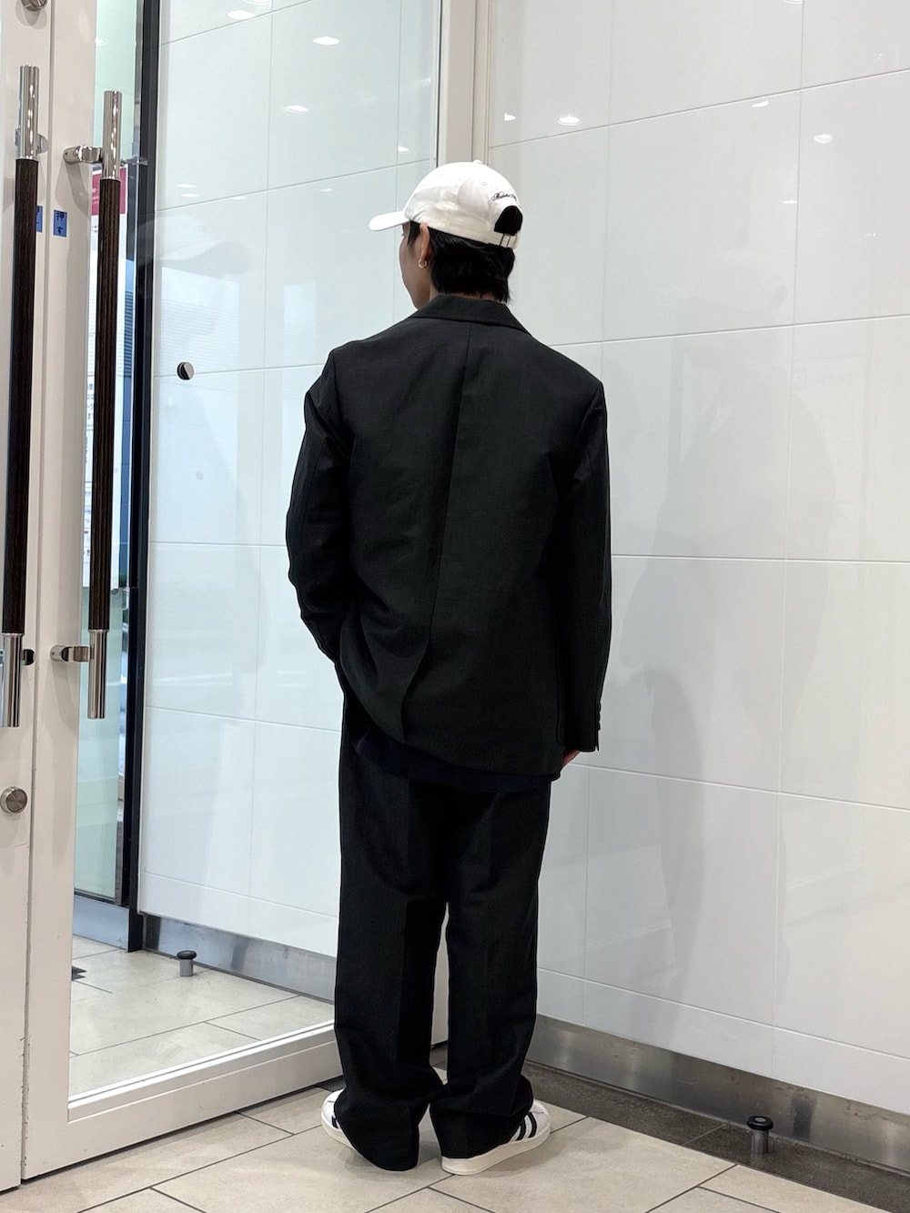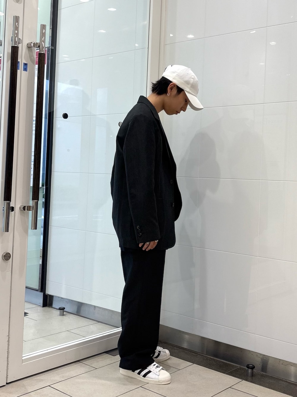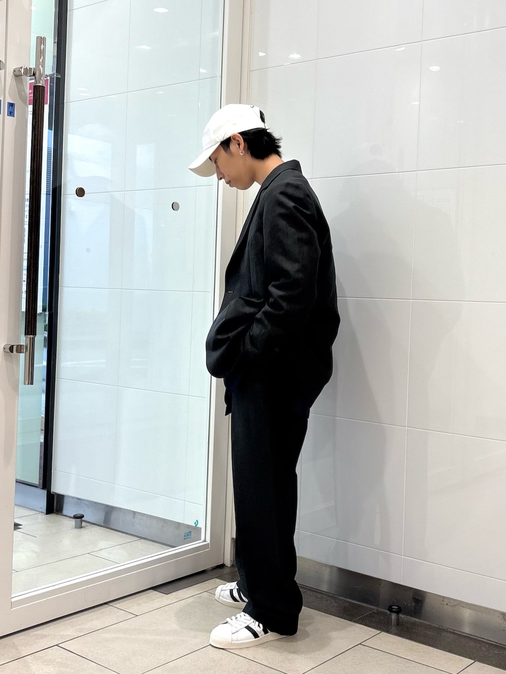 キレイめのセットアップにあえて白のキャップやスニーカーを合わせることによって学生のようなアクティブさとクリーンさを出しています。