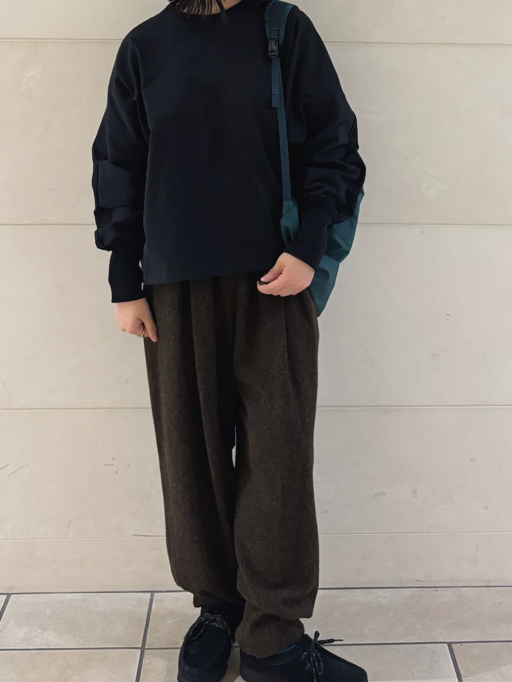 トップスはハリ感があって、シンプルながらも様になるアイテムで、袖のリブが長めにあるので、ボリューム感が可愛いです😃デニムなどでがっつりカジュアルにするのも良いですが、今回のようにちょっと綺麗めなアイテムで合わせるのもおすすです!ショート丈なのでスカートで合わせてもバランス取れます😉