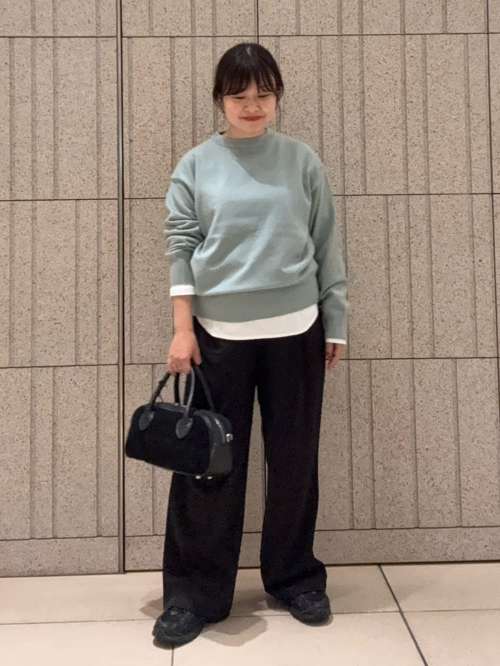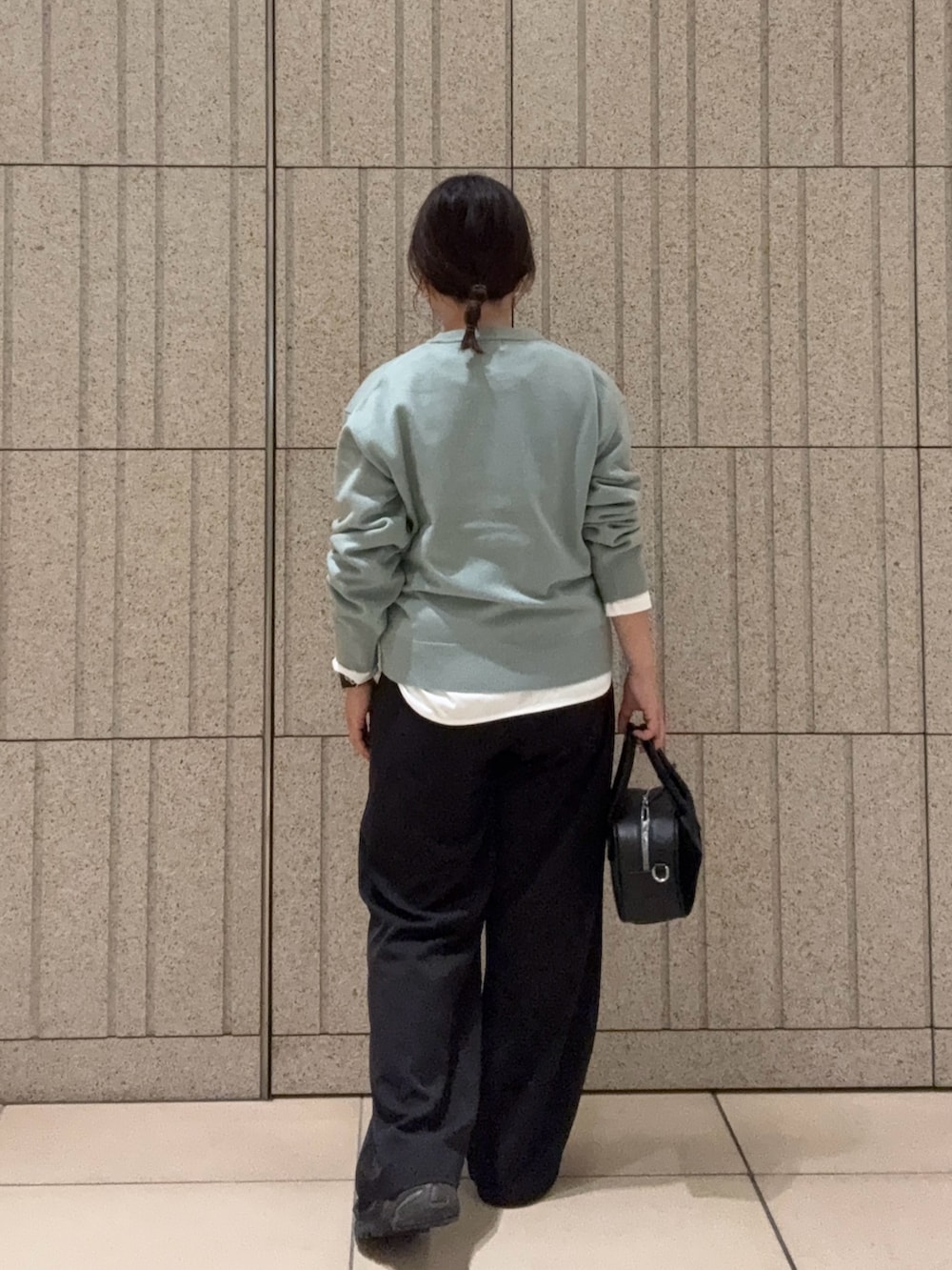 パンツは今季イチオシの完声パンツを合わせてみました。ラインを拾わないシルエットで上品見えするので、オンオフ兼用出来ます。