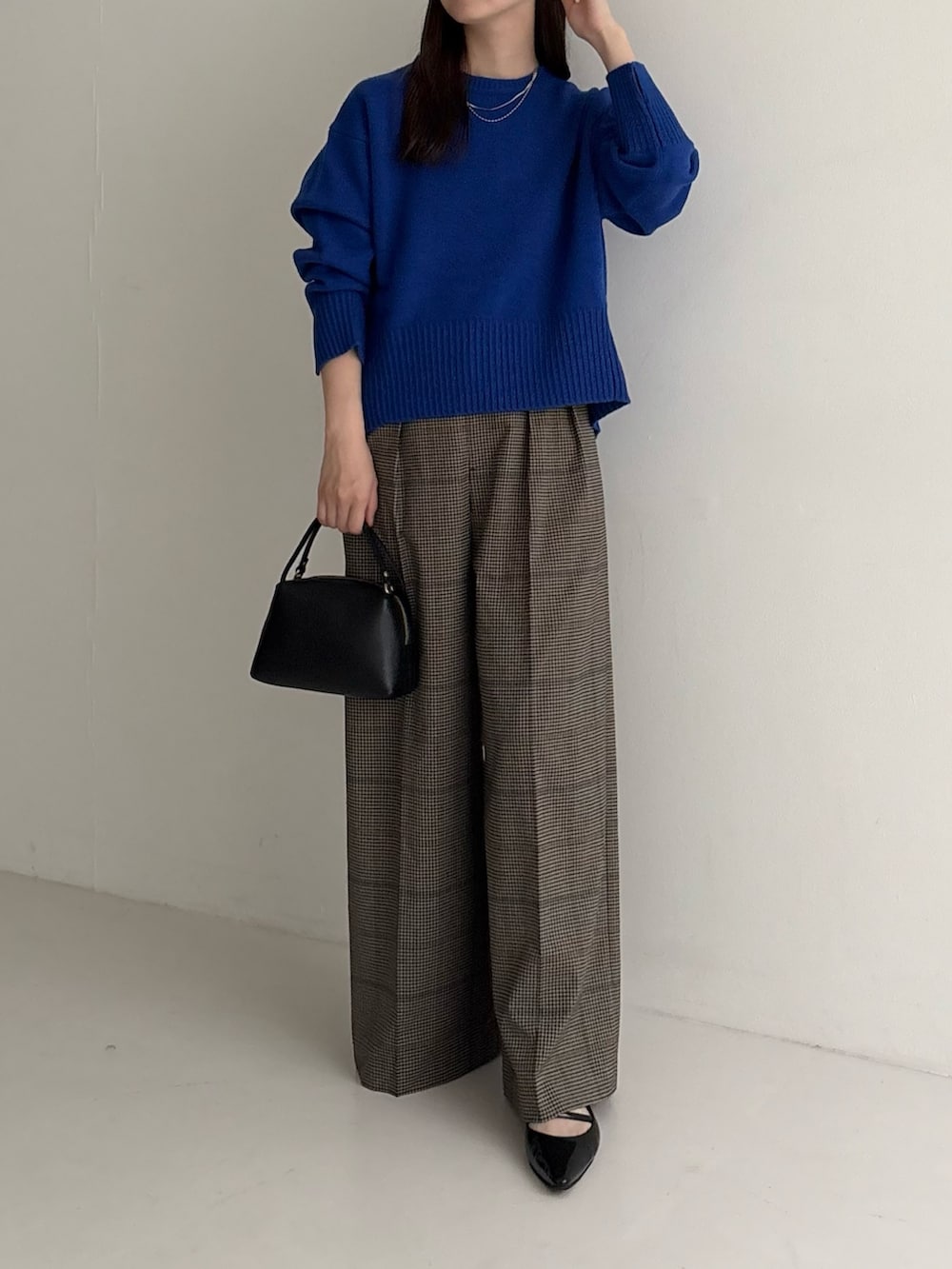シーズンムード漂うチェックパンツは、脚長効果抜群の美シルエット。