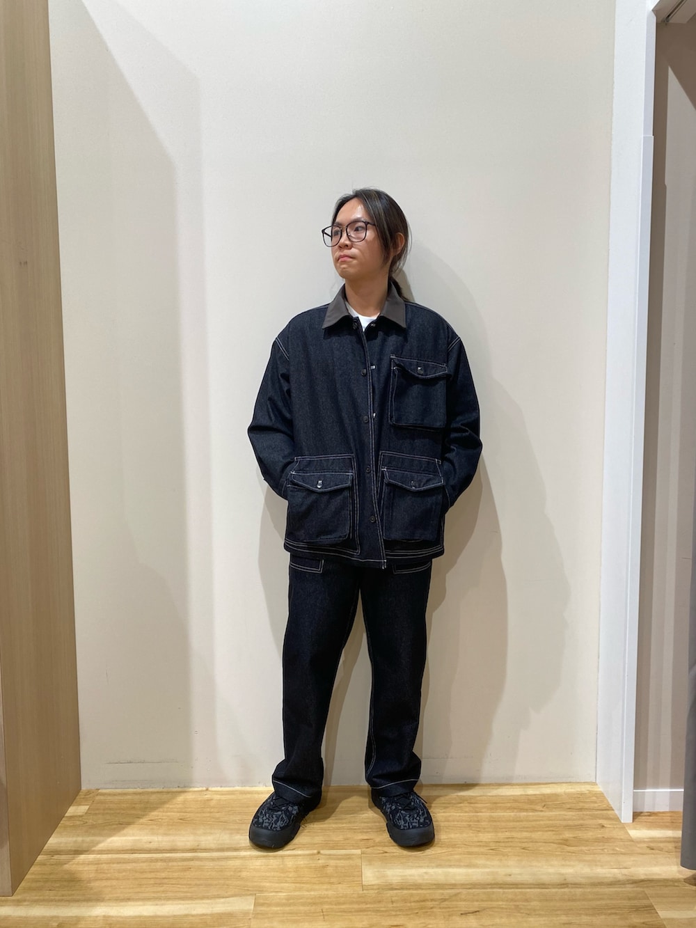 デニムカバーオール×デニムパンツでセットアップ風に仕上げたスタイル。