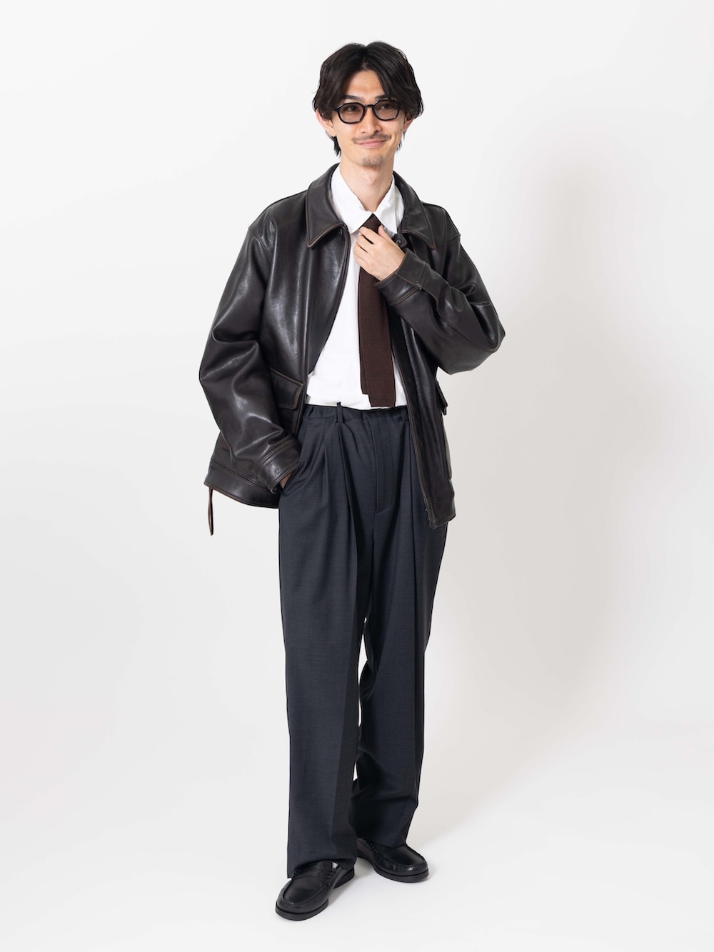 無骨に合わせたいレザージャケット。とはいえ辛口すぎず着こなしたい。ニットタイに歴史あるJDAのシャツ、綺麗にこなれたスタイリングを目指しました。ヤンチャさって大事です。
