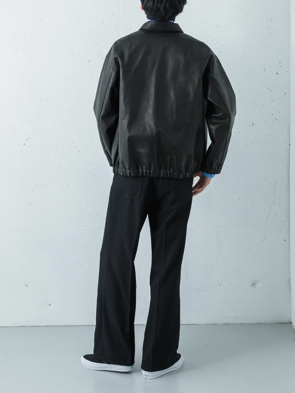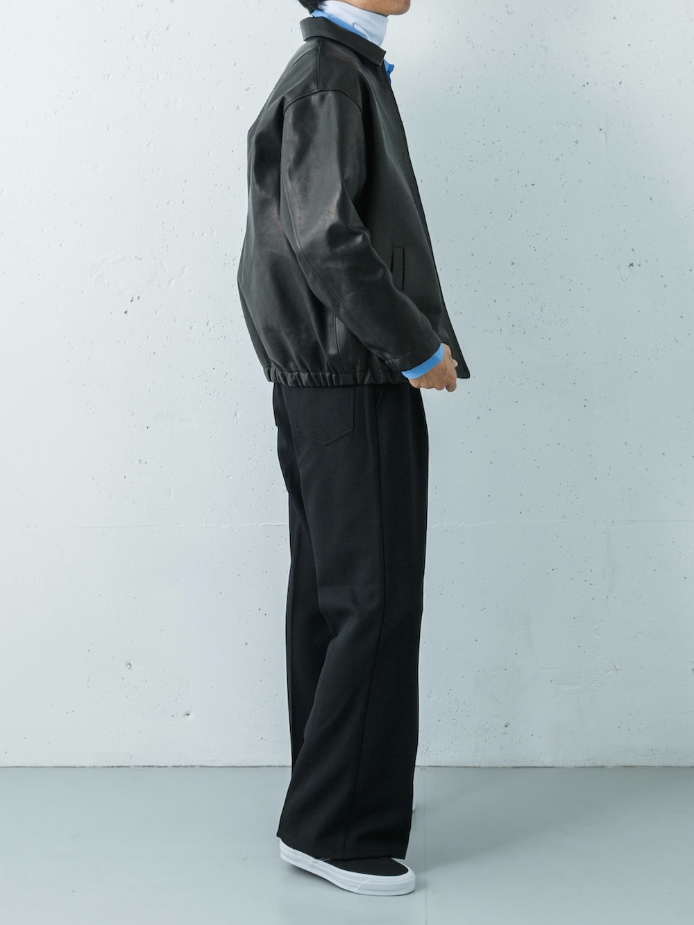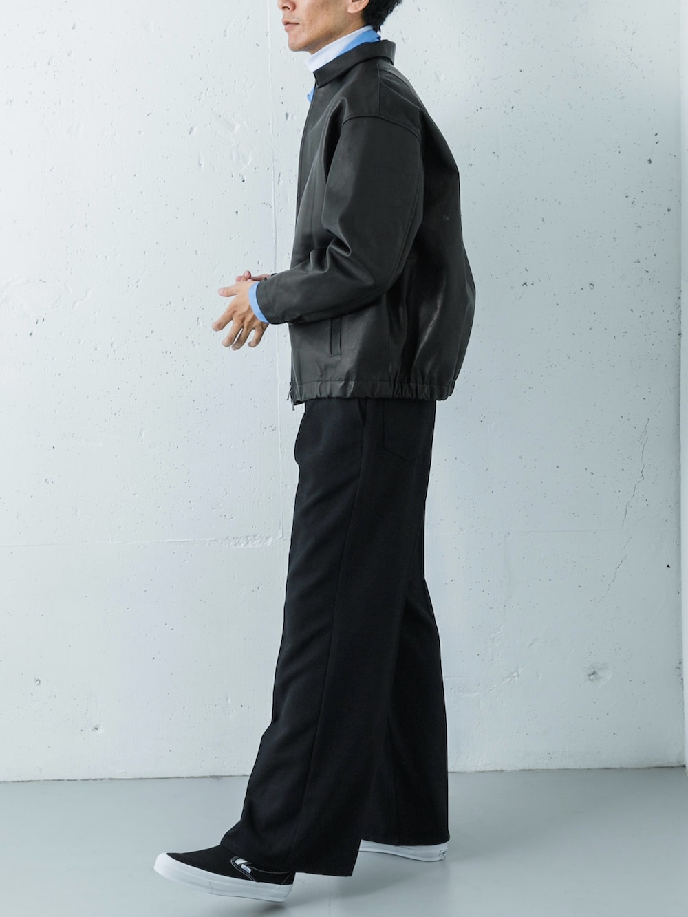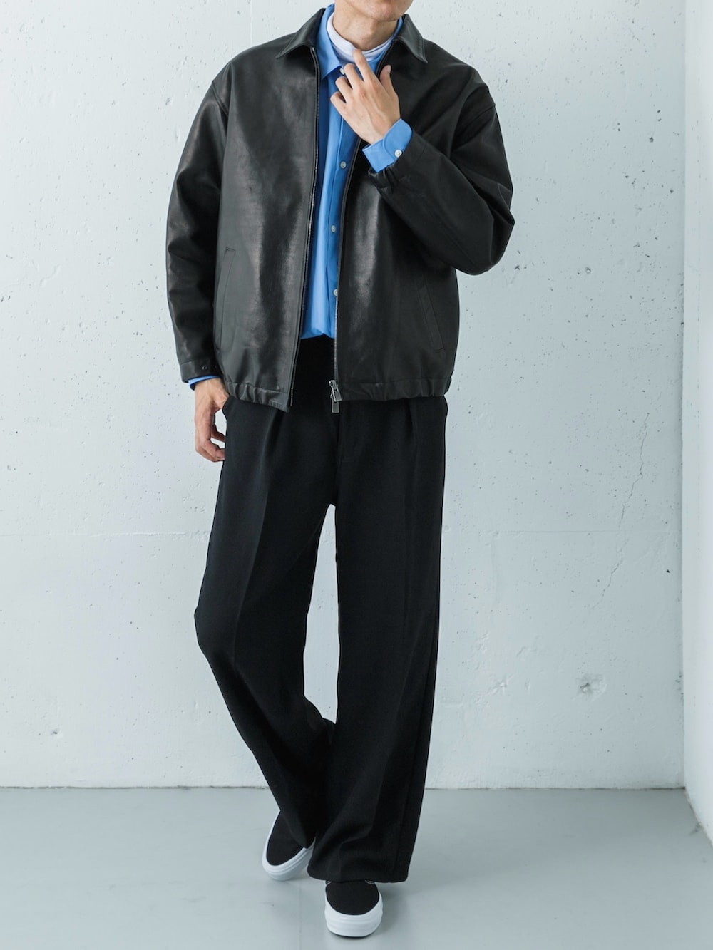 ワイドシルエットのパンツが上品さと抜け感を両立し、足元のスリッポンが軽やかなバランスを生み出します。