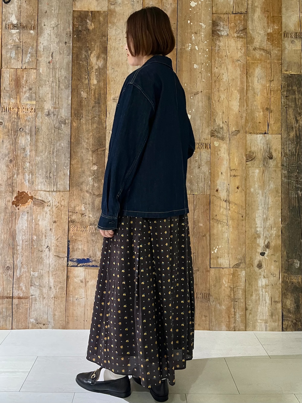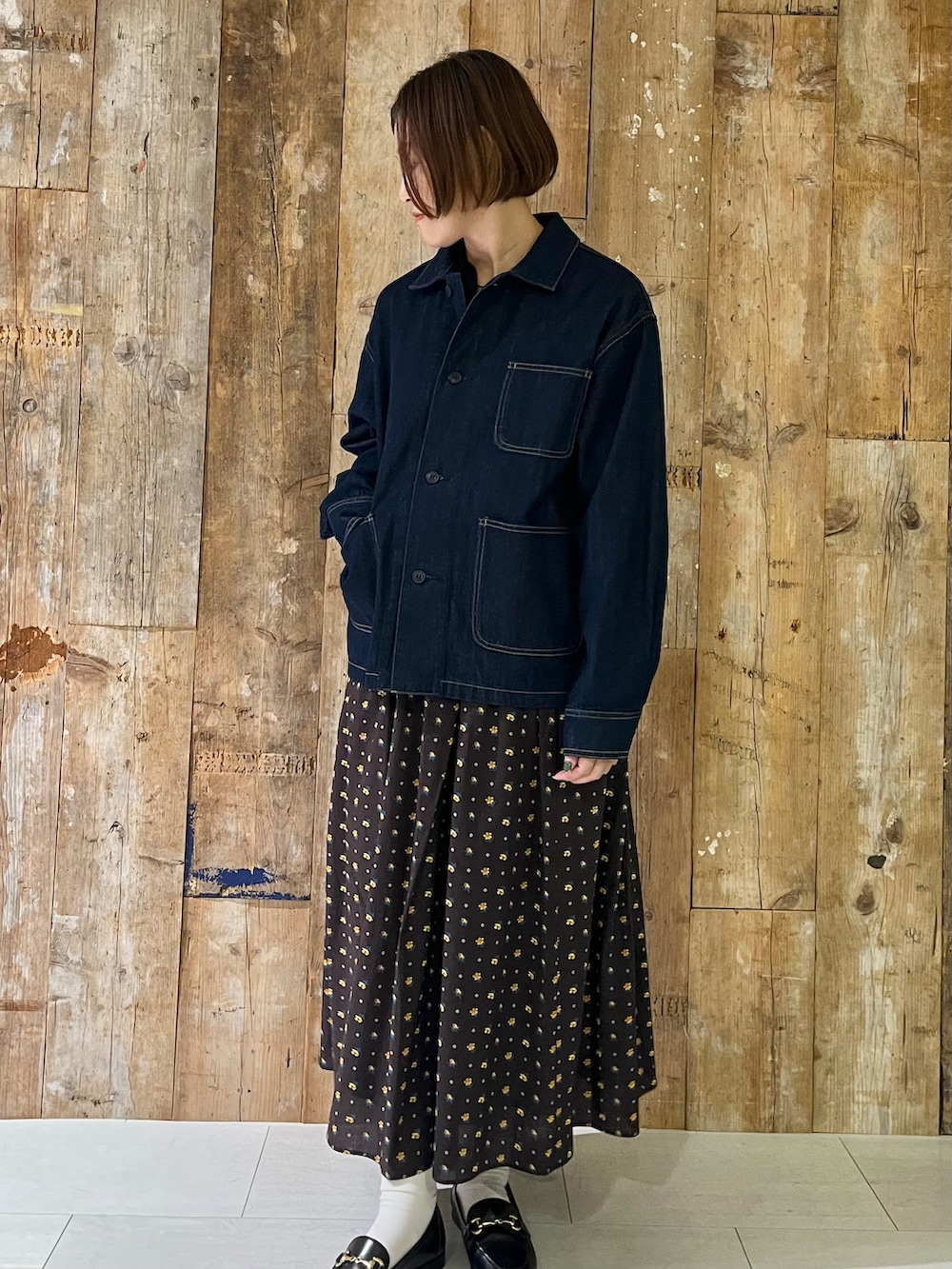 少し秋らしく朝、夕涼しくなってきましたね。今からの季節に大活躍のデニムカバーオールにリバティプリントスカートを合わせて大人可愛く♪