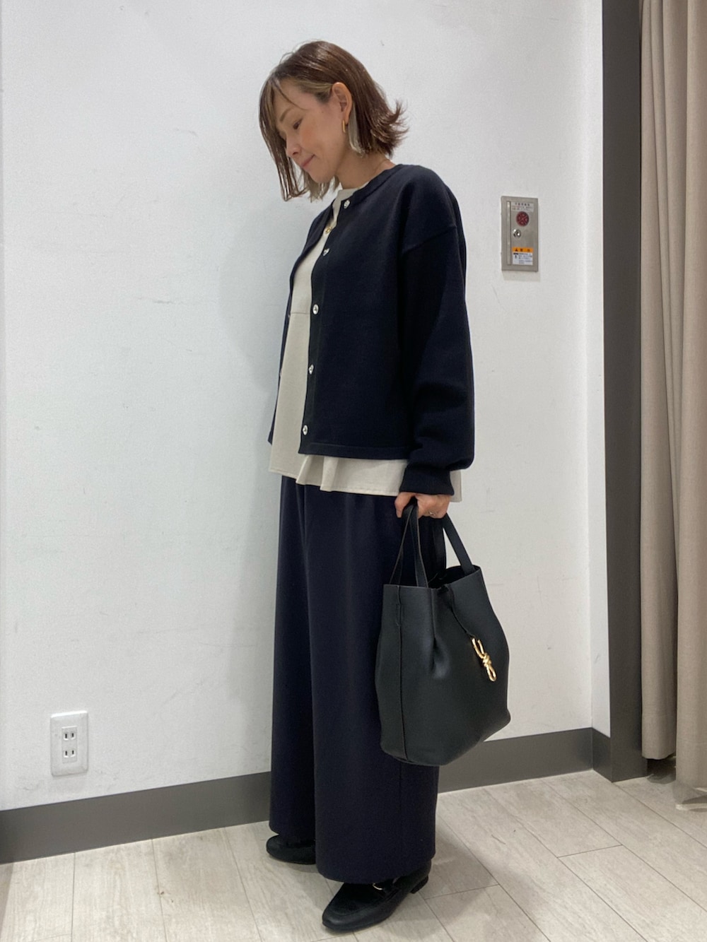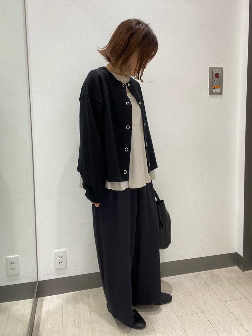 シルキーコットンのペプラムカットソーに、200日ニットカーディガン、ボトムは完声9分丈ワイドパンツを合わせ、オフィスコーデにしてみました!