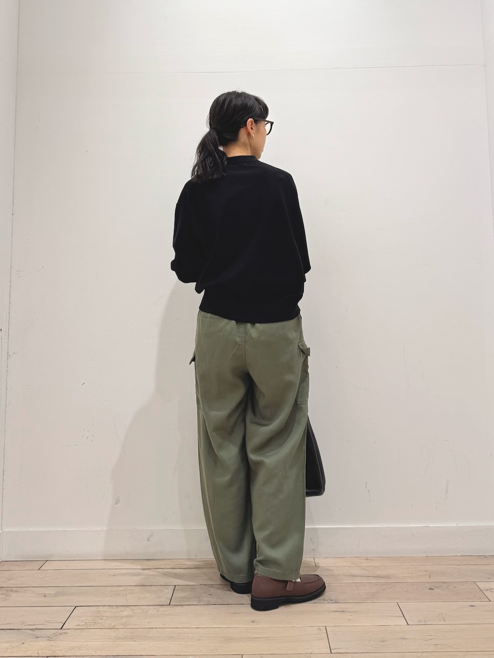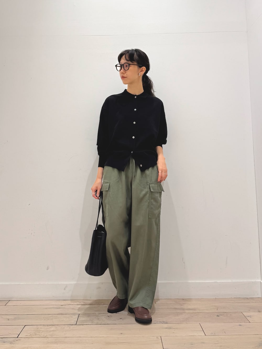 パンツはウエストゴムでおしゃれ見えするカーゴパンツです!少しテロっとしていて羽田あたりもいいです。