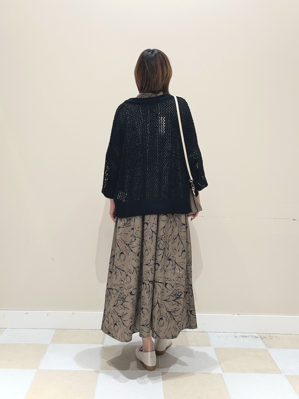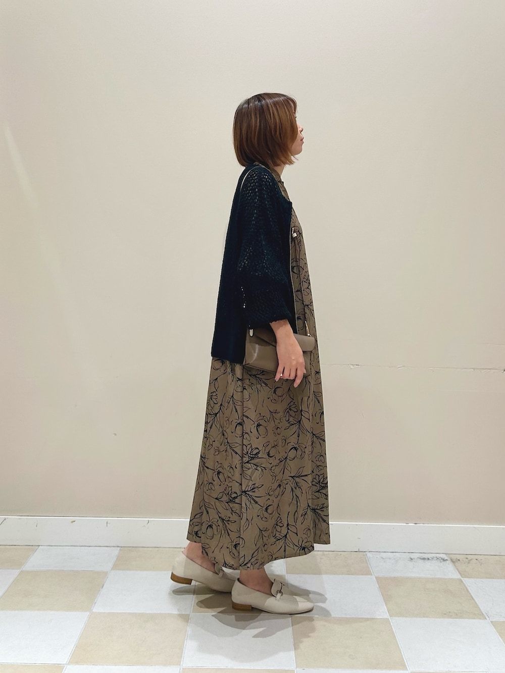 シックな雰囲気のフラワープリントワンピースにメッシュカーディガンを羽織り、お出掛けにおすすめのスタイルにしました!