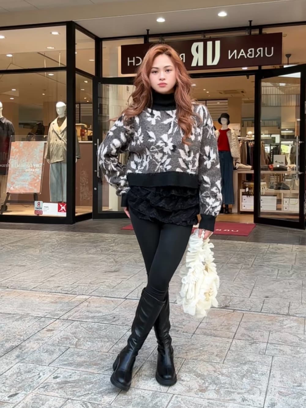鮮やかなオレンジのロングニットに、繊細なレースブラウスをレイヤードして女性らしさをプラス。ボトムはパンツでスッキリまとめ、足元はブーツで季節感を演出。華やかさと抜け感を兼ね備えた、大人カジュアルなおしゃれ秋コーデです。