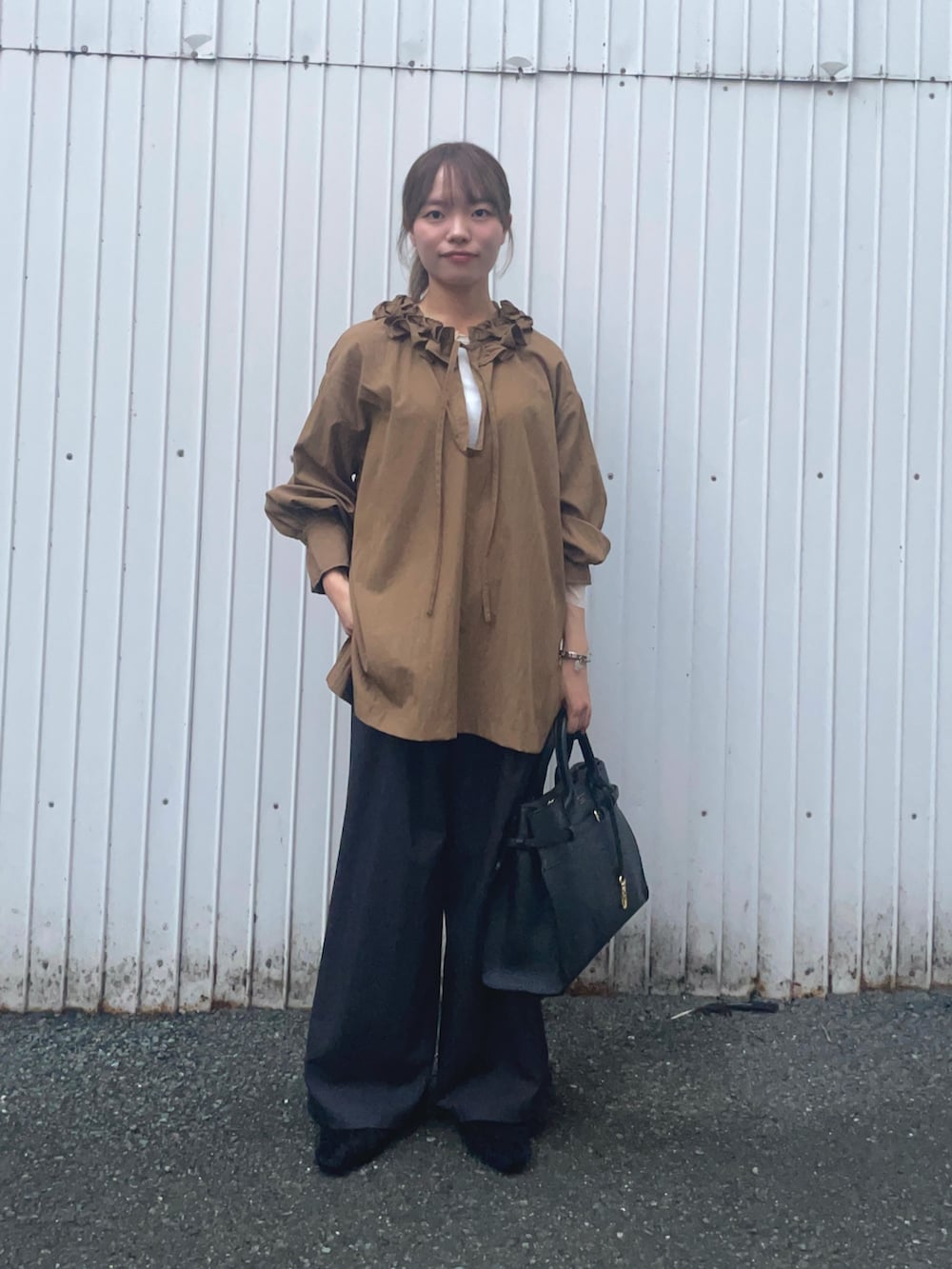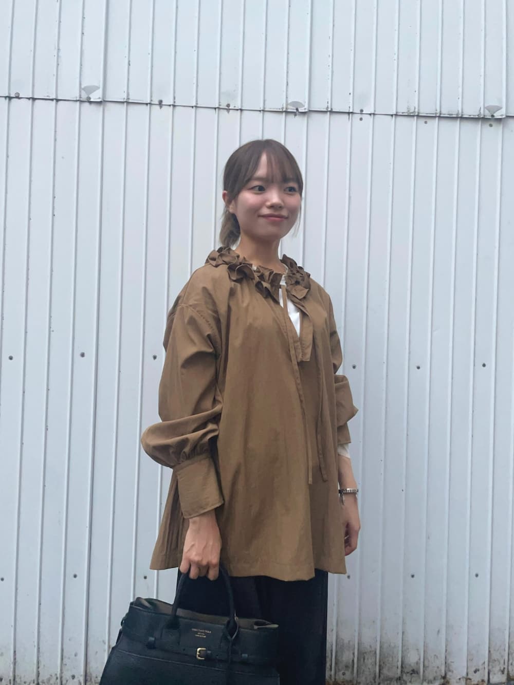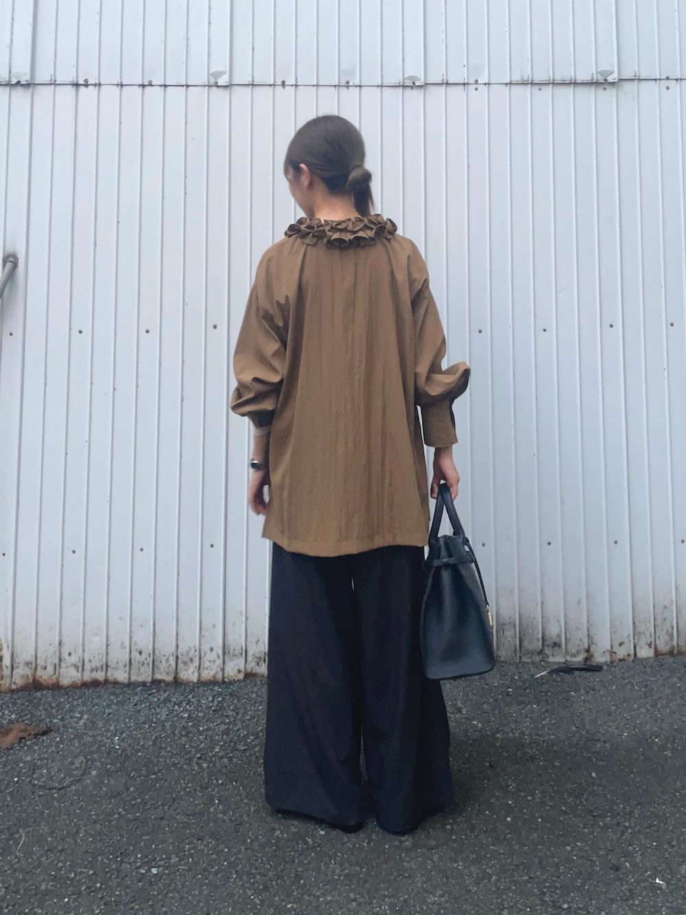 トップスのブラウスは首元にフリルが入ったデザインで、さらりとした軽い素材感です!シンプルなブラウスですが、首元にさりげなくあしらわれたフリルが一気に存在感を出してくれます!