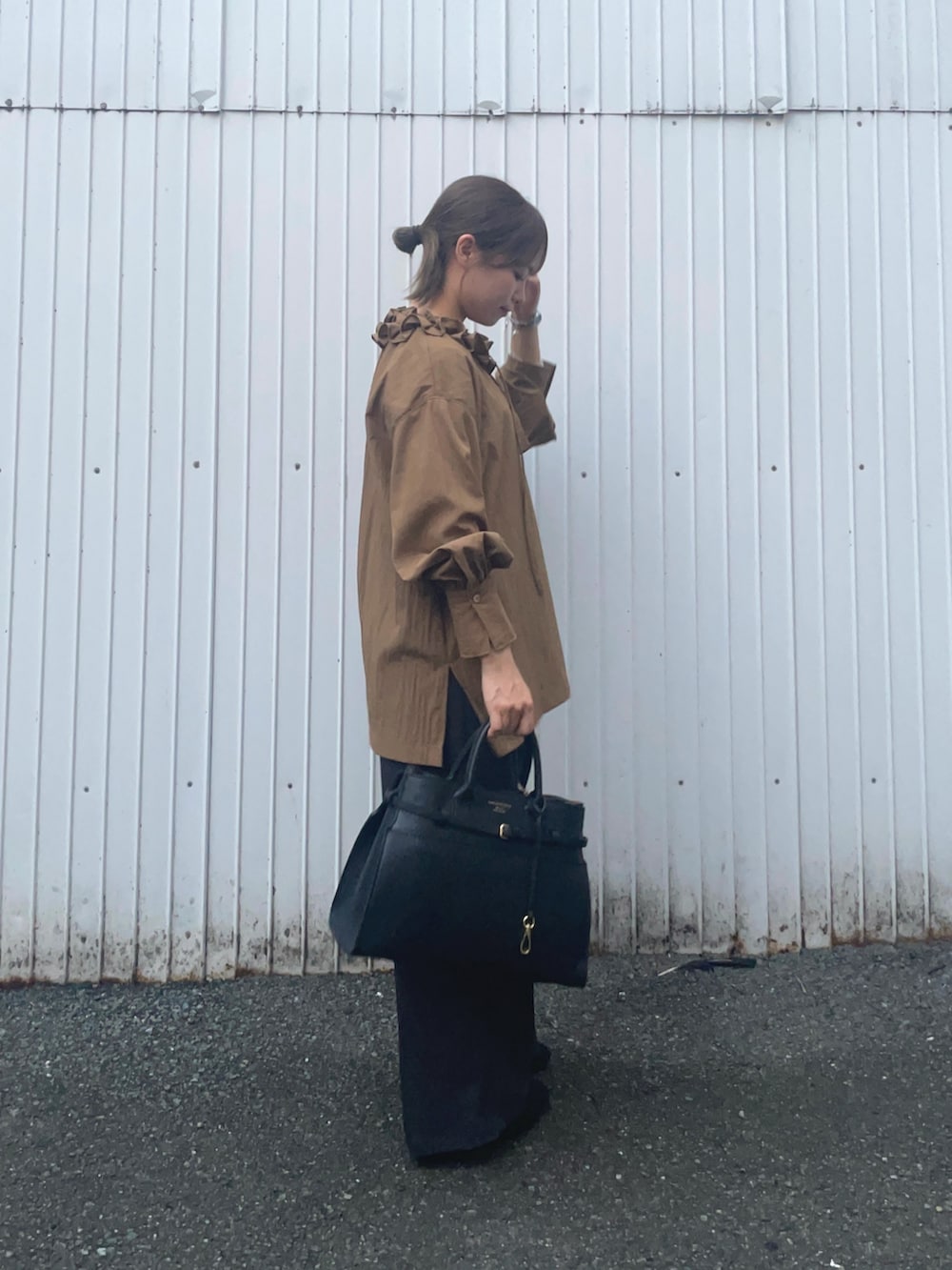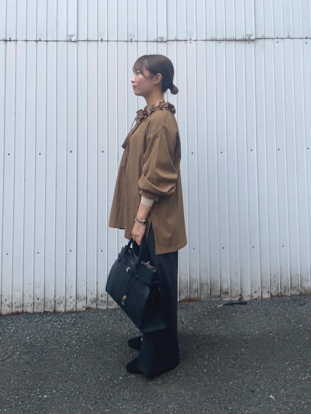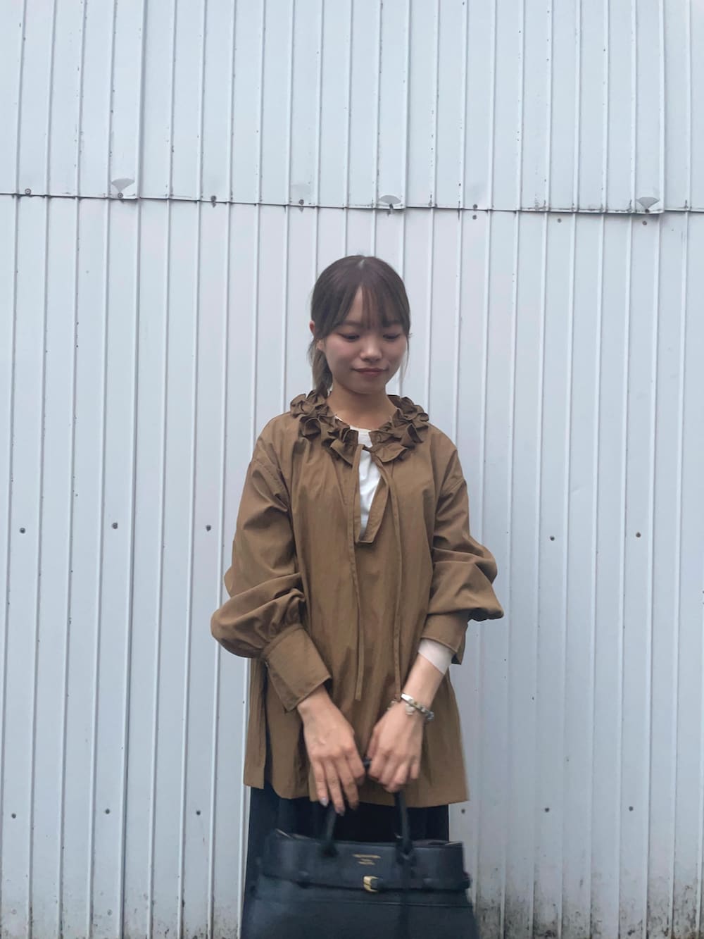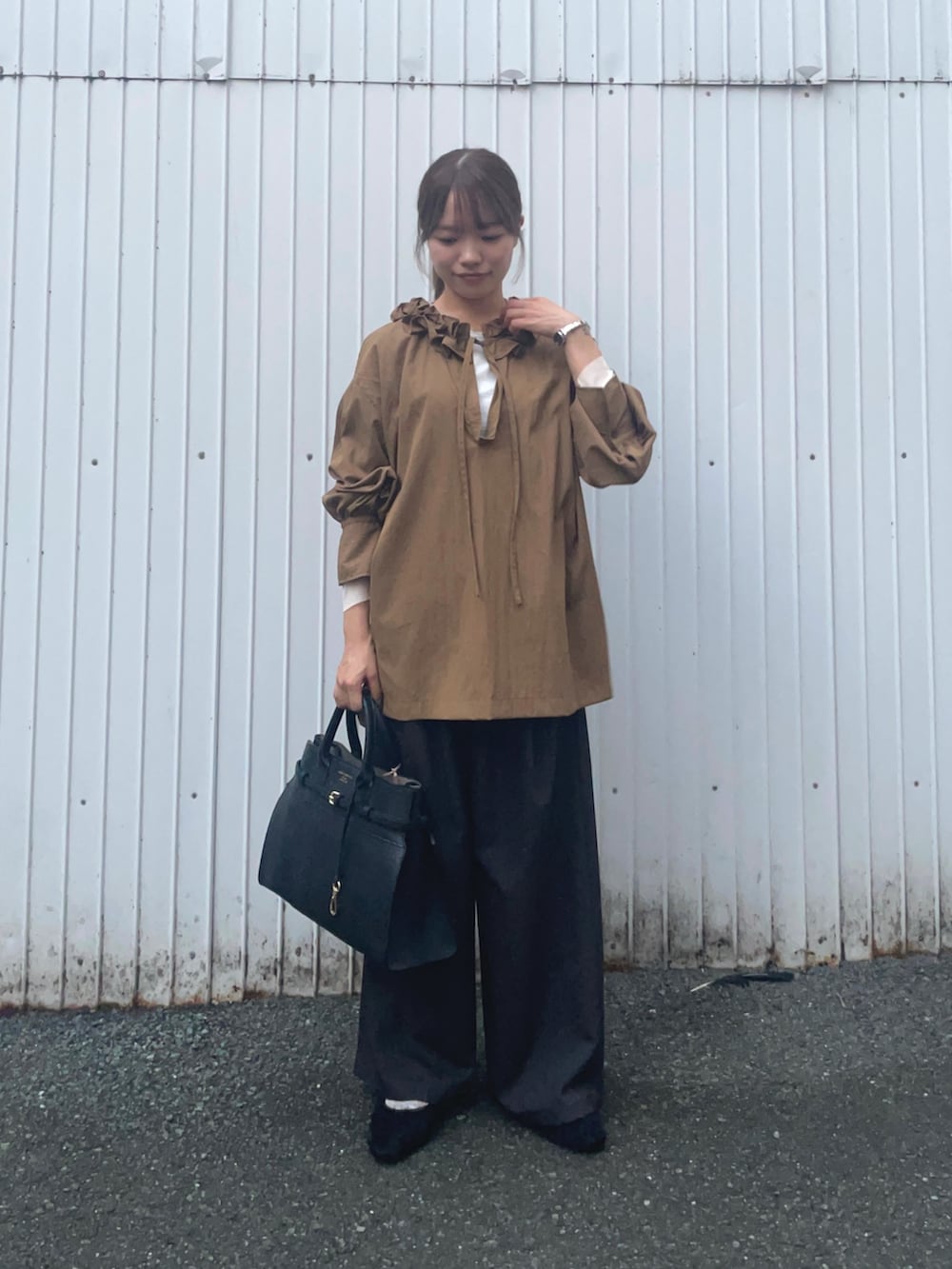 トップスのブラウスは首元にフリルが入ったデザインで、さらりとした軽い素材感です!シンプルなブラウスですが、首元にさりげなくあしらわれたフリルが一気に存在感を出してくれます!