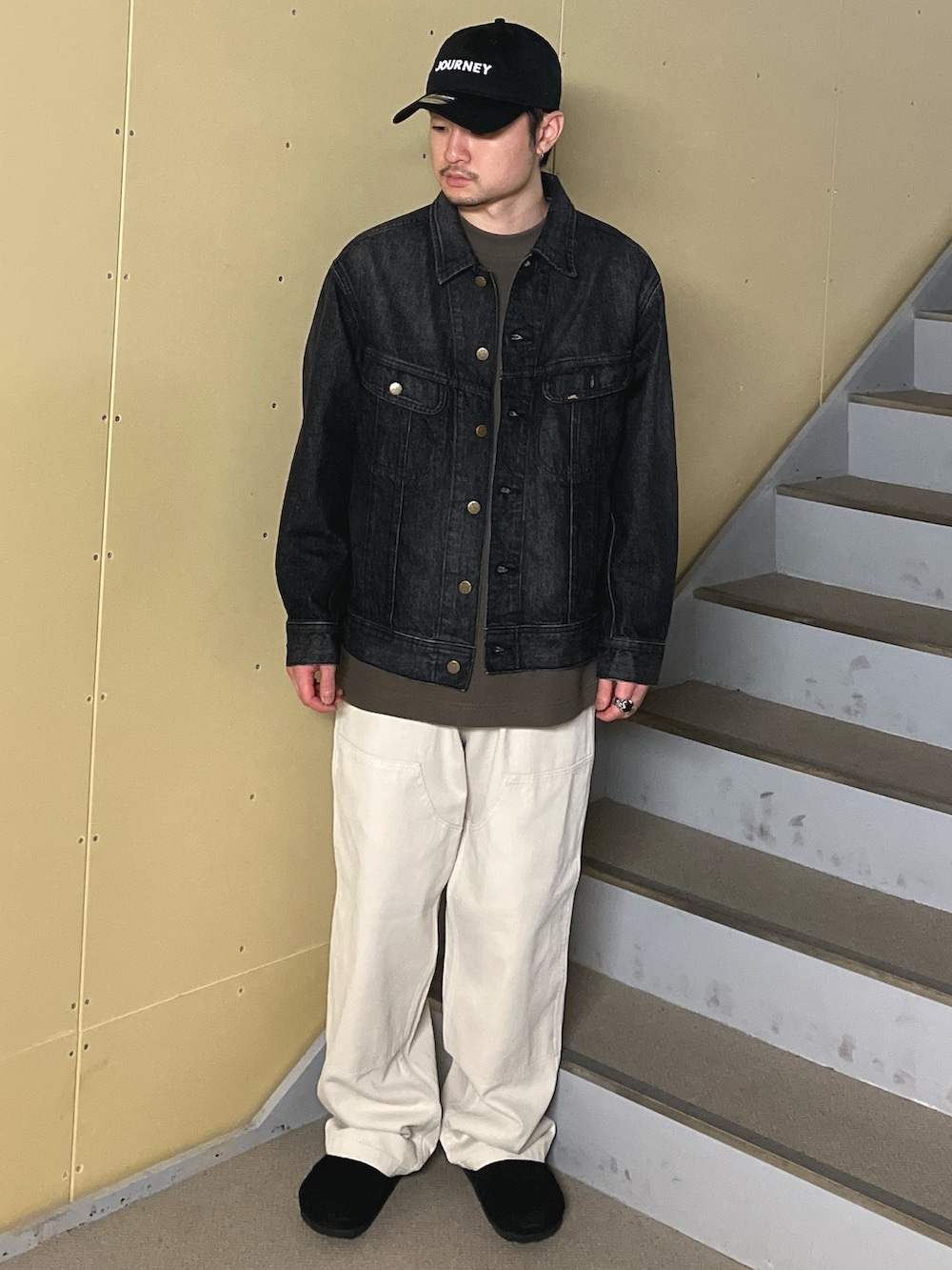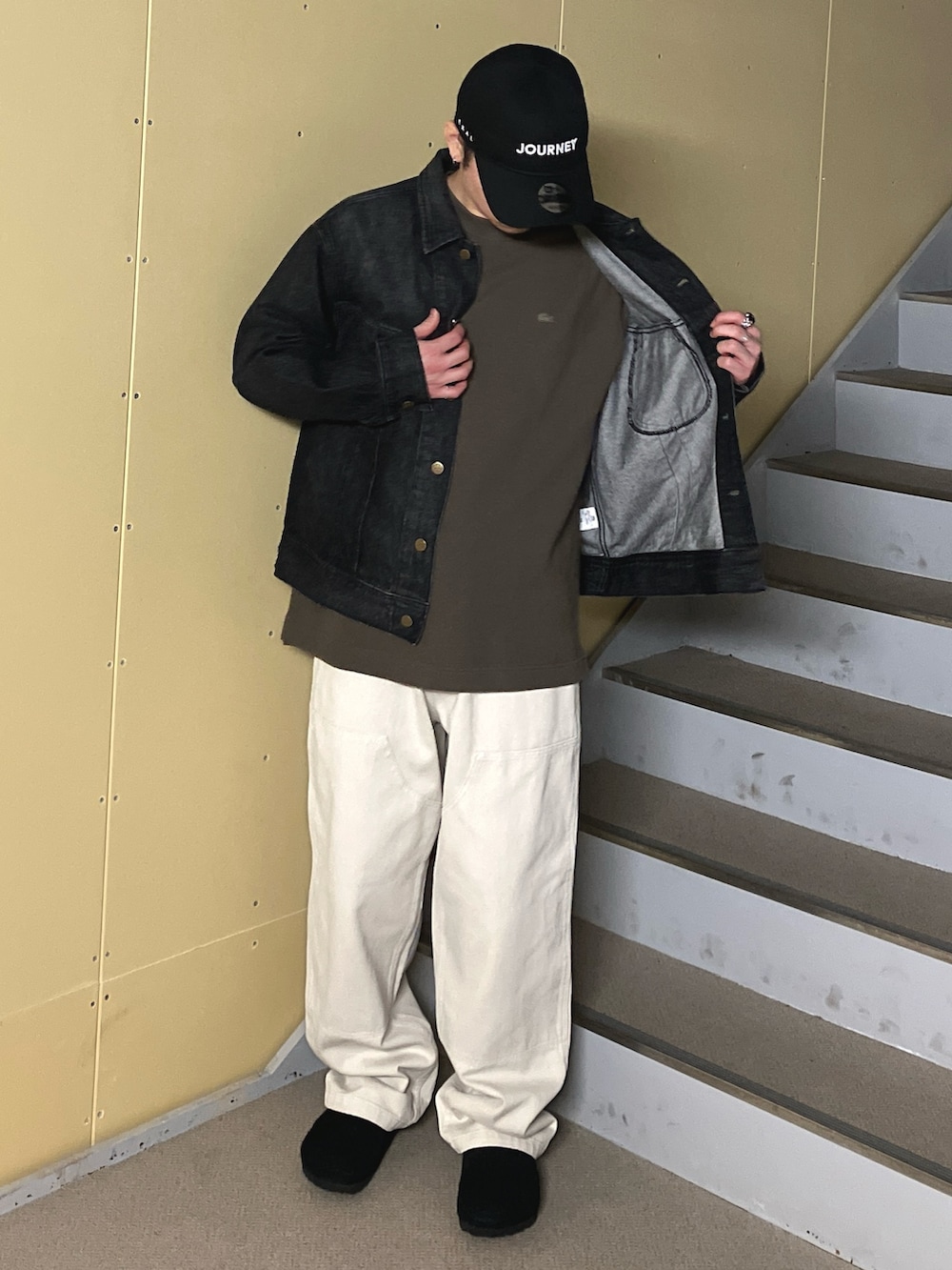 Lee別注×LACOSTE別注のコーデです。LeeはUSEDのカラーを着用しています。LACOSTE別注のロングスリーブは鹿の子素材で着心地良く、ロゴが同色でコーデに馴染みやすいところがポイントです。足元はBIRKENSTOCKです!スウェード素材で柔らかさが出ますね!