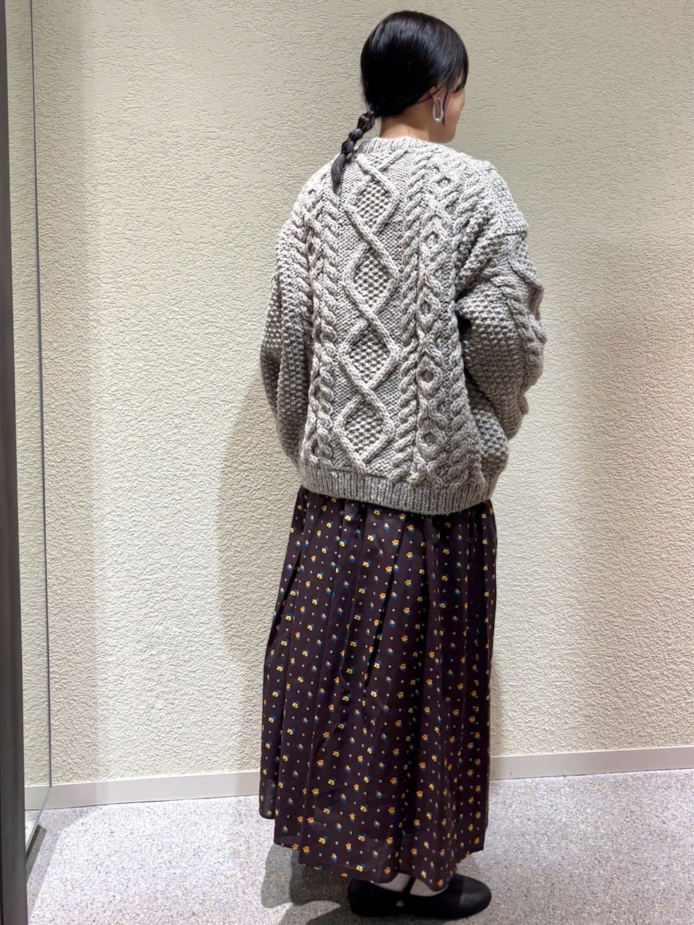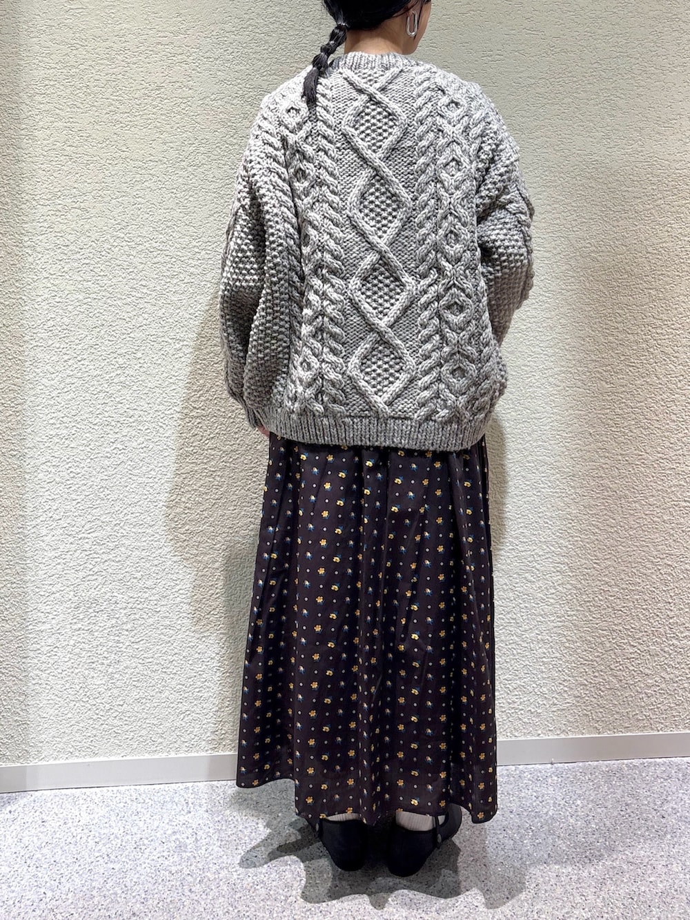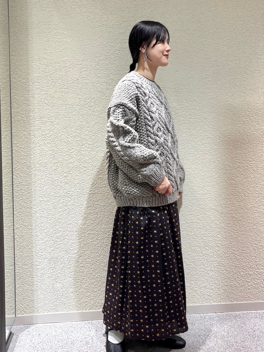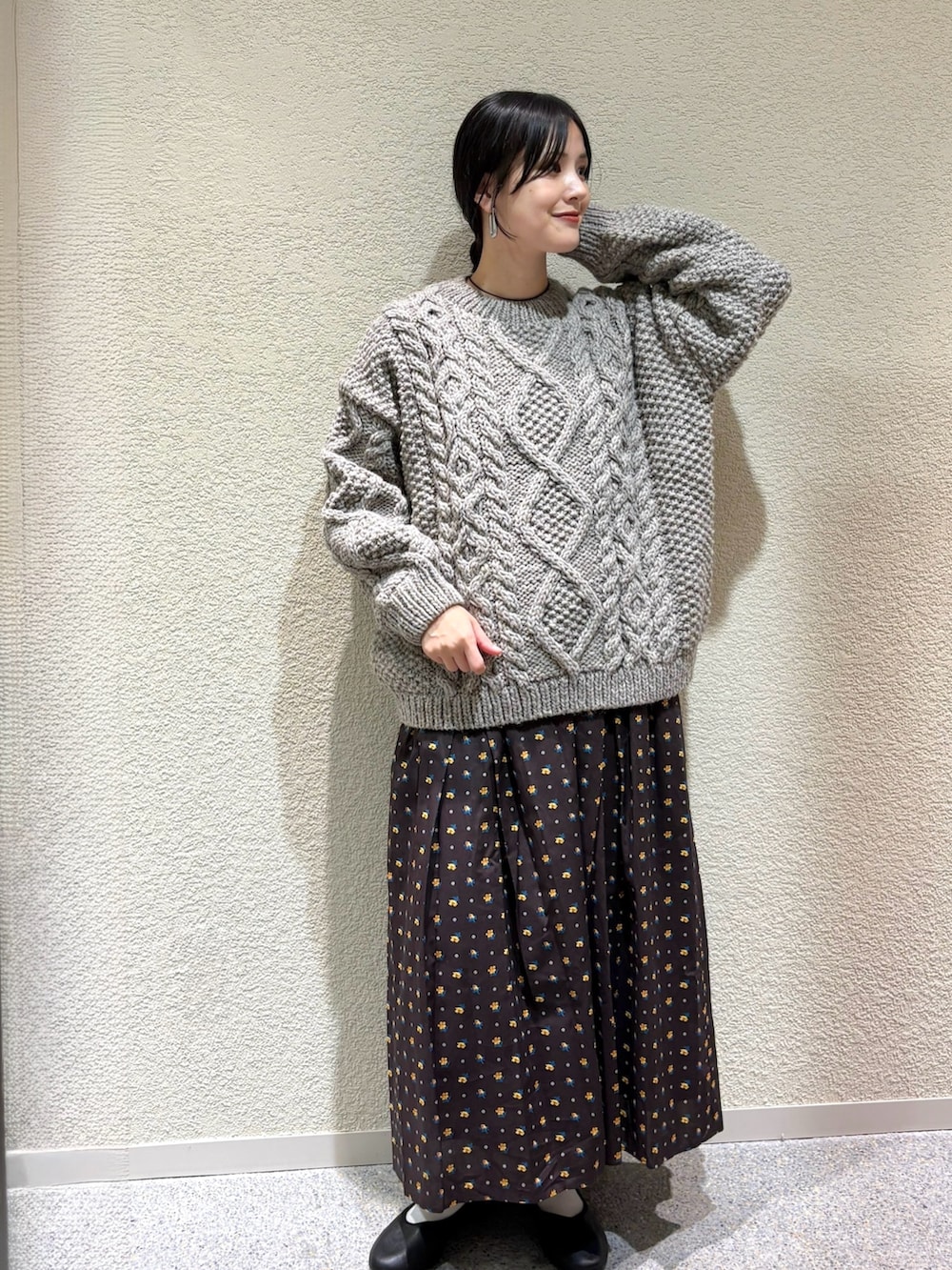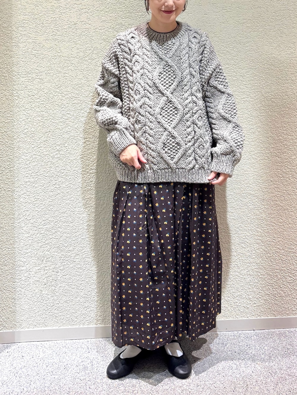 ・ニットの立体感とスカートの繊細な柄が調和した、冬の大人フェミニンスタイル