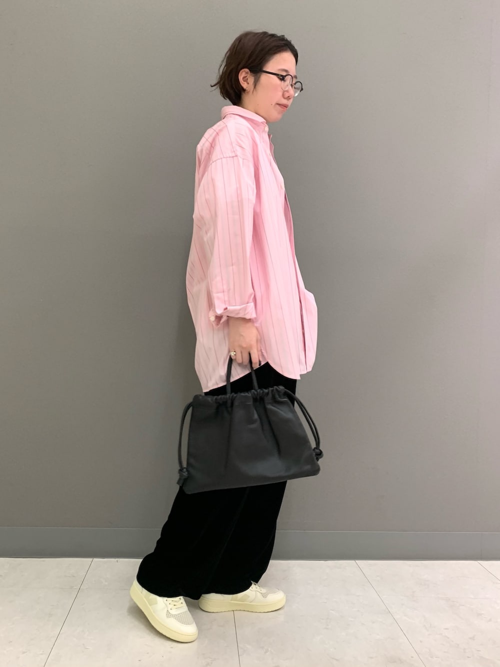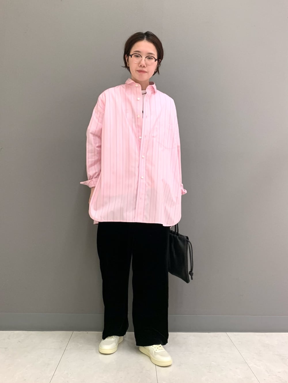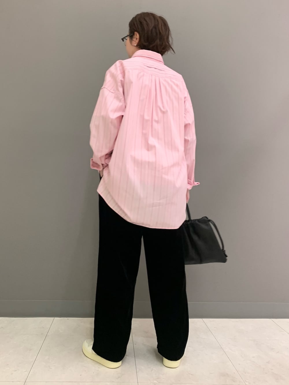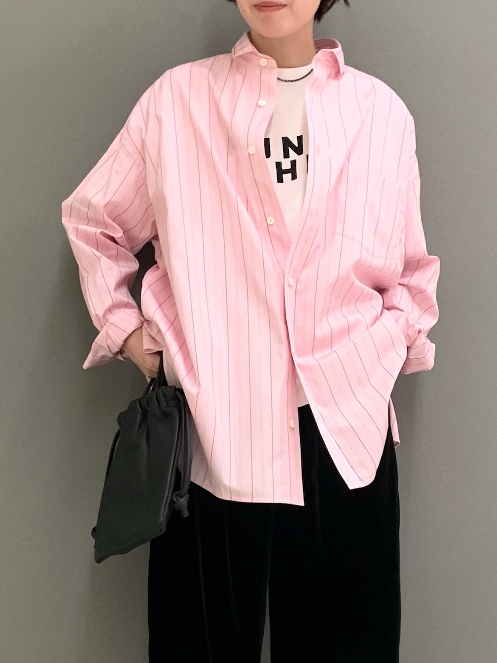 TICCAのメンズライクなオーバーサイズシャツはピンクだと程よく女性らしさもあり素敵。全体的にゆったりですが襟が小さいためカチッと決まり過ぎずに使えます。