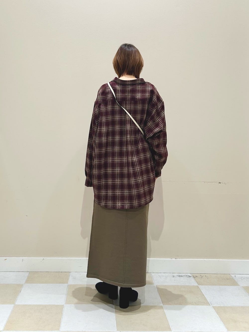 オーバーサイズが可愛いチェックシャツにニットタイトスカートとブーツでカジュアルになりすぎないスタイルに!