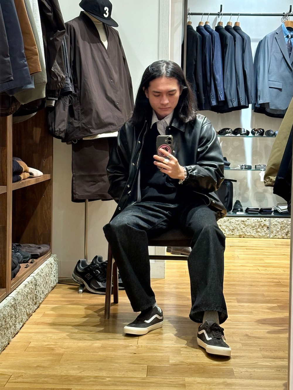 パンツはテーラードのトラウザーを採用し、形と合わせともにレザージャケットの無骨さを柔らかくする効果を狙っています。