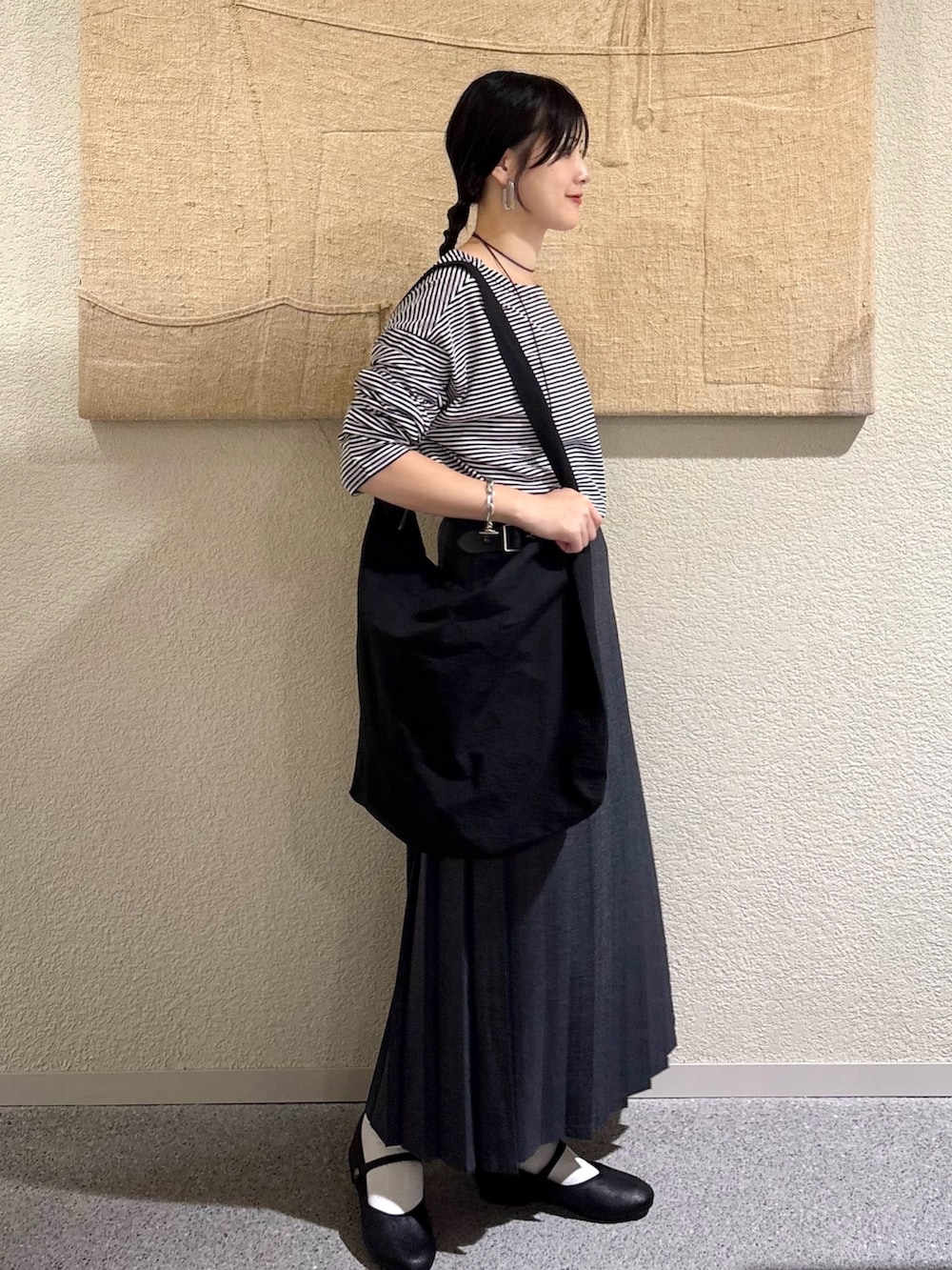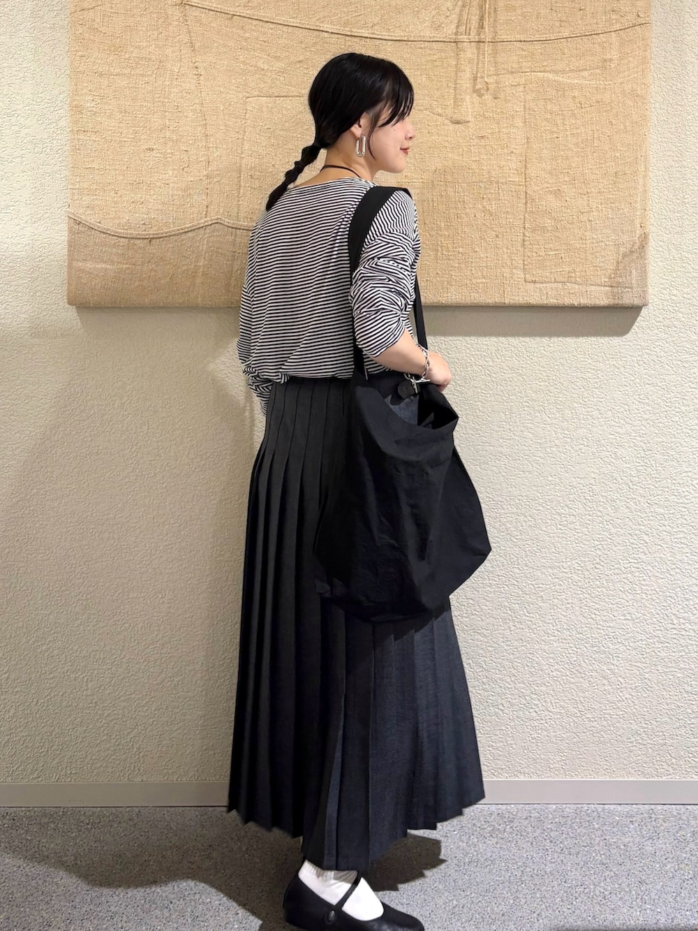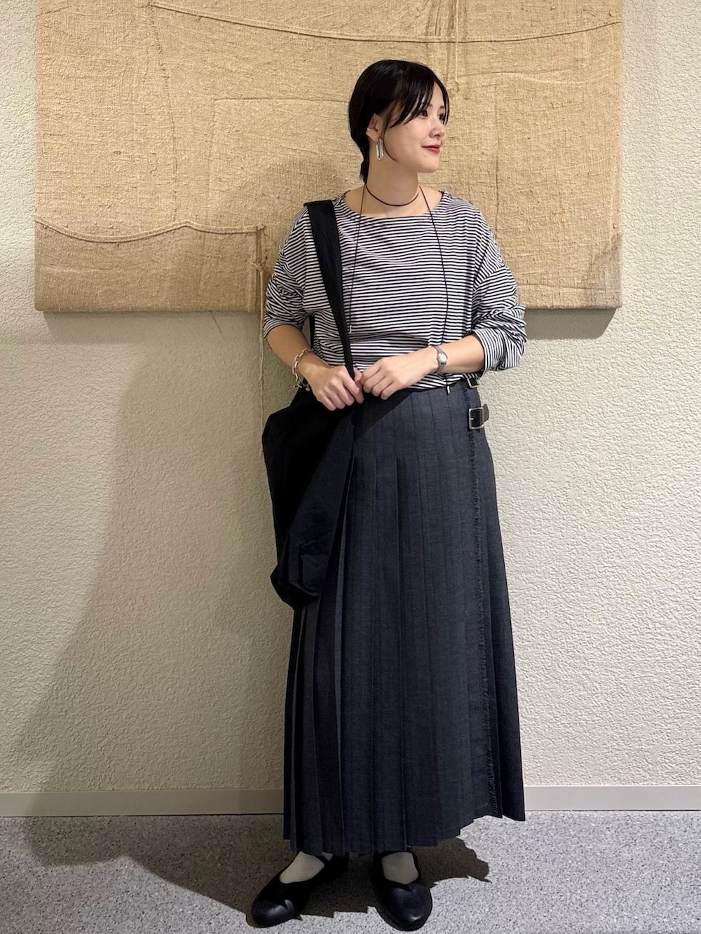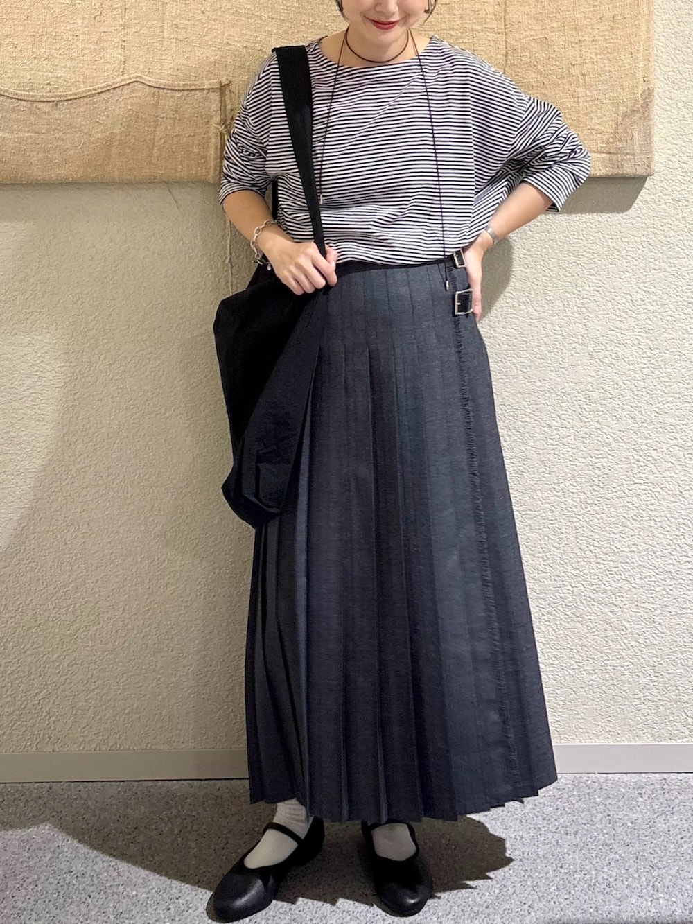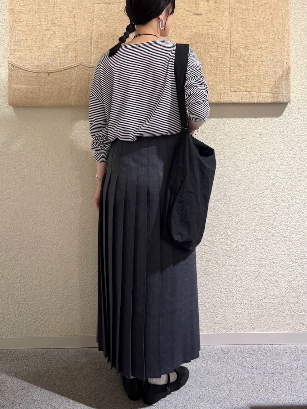 クラシカルな佇まいが魅力のプリーツスカート。グレーの落ち着いた色合いがボーダーと好相性で、上品かつ知的な雰囲気を演出。トップスをインすることで、プリーツの美しい揺れ感が際立ちます。