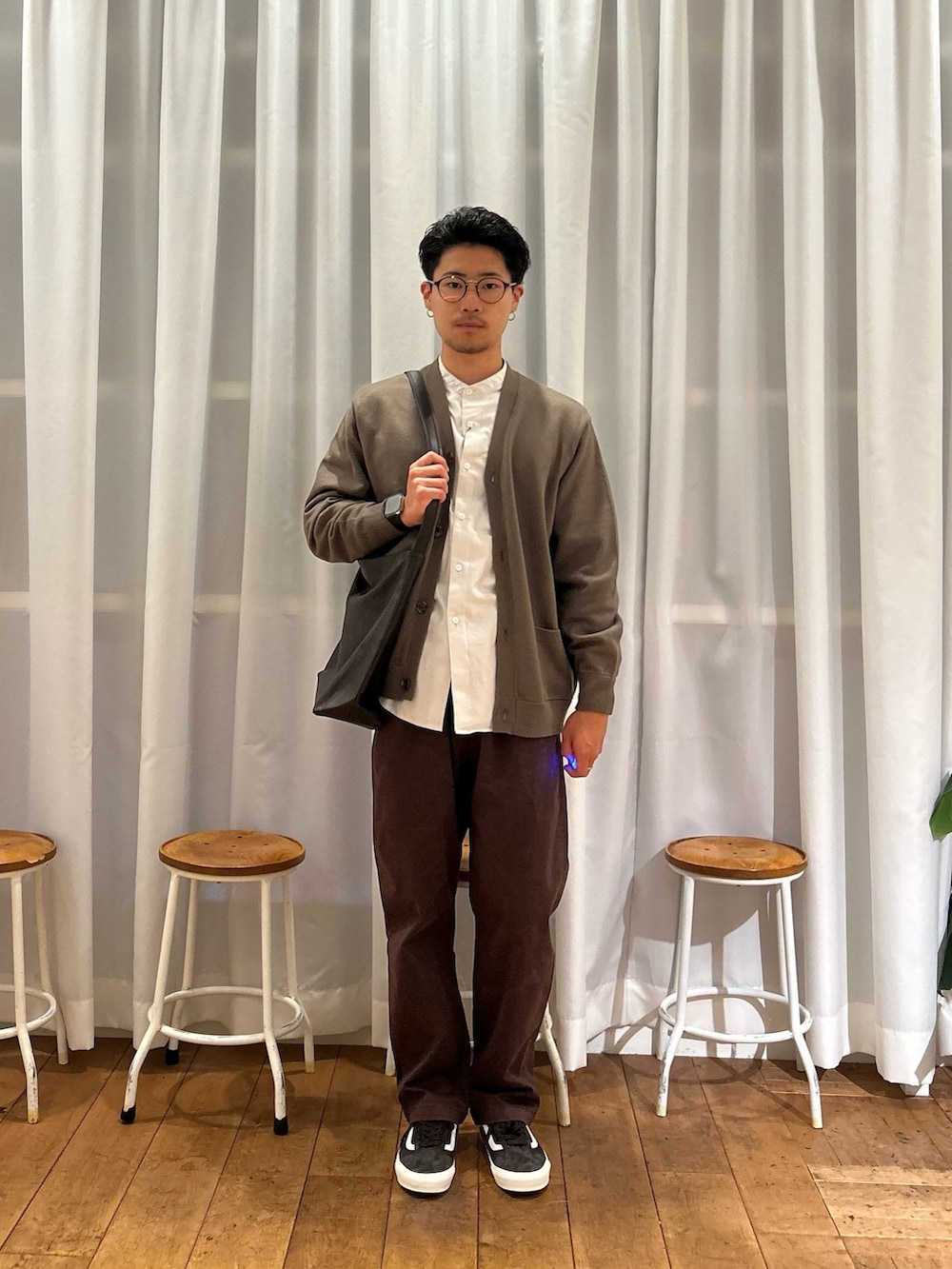 ご覧いただきありがとうございます!今回は毎年定番の200日ニットシリーズのカーディガンにEKALとグラミチ別注のツイルトラウザーを合わせて大人らしく綺麗な雰囲気に。バックもブラウンレザーを使って秋らしく、シューズはvansを使ってコーデに外しを入れてます!