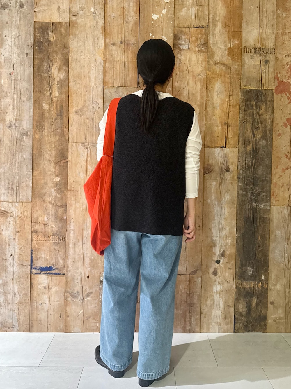 差し色に赤のコットンバッグが