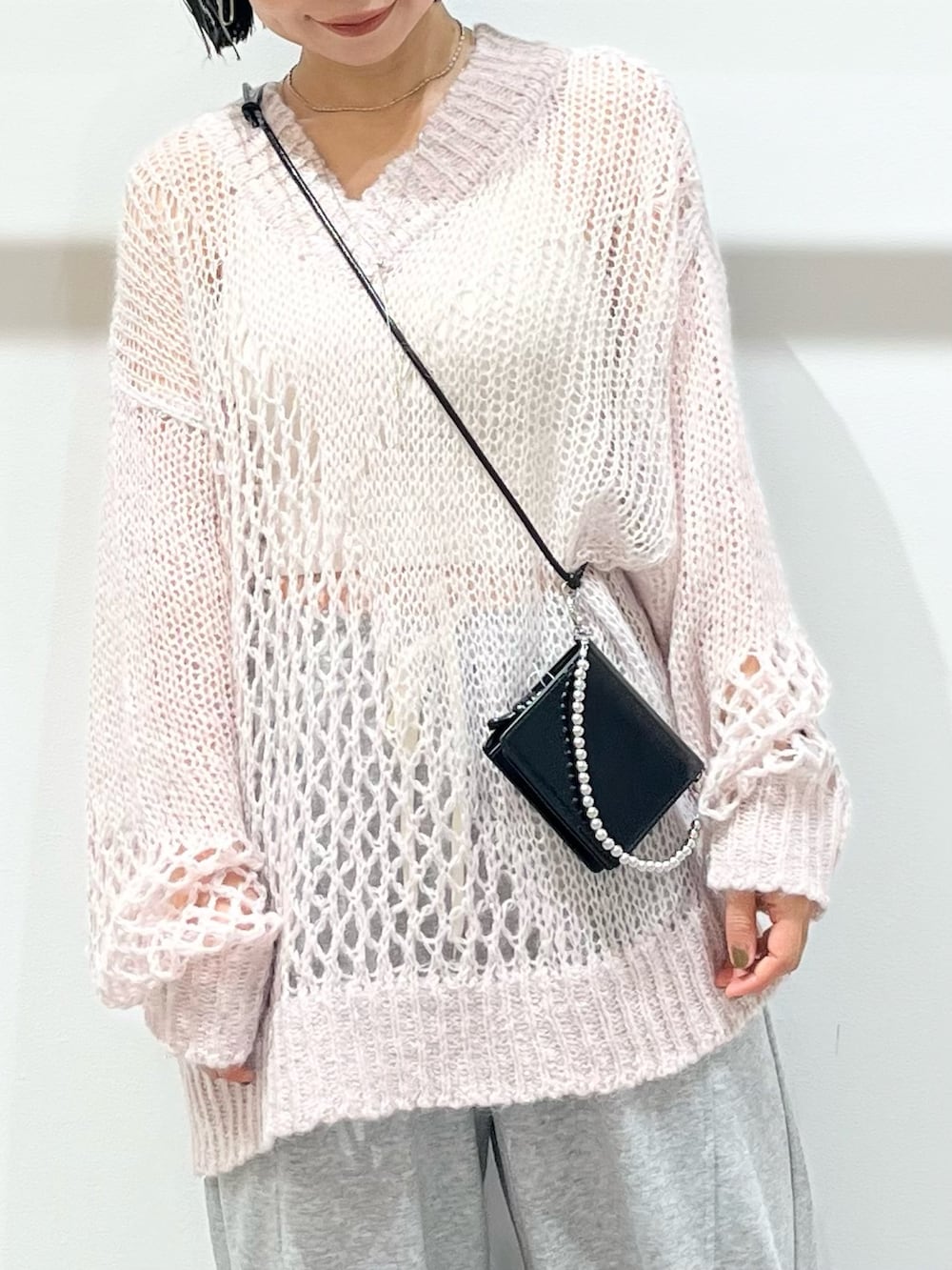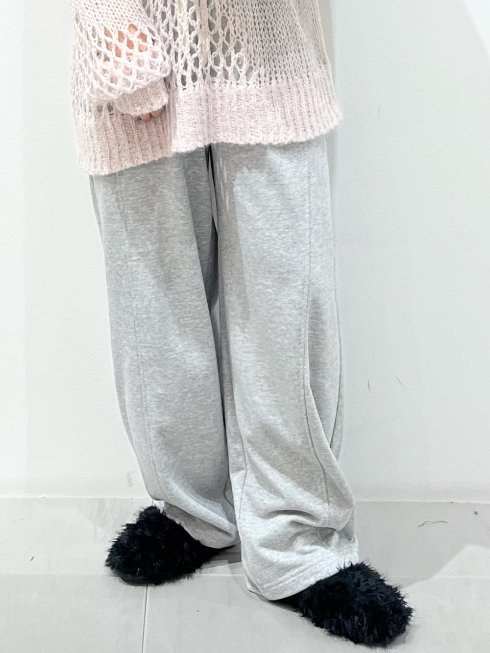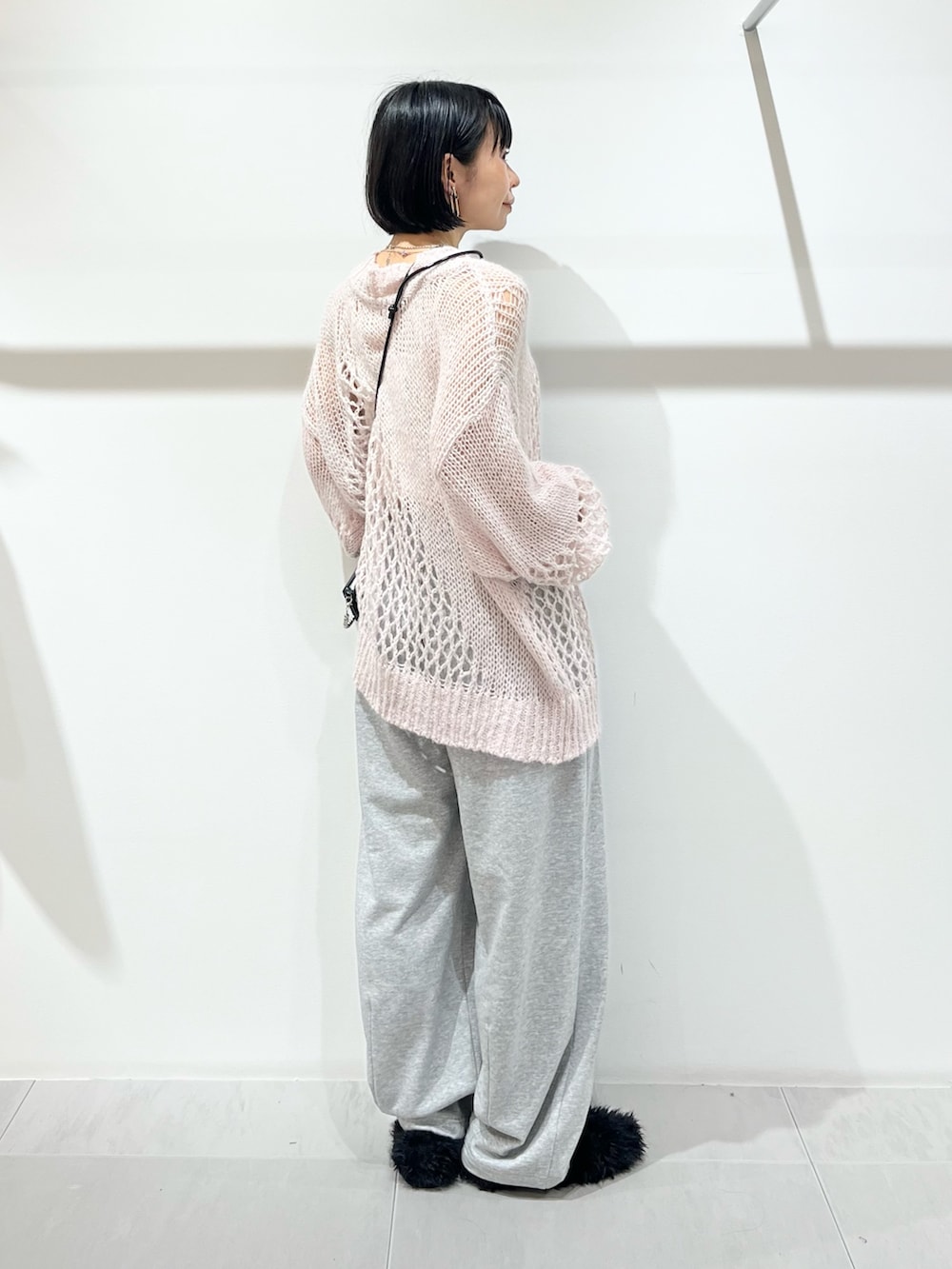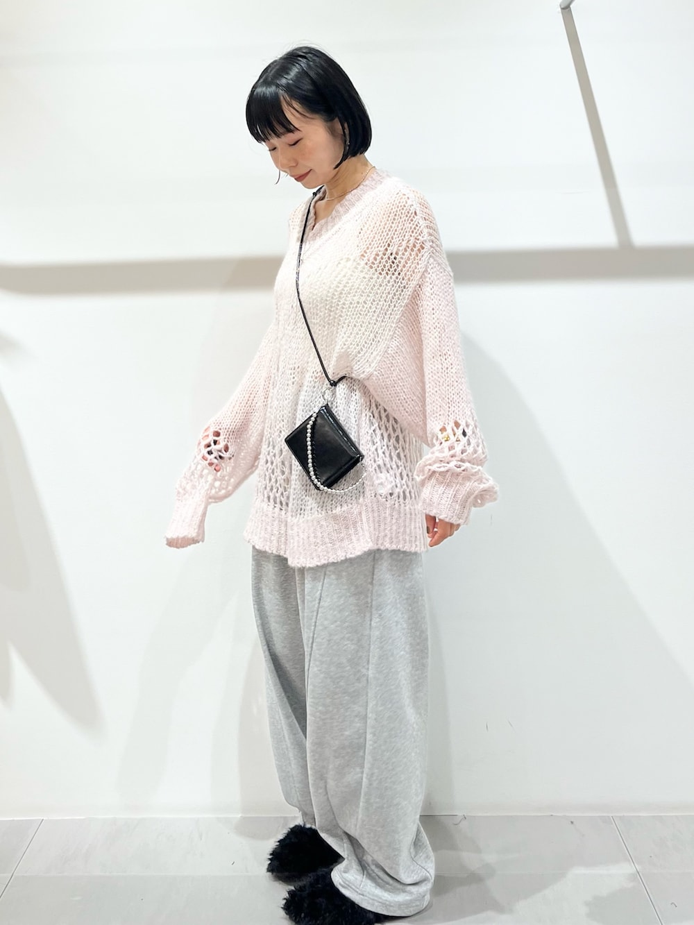 リラックスしたいとき、ストレスフリーなコーデです。ピンクのニットはきらきらしていて華やかです!