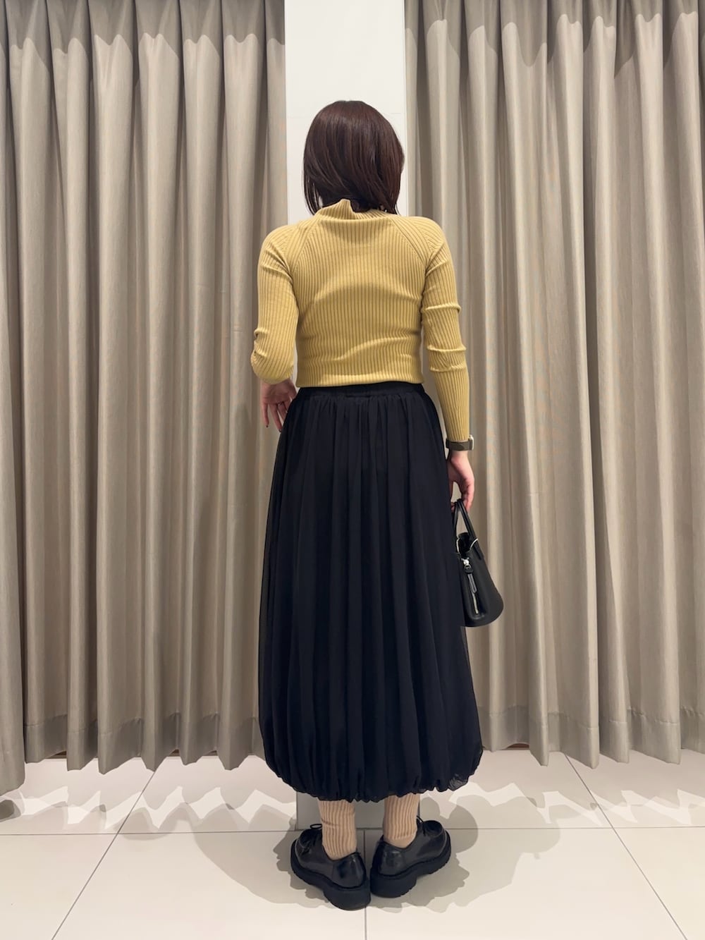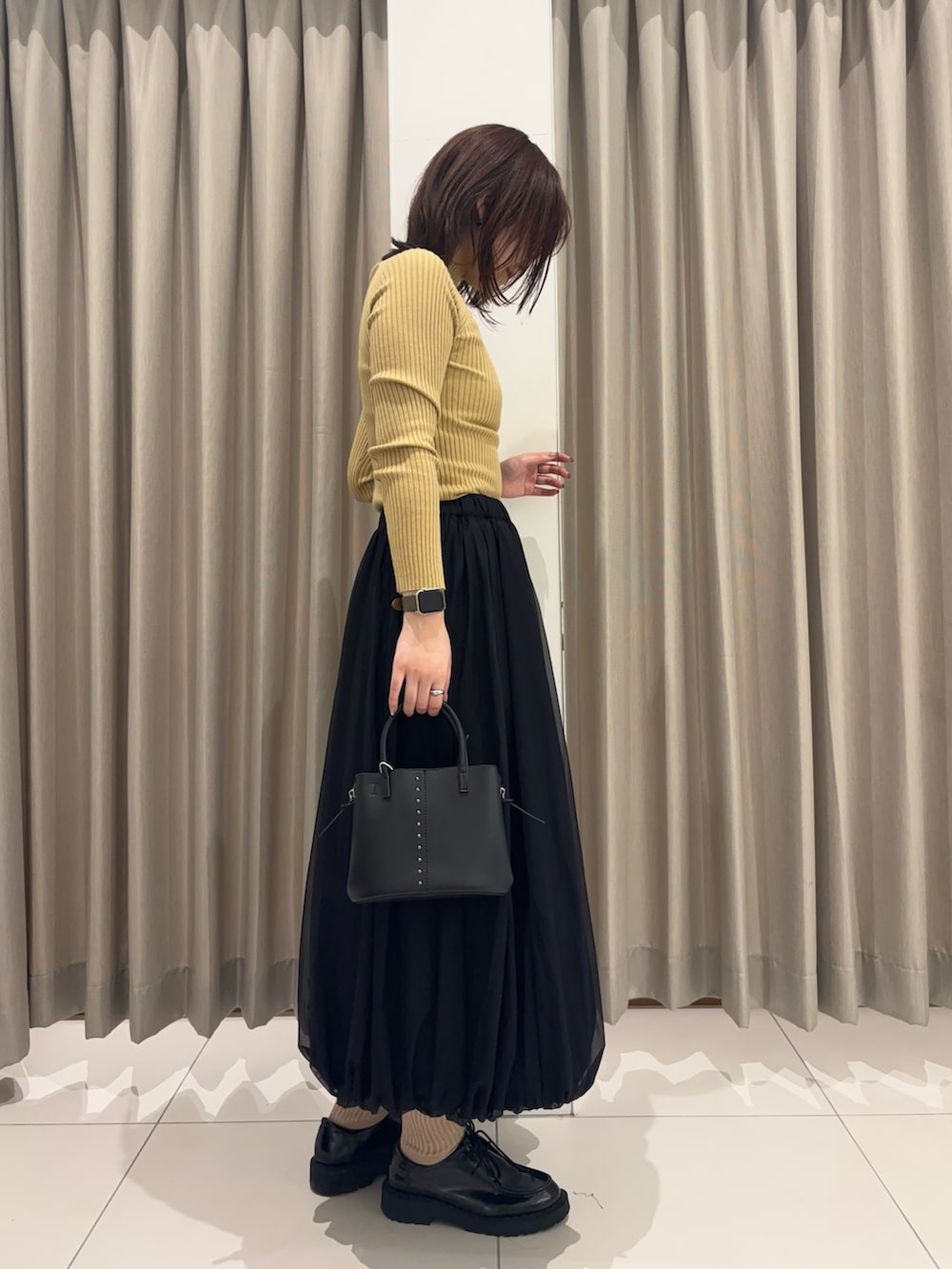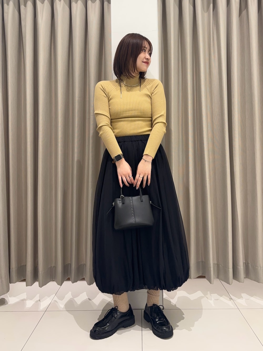 チュールのバルーンスカートと合わせて、小物もブラックでまとめればちょっぴりモードな印象に。