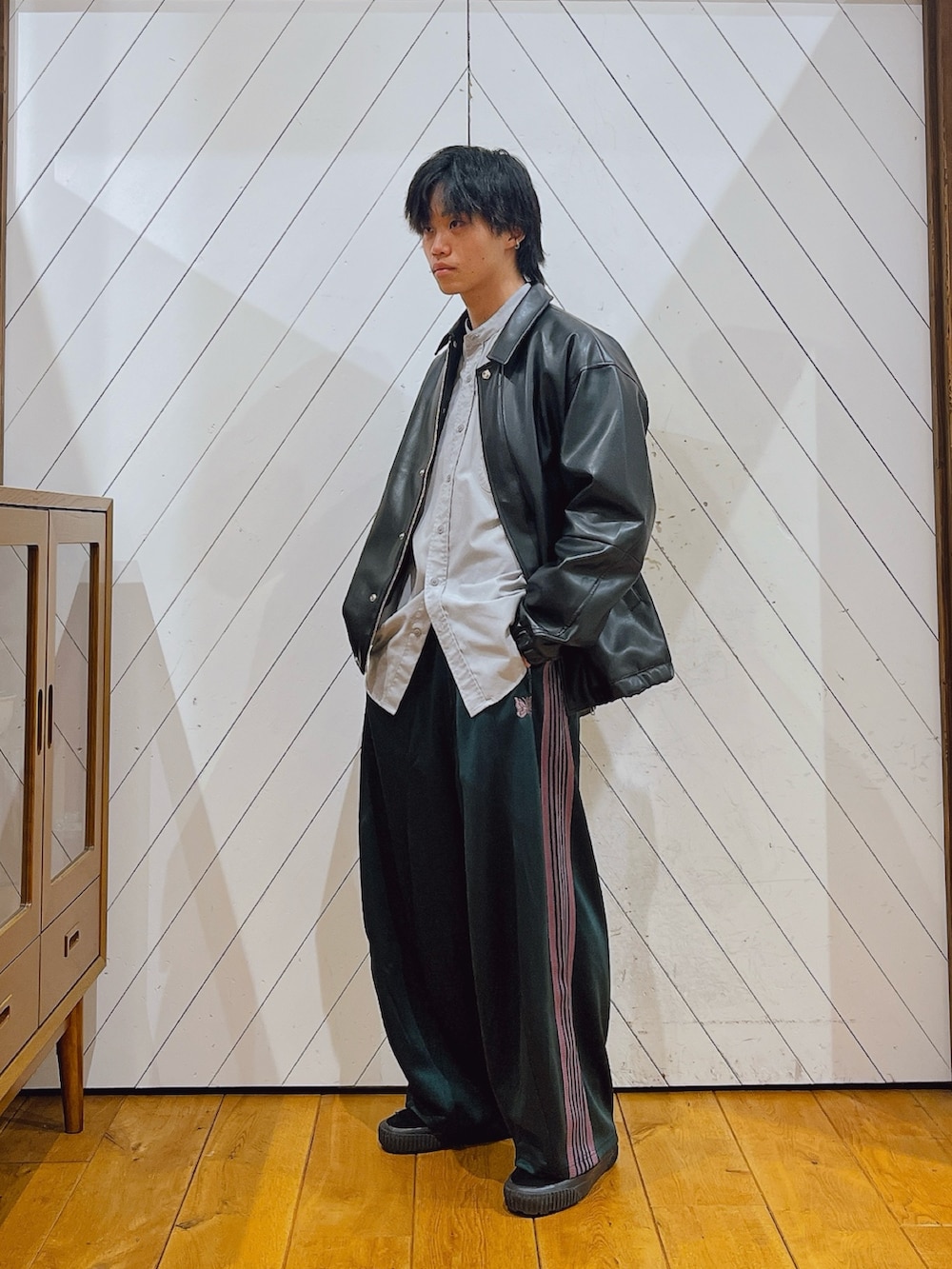 シャツとレザーのカッチリした印象を和らげる役目は全てトラックパンツに任せています。
