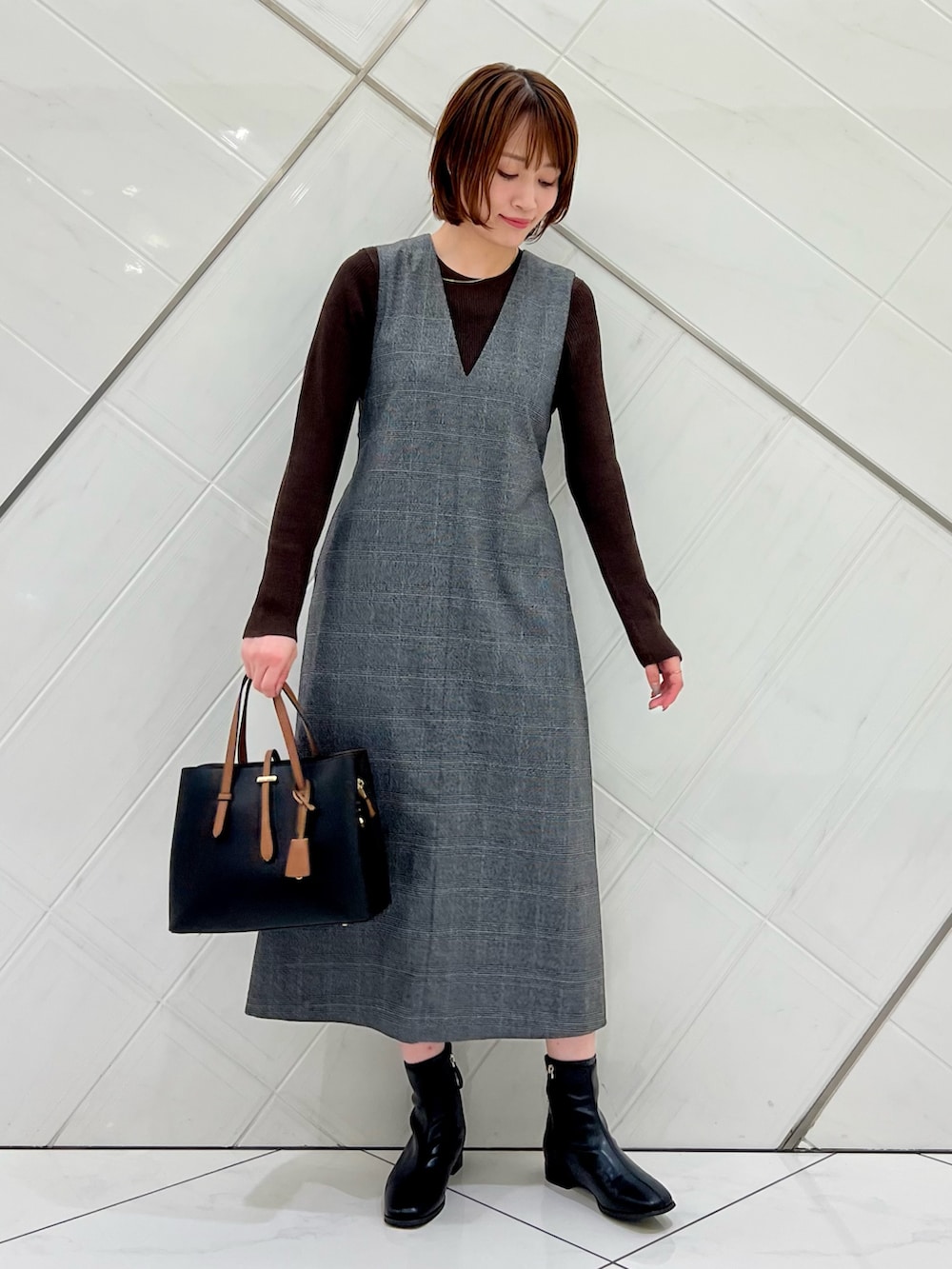 毎年人気のジャンパースカートはVネックの襟元