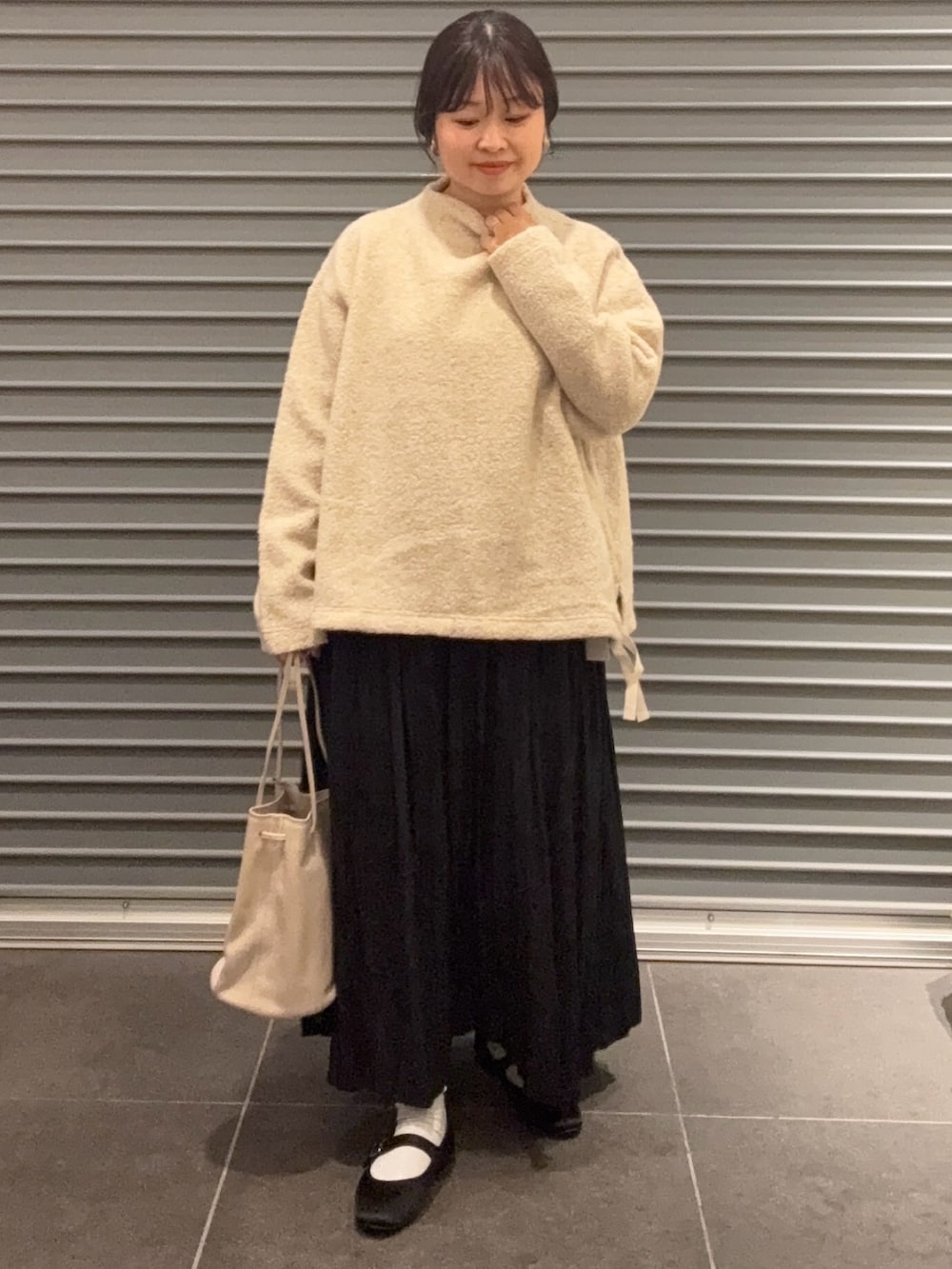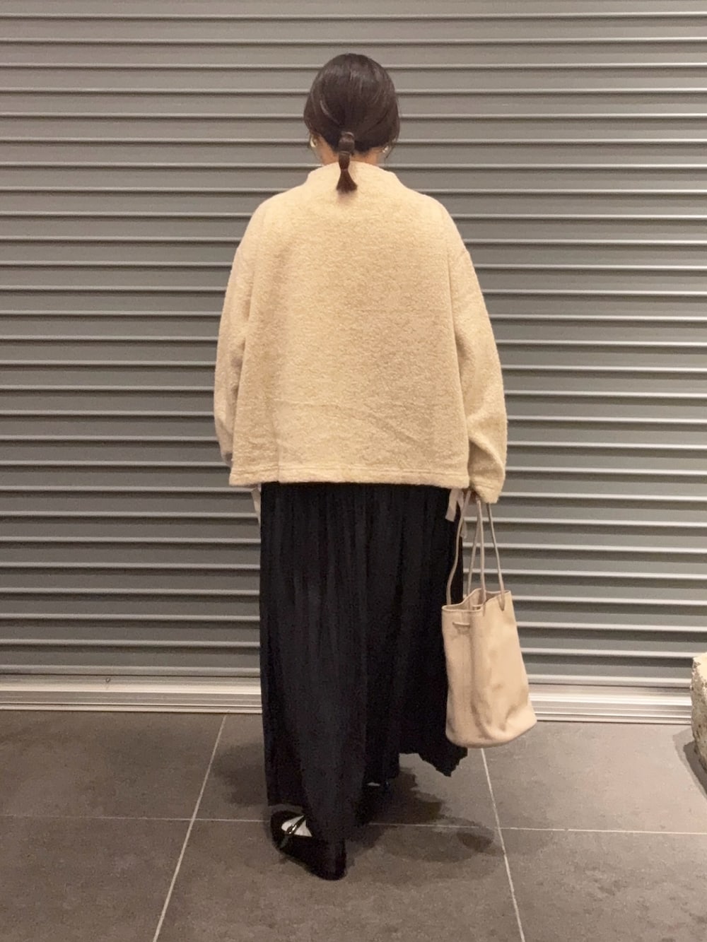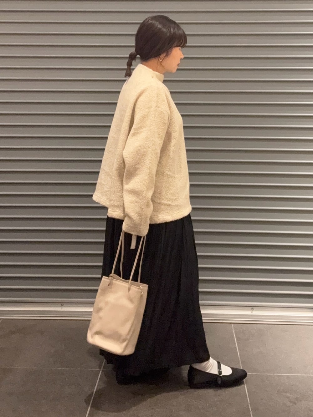 トップスに少しボリュームがある素材を持ってきたので、ボトムスはプリーツスカートにしました。