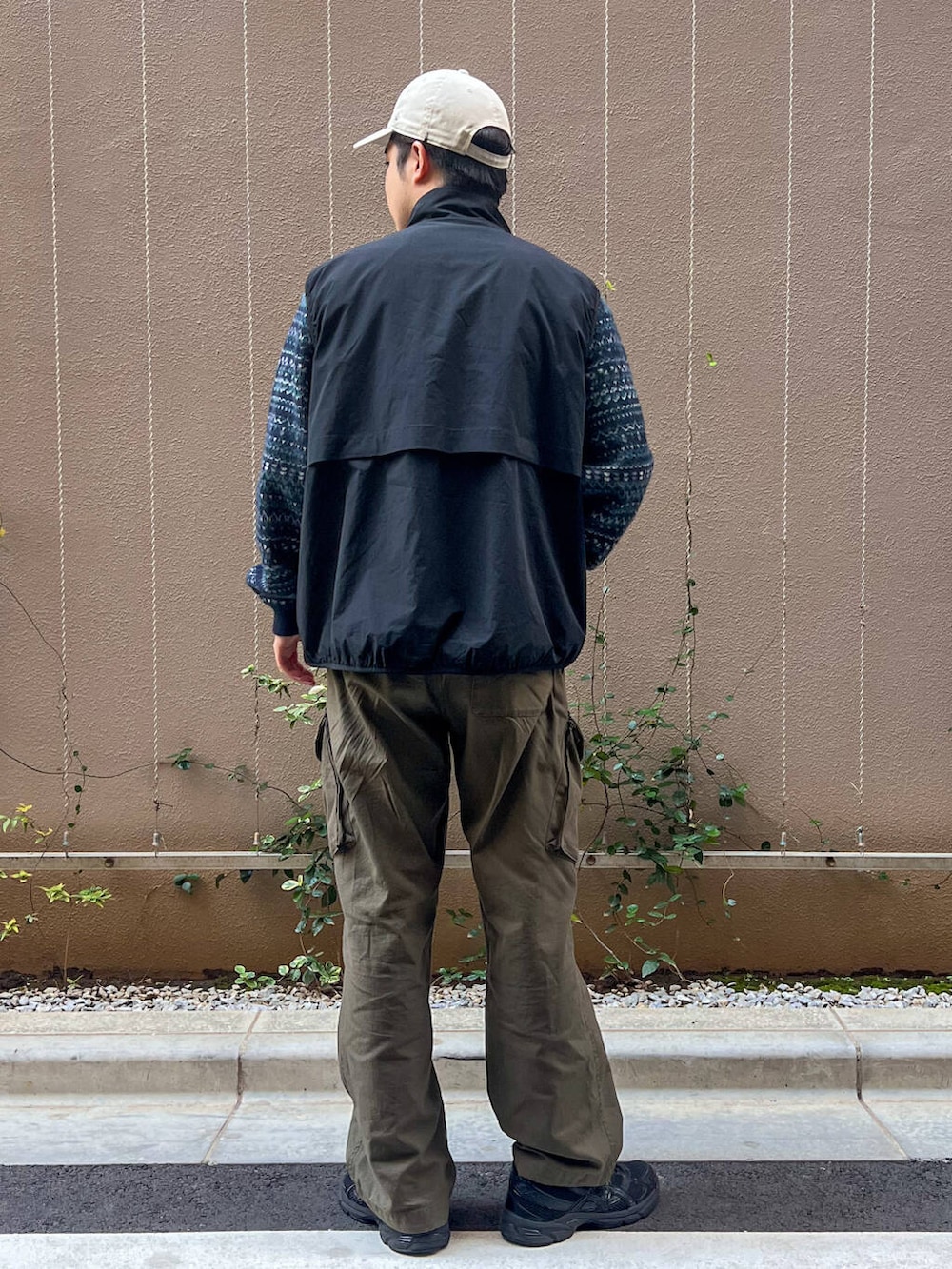 柄ニットをアクセントにアウトドアコーデ!