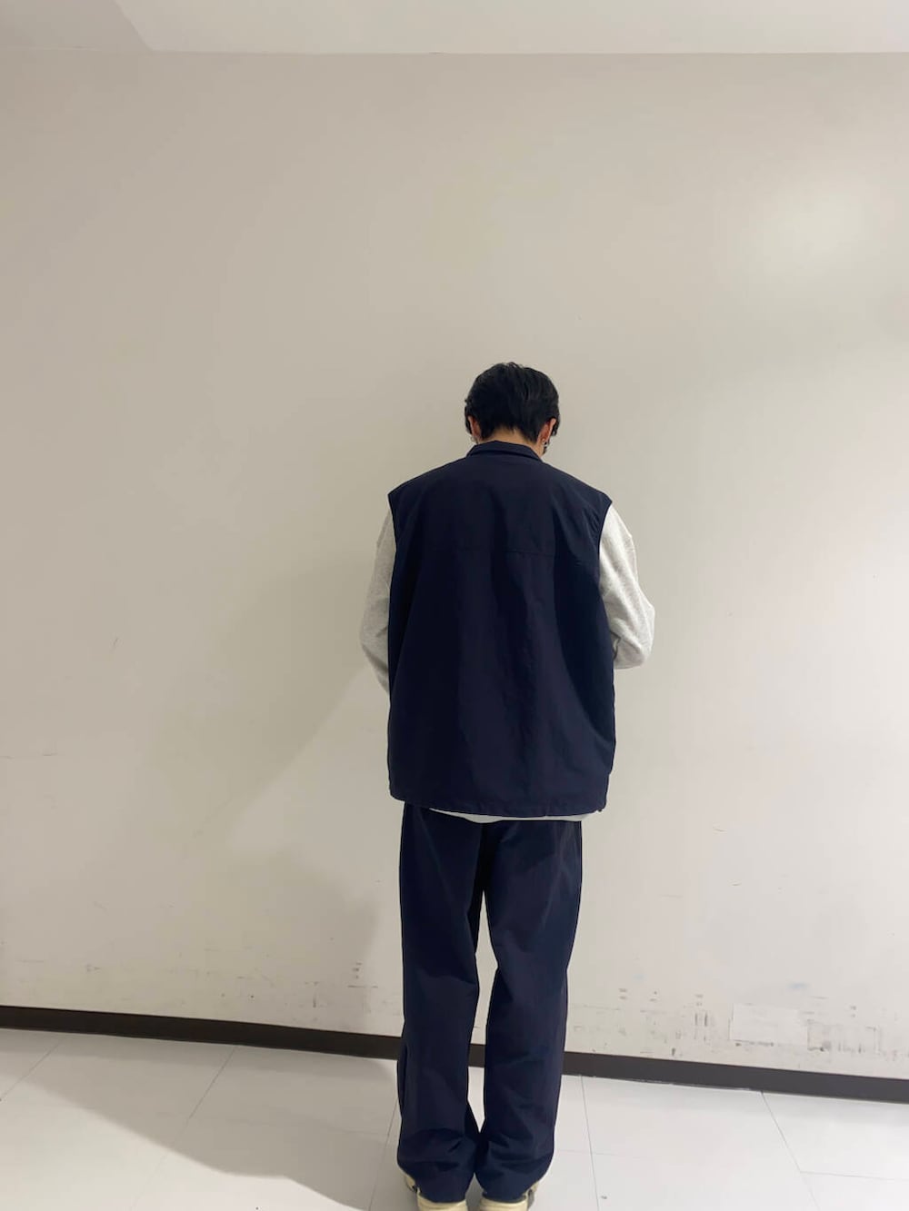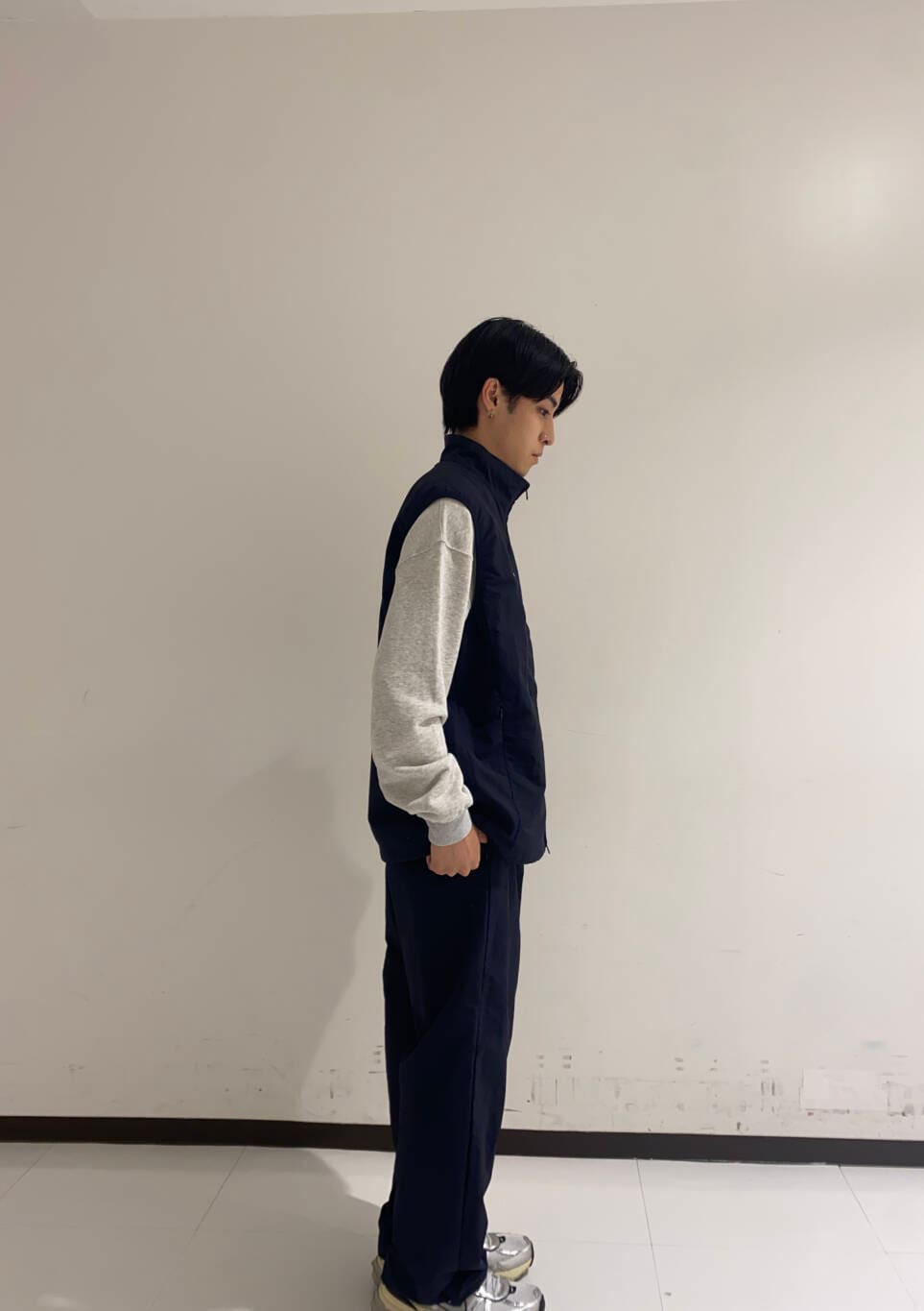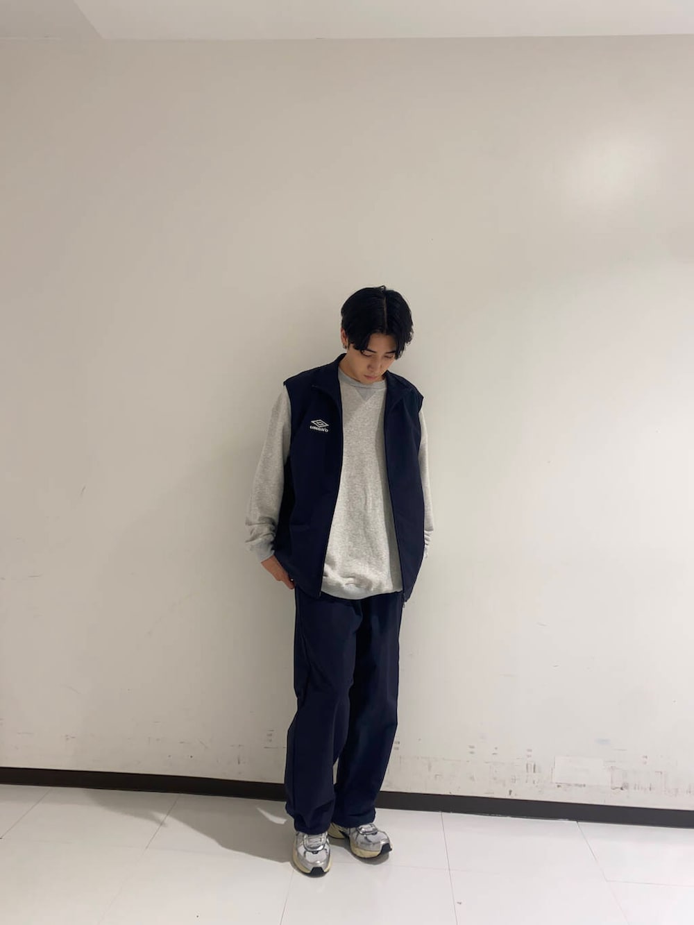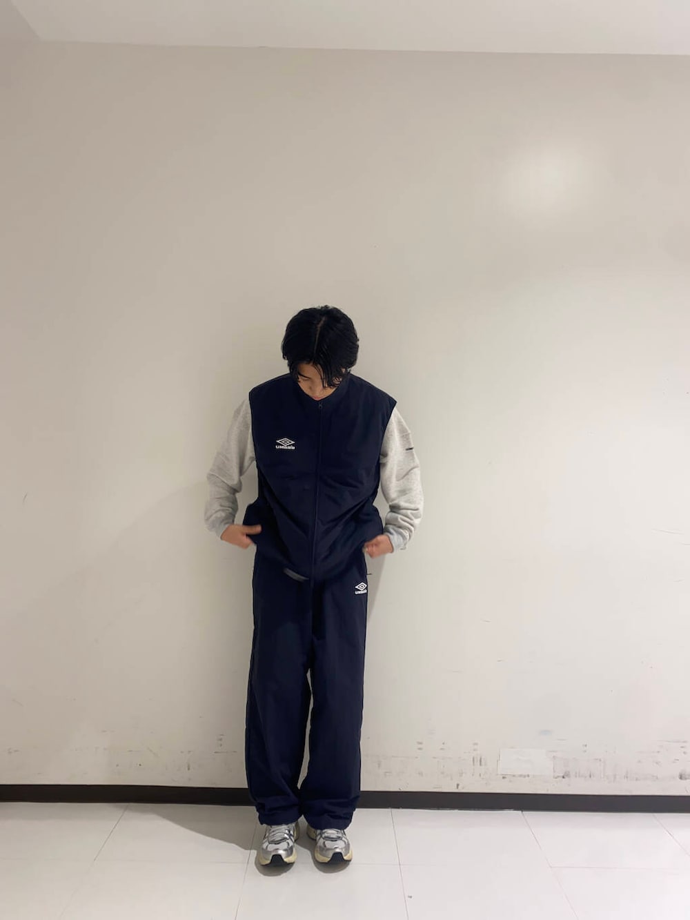 今回きたのはナイロンでできたトラックベストとトラックパンツのセットアップです。インナーにはUMBROのスウェットを着用してます!