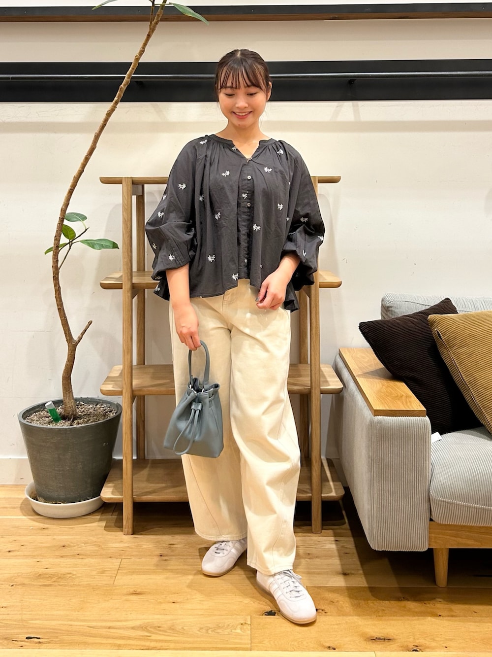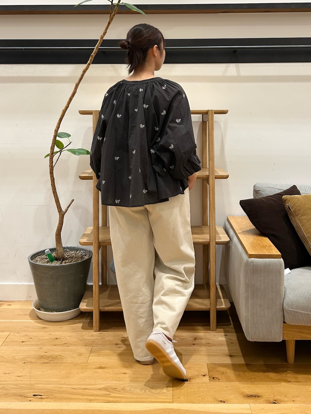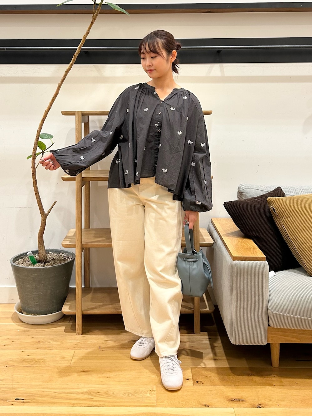 シルバーの刺繍とフレアシルエットがかわいいブラウスは、軽やかな綿生地で、湿気も気温も落ち着いてきた時期にぴったりです。袖口にゴムが通っているので、袖を捲って抜け感プラスしやすいのもポイントです。